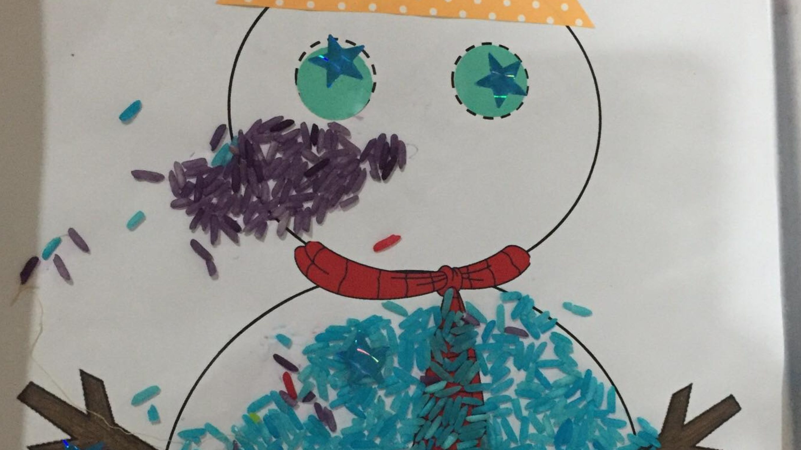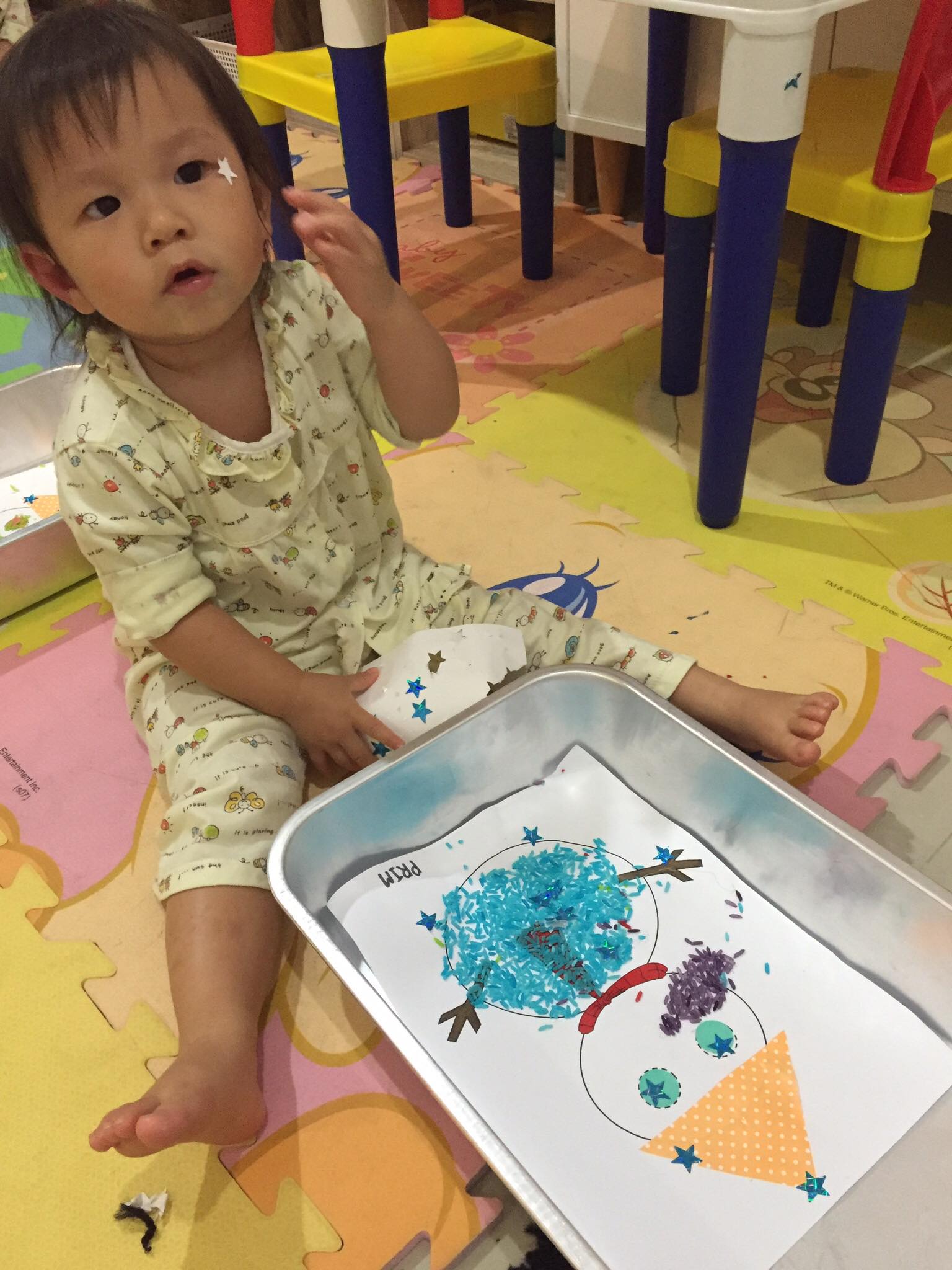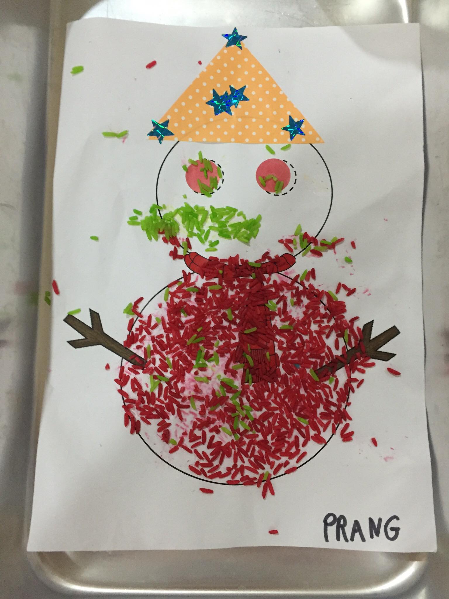 ให้ตัดแปะกระดาษรูปทรงต่างๆพร้อมทั้งตกแต่งด้วยข้าวสารสี ทากาวบริเวณที่ต้องการทำแล้วให้โรยด้วยข้าวสารสีค่ะ รูปนี้เล่นตอน 1 ขวบ 7 เดือนค่ะ