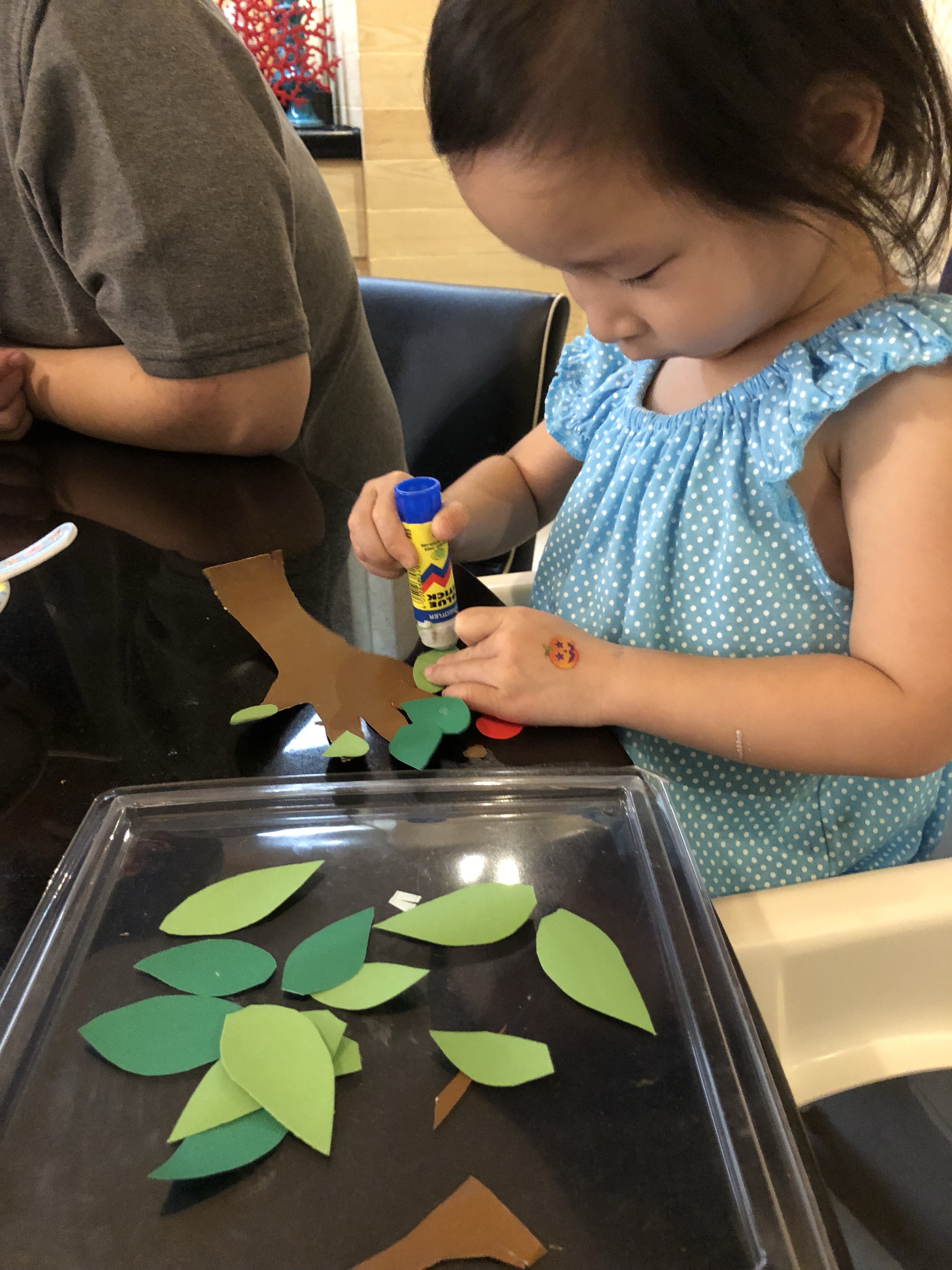 งานนี้หอบหิ้วมาทำที่ร้านอาหาร เป็นกิจกรรมระหว่างรอทานข้าว คุณแม่เตรียมจัดใส่กล่อง เตรียมกระดาษสีเขียวอ่อน เขียวเข้ม กาว กรรไกรลงกล่อง แต่พอเด็กๆรู้ว่าเตรียมให้ขอเล่นตั้งแต่อยู่ในรถเลยค่ะ