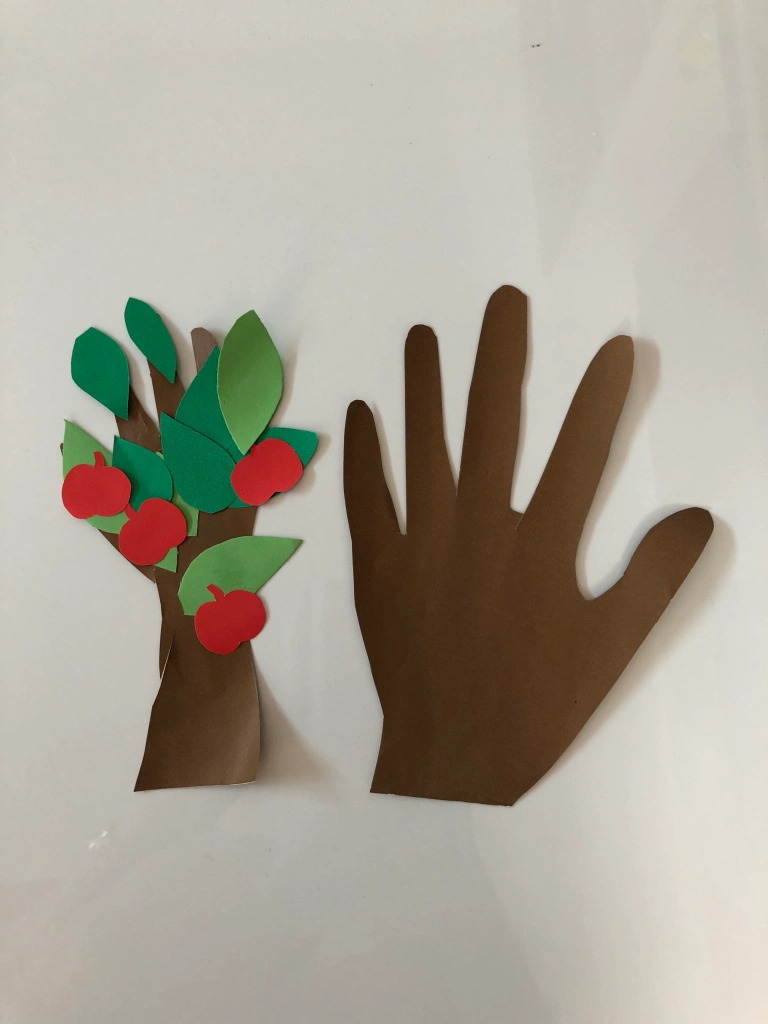 เริ่มทำตั้งแต่ลอกลายรูปมือบนกระดาษสีน้ำตาลเป็นต้นไม้ ติดใบไม้ ติดลูกแอปเปิ้ล สนุกกันมากเลยค่ะ