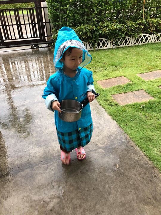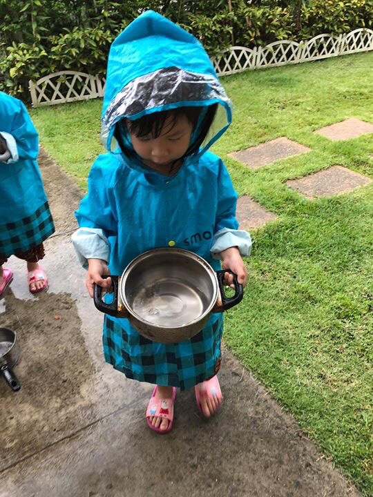 วันนี้(ผ่านมาหลายวันแล้วค่ะ) เรียนเรื่องน้ำฝน ใส่เสื้อกันฝนก่อน แล้วให้ถือหม้อไปรองน้ำฝนค่ะ ฟังเสียงน้ำฝนกระทบหม้อ มองดูน้ำหล่นมาจากบนท้องฟ้า จับน้ำฝน จริงๆวันนี้ฝนตกหนักเม็ดใหญ่มาก ตอนแรกคิดว่าครึ่งหม้อแต่ดูแล้วเอาแค่ 1/4 หม้อก็พอ อย่าให้สนุกเพลินนะคะ