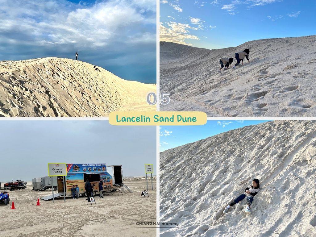 ไฮไลท์ของทริปนี้คือการแวะเล่น Sandboard ที่ Lancelin ที่นี่เป็นภูเขาทะเลทรายสีขาวกว้างไกลสุดลูกหูลูกตา เราเลื่อนมาเที่ยวที่สุดท้ายเพราะหวังว่าฝนจะหยุดตก และมันก็หยุดตกจริงๆค่ะ!!! แต่รถ ATV เช่า เครื่องเล่นเก็บกลับบ้านกันหมด อดเล่นแต่อย่างน้อยเด็กๆก็ได้กลิ้งเกลือกลงในทะเลทรายสนุกสนาน สนุกสมใจกับไฮไลท์ของทริปนี้