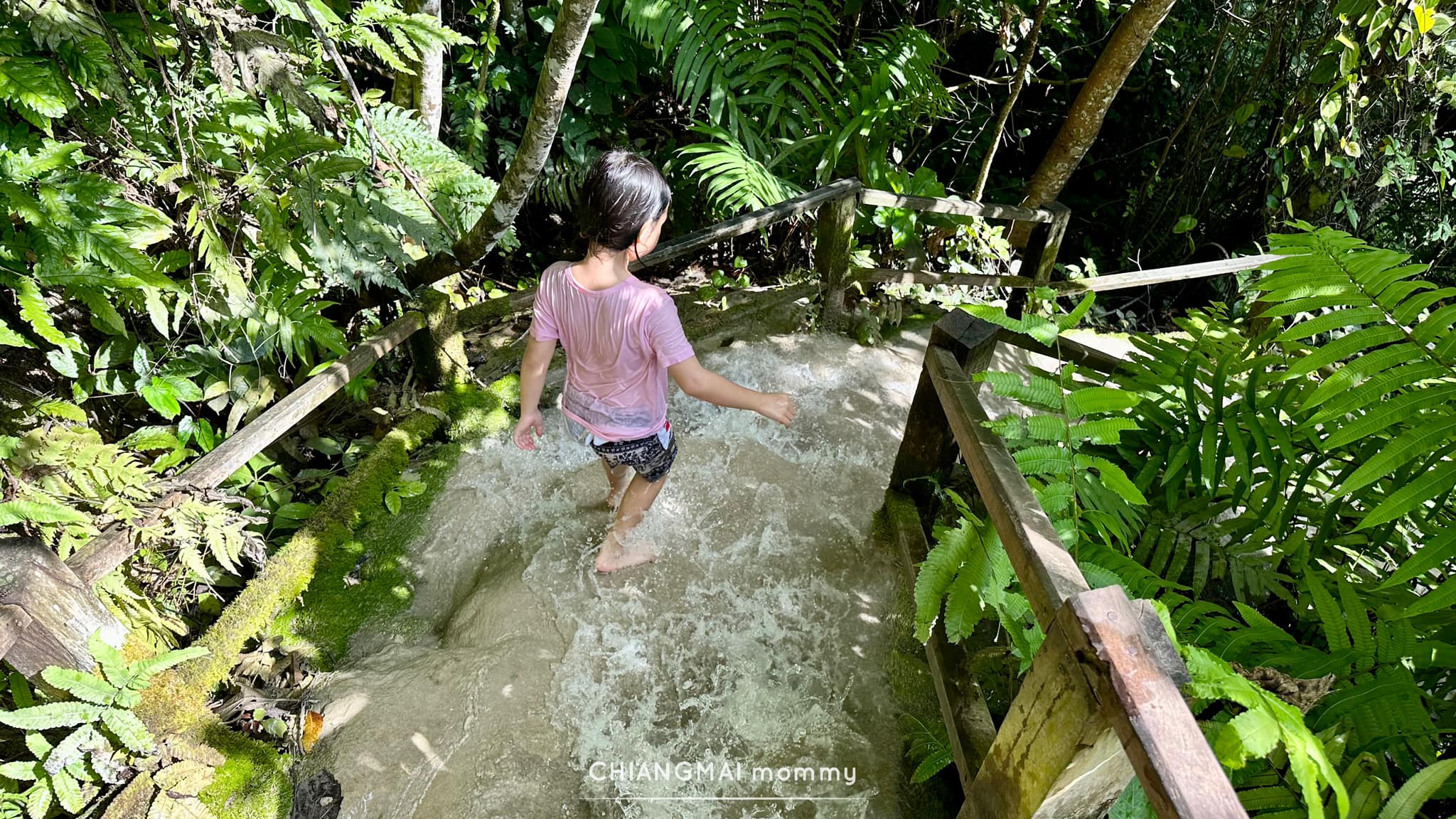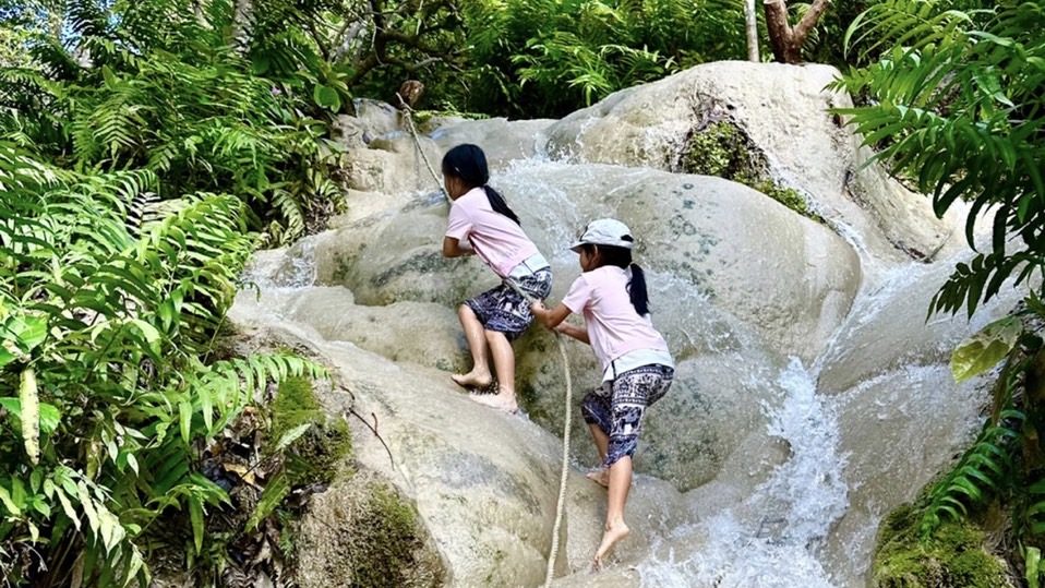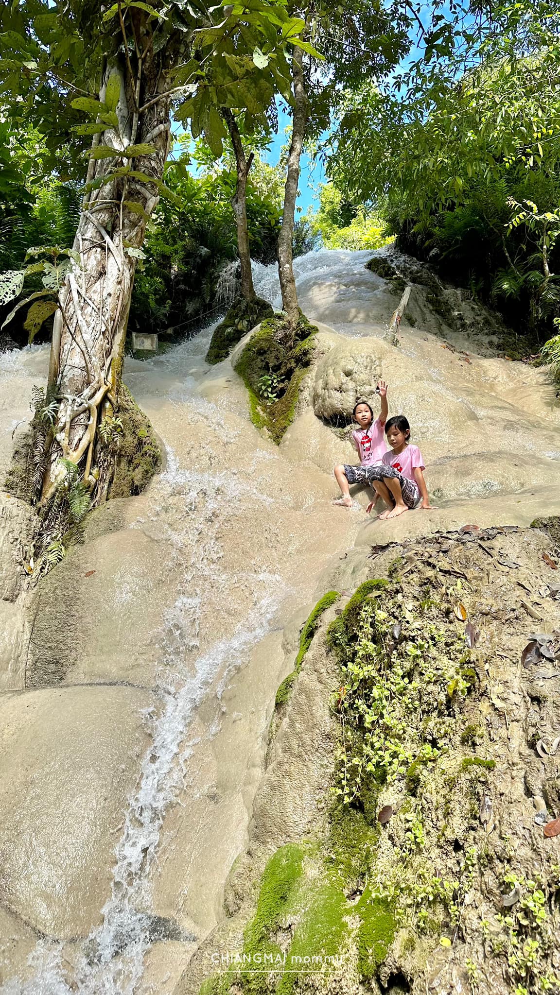 ถึงเวลาสำรวจเล่นน้ำกัน ที่นี่เป็นน้ำตกที่เป็นหินปูน (limestone waterfall) ที่แปลกตาเพราะหินจะถูกเคลือบด้วย Calcium Carbonate ที่ปนอยู่ในน้ำ ทำให้ก้อนหินที่นี่สากไม่ลื่น ไม่มีตะไคร้น้ำเกาะ แถมน้ำใสสะอาดมากกกกก เด็กๆสามารถปีนได้สบายๆ บางจุดที่ชันเค้าก็มีเชือกให้ปีนจับ ไม่ก็เป็นราวบันไดให้ปีนขึ้นค่ะ ลูกชอบมากกกกก เนื่องจากพื้นสากมาก เล่นกันจนกางเกงขาดเลยค่ะ