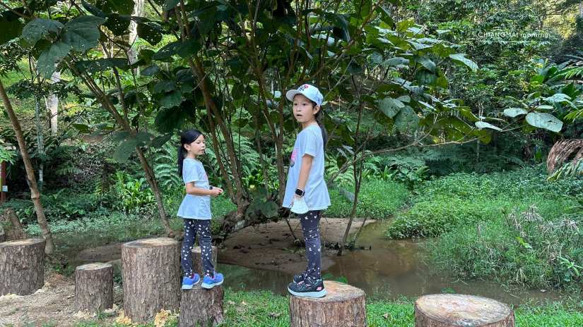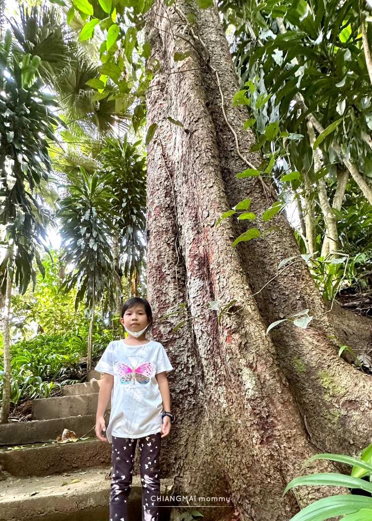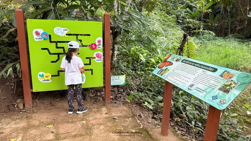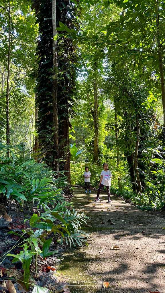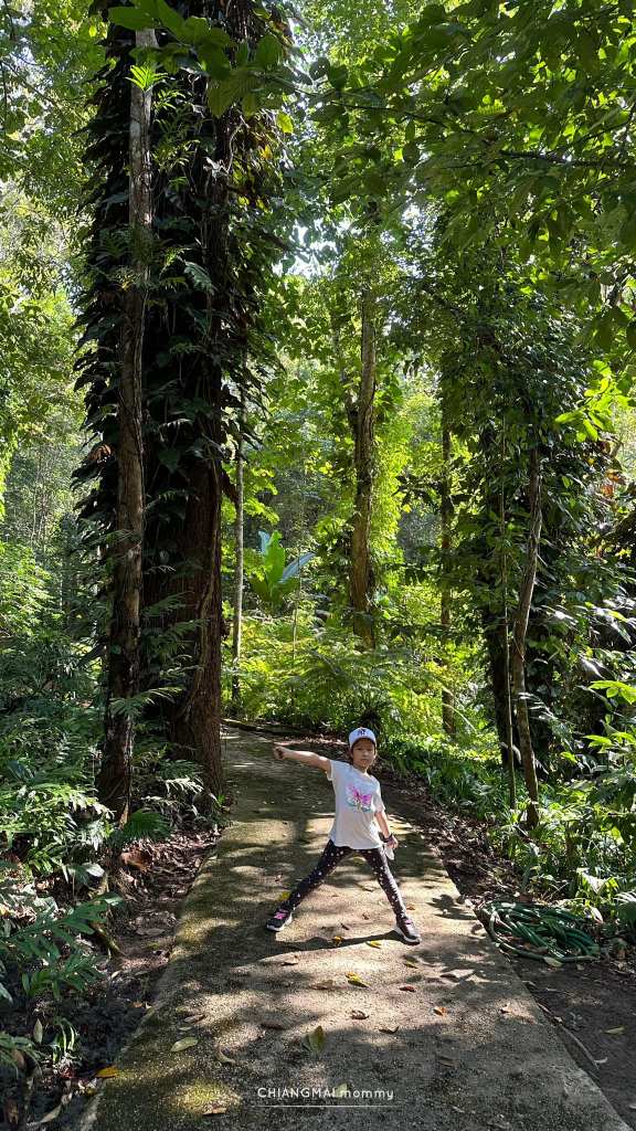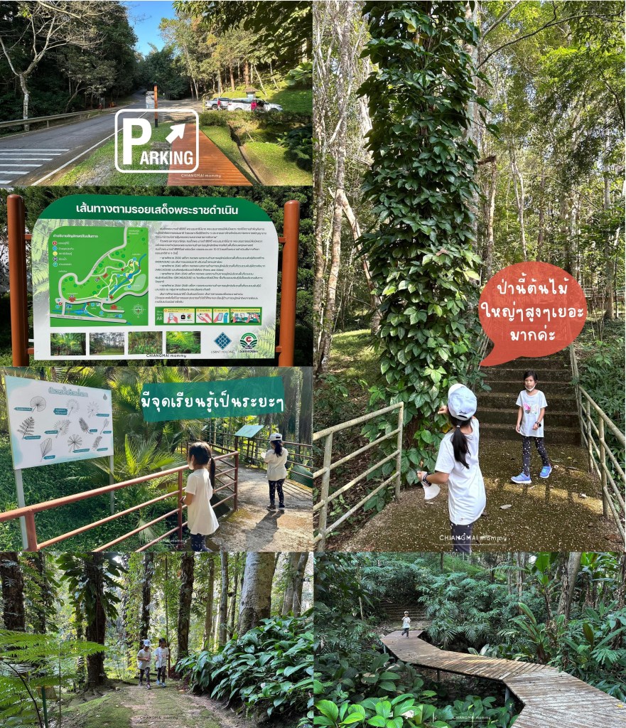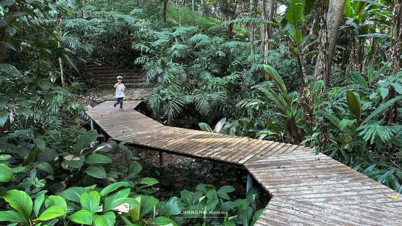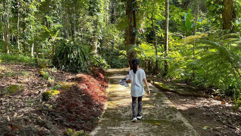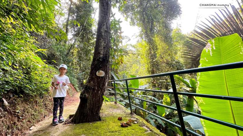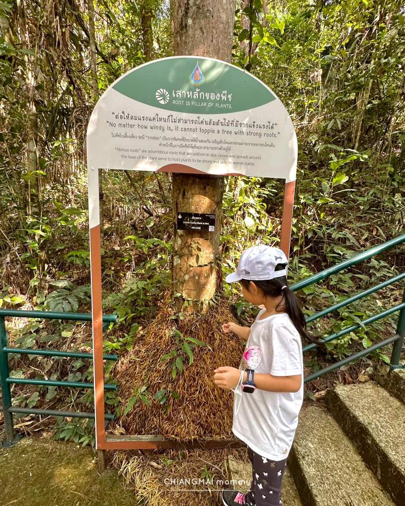 ในเส้นทางจะมีทางเดินให้เดินง่ายๆเด็กๆไม่เคยเดินป่าก็เดินได้สบายค่ะ ทั้งทางปูน บันไดเหล็ก ทางเดินข้ามถนน ข้ามน้ำตก สะพานไม้ หลากหลายไม่น่าเบื่อ มีป้ายเรียนรู้ ชื่อต้นไม้สำคัญๆติดเป็นระยะ ทั้งกลุ่มไม้ วงศ์หมาก วงศ์สะตอ วงศ์ถั่ว ลานสน และพืชอื่นๆอีกเพียบ ที่จะแบ่งเป็นโซนให้เด็กๆได้เรียนรู้กัน