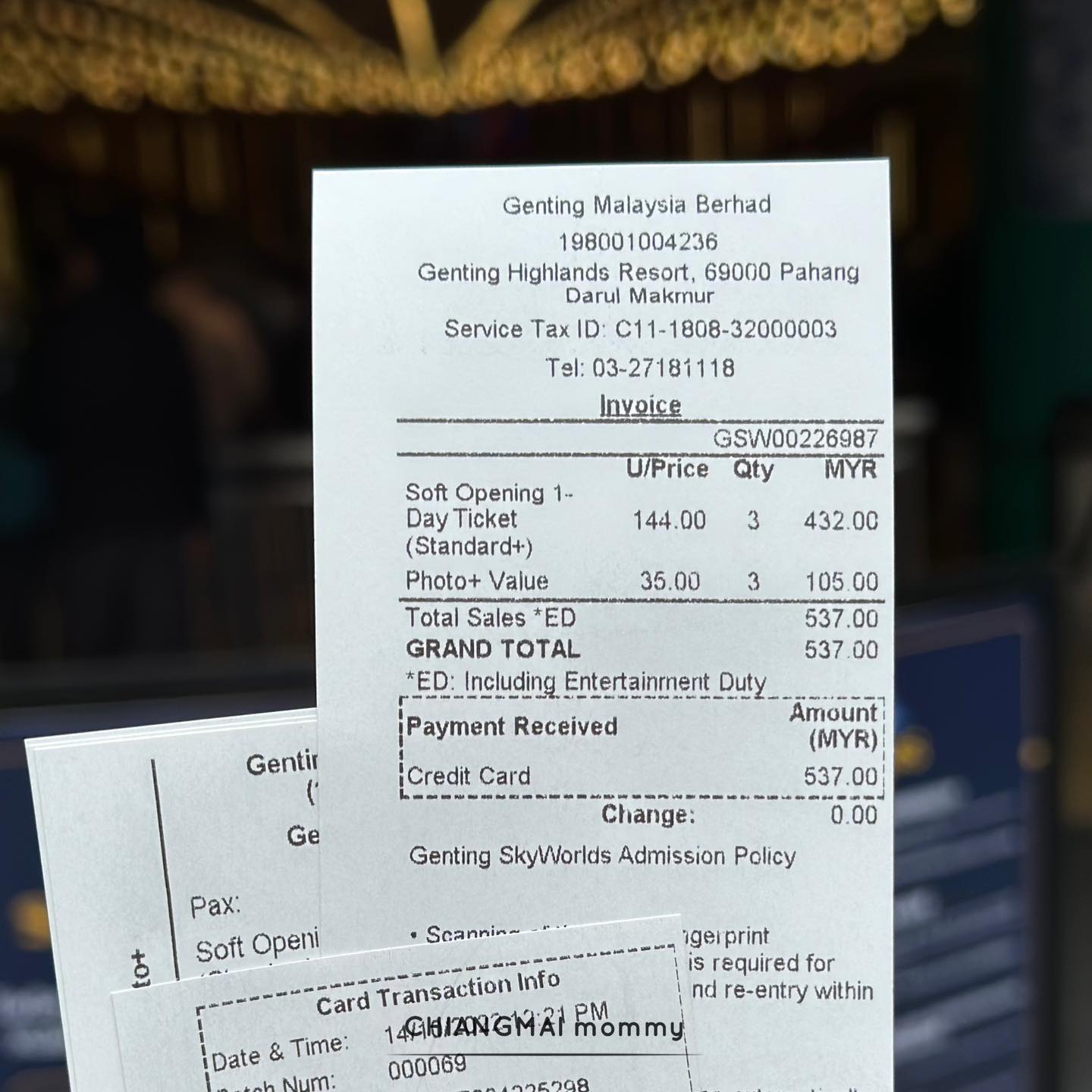 เนื่องจากช่วงนี้อยู่ในการทดลองเปิด ค่าบัตรจะอยู่ที่ 144 RM ถ้าลูกสูงเกิน 110 cm แล้วถือว่าเป็นผู้ใหญ่ จ่ายเท่าแม่เลย