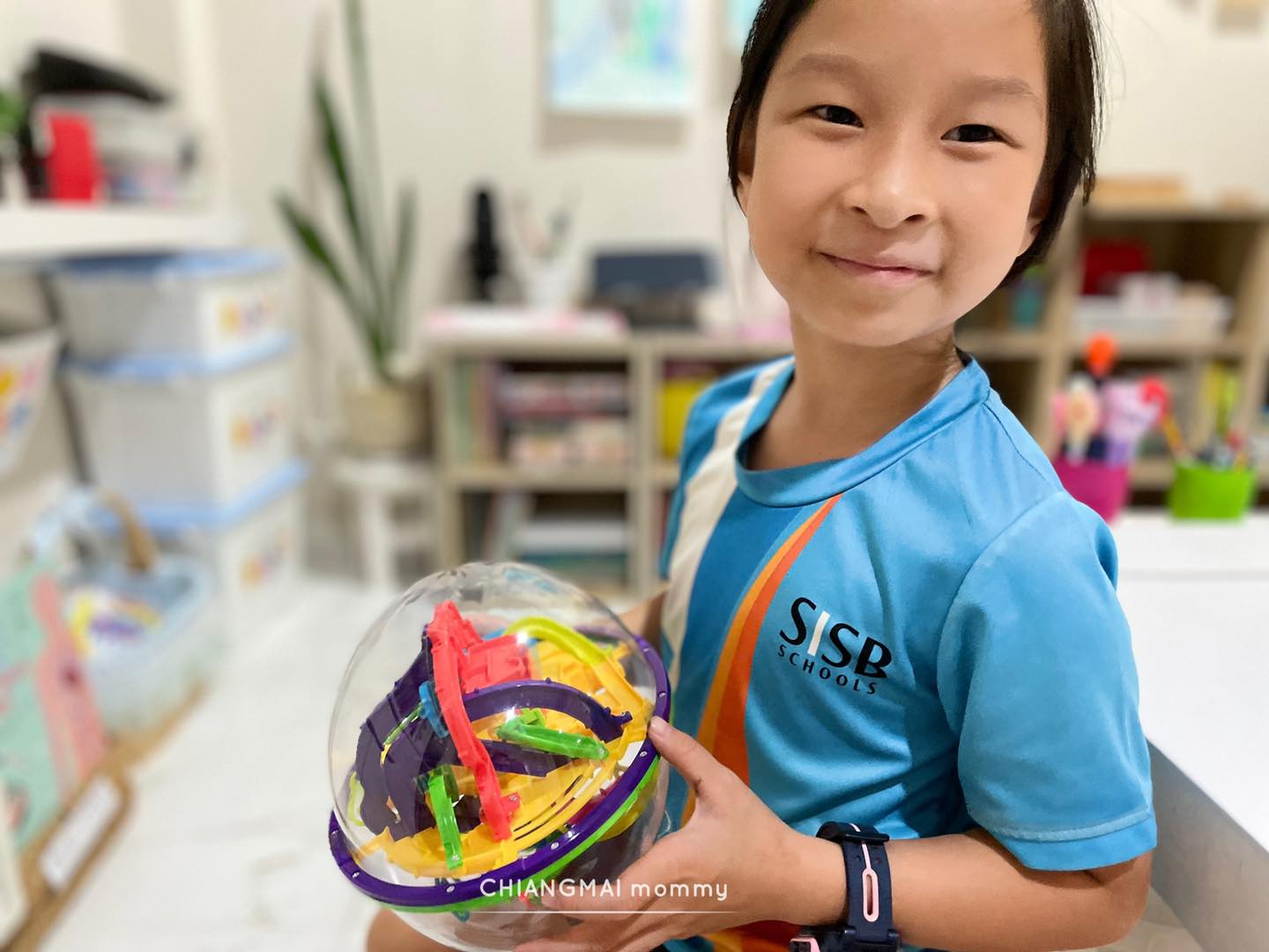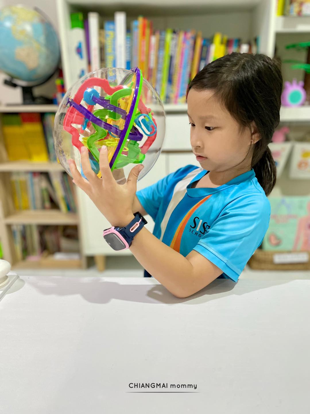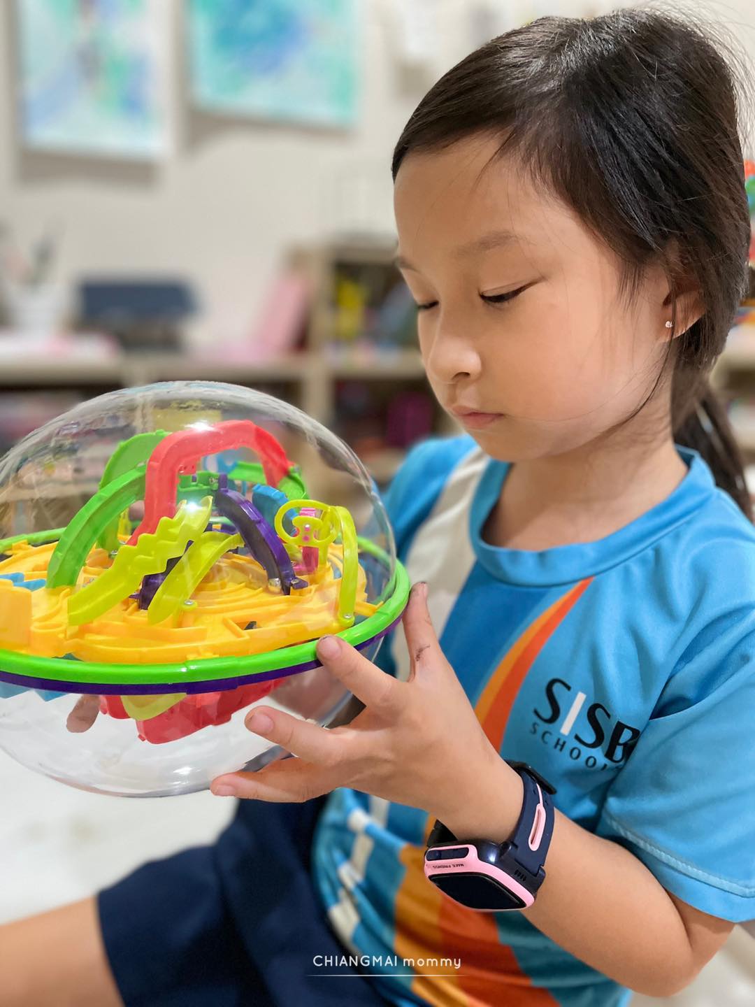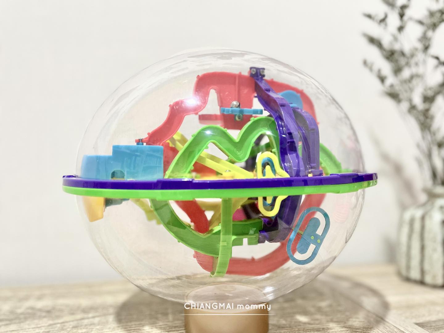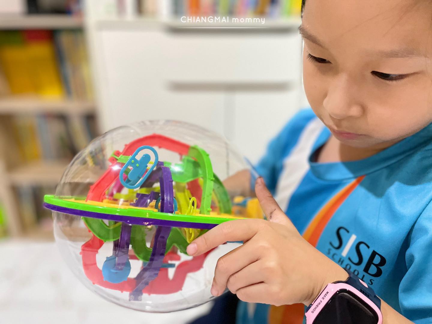 ลูกบอลจะใสๆ มีด่านเขาวงกตภายใน ลูกจะคุมลูกบอลเหล็กเล็กๆให้กลิ้งไปตามเส้นทางตัวเลขแต่ละด่าน ถ้าสมมติทำตกที่เลขไหนก็มาเริ่มที่ตรงจุดที่ตกต่อเลยค่ะ เพราะแม่กลัวจะยากเกินเด็ก