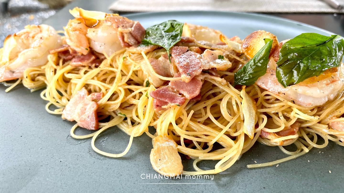 อีกจานที่ลองคือพาสต้า ผัดแห้งน้ำมันมะกอก กุ้งกับเบคอน จานนี้ของแม่เองเพราะมีพริกแห้งเผ็ดหน่อยๆ เป็นเมนูประจำตัวแม่ ชนิดที่ว่าไปร้านใหม่ร้านไหนก็ต้องสั่งมาลอง ถ้าจานนี้ผ่าน ร้านนั้นแม่มาซ้ำอีกแน่นอนอ่ะ สำคัญคือเค้าใช้เส้น Capellini หรือ Angle hair ถูกใจแม่มากเพราะปกติเวลาไปร้านอื่นๆจะขอเปลี่ยนเป็นเส้นนี้ตลอด
