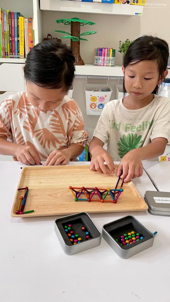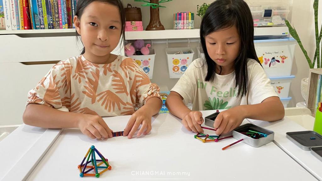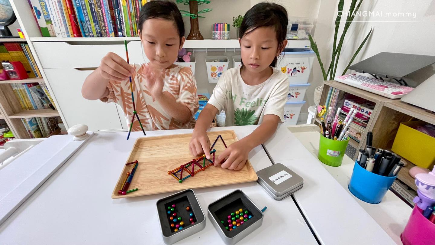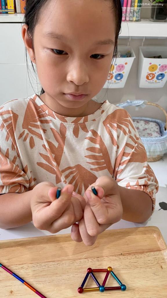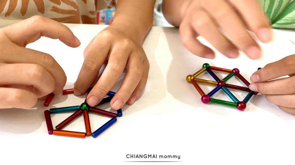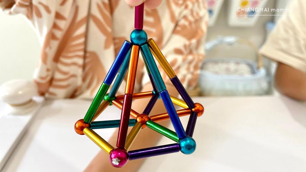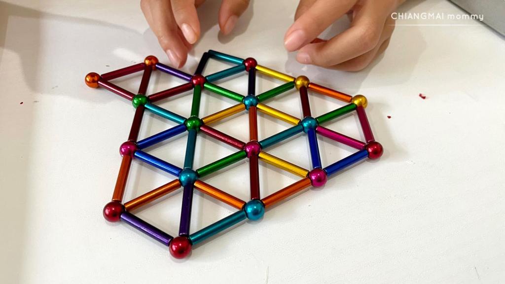 แม่เหล็กชุดนี้เราเอามาฝึกทักษะ STEM เบื้องต้นแม่สอนเรื่องกฏของแม่เหล็กให้ฟัง ขั้วเหนือ-ขั้วใต้ แล้วก็นำมาต่อเป็นรูปทรงเรขาคณิต รูปทรงต่างๆทั้งสองมิติและ 3 มิติ เอาเข้าจริงๆแท่งแม่เหล็กนี่ค่อนข้างเล็ก