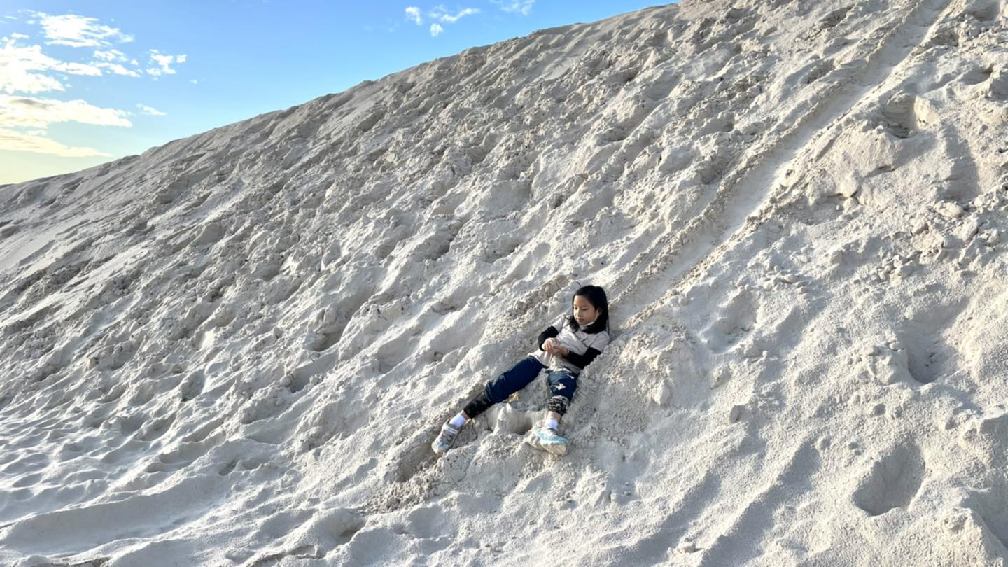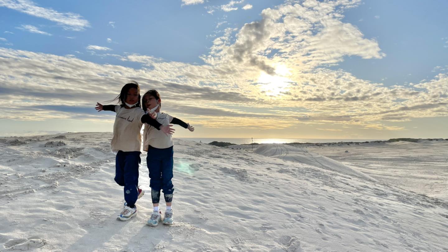 ซึ่งตามคาด…ฝนตกตั้งแต่เช้า ทัวร์นี่ค่อนข้างยืดหยุ่นเรื่องเวลา แถมคนขับแบบใจดีมากกกก ช่วงเช้าเราผ่านเข้าไปดูแป๊บนึง คือคิดว่าไหนๆก็คงไม่ได้เล่นละ ขับวนให้เด็กๆได้เห็นก็คงพอ…แม่ผิดคาด ลูกเห็นแล้วติดตาติดใจ แม้จะไปเที่ยวที่อื่นแต่ใจนี่ถามแต่เมื่อไหรจะได้เล่นทรายๆๆๆ จนลุงคนขับต้องพามาอีกรอบตอนขากลับ ซึ่งจู่ๆฟ้าเปิด ฝนหยุดตกซะงั้น โชคดีมากๆทั้งที่แม่ถอดใจว่าอดแน่ๆละค่ะ