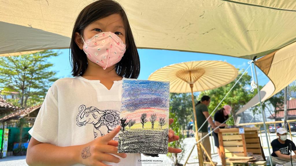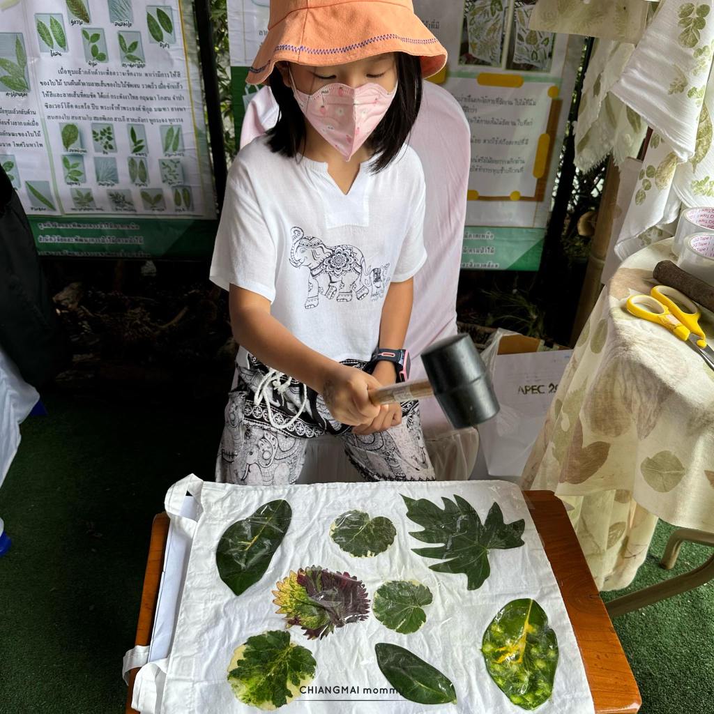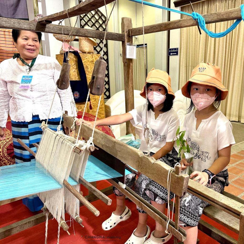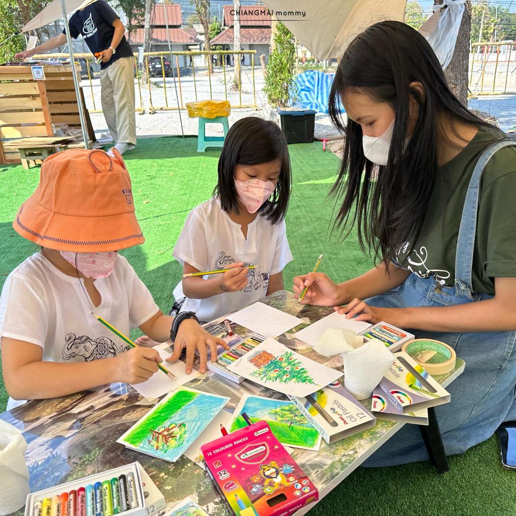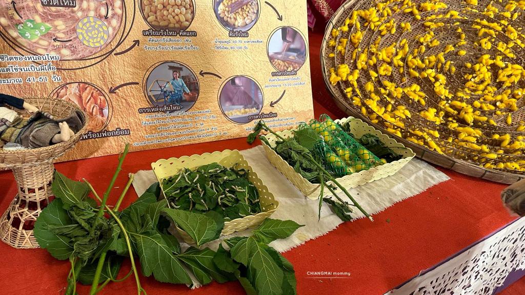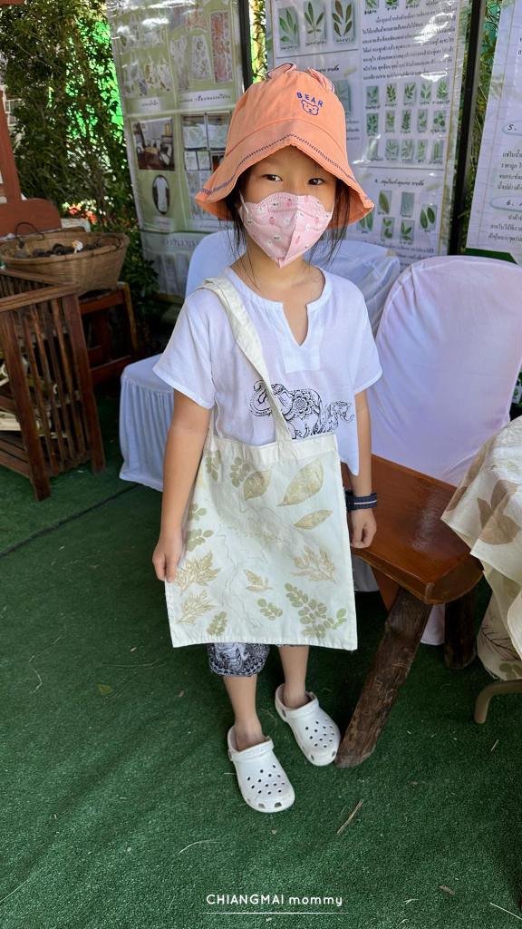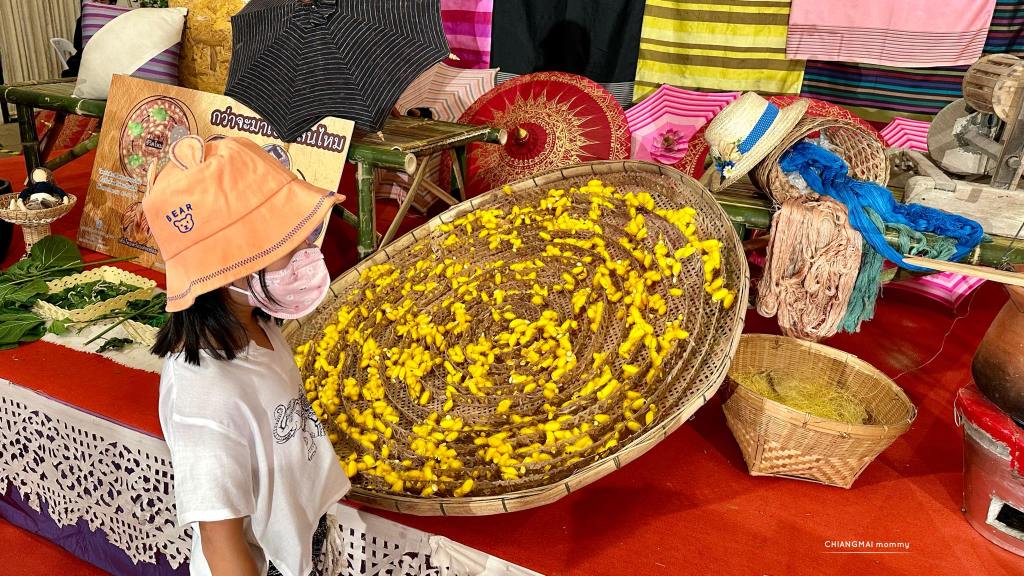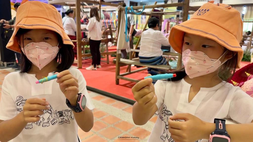 ที่เริ่ดคือ กิจกรรมให้เด็กๆทำเพียบ!! แต่ละวันก็ไม่ซ้ำกัน อยู่ที่ลานด้านนอกของฝ่ายการศึกษานอกระบบ บรรยากาศแนวแคมป์ปิ้ง ส่วนเราวันนี้มาวาดรูปสวยๆ ที่บูทอื่นอย่างของกรมป่าไม้ก็มีเพนท์ใบไม้ลงผ้าโดยการทุบๆๆๆ ก็ได้ผ้าลายธรรมชาติสวยๆเลยค่ะ หรือจะย้ายต้นอ่อนกล้วยไม้ลงกระถางจาก ม.แม่โจ้ โซนกล้วยไม้ ยังๆๆๆคุณพ่อคุณแม่สามารถไปถ่ายรูปสไตล์เจ้าดารารัศมี หรือกาสะลอง-ซ้องปีบ มีชุดให้บริการ สวยๆหรูหราแบบเจ้านางโบราณ (แอบเสียดายไม่มีไซส์เด็ก) แล้วก็ไปดูกรรมวิธีผลิตผ้าทอมือ กี่ทอผ้า กี่กระตุก การเลี้ยงหม่อน ไหม ดูกันเพลินมากๆค่ะ สามารถลองทำได้ด้วยค่ะ คุณยายใจดีให้ความรู้เราเยอะมากๆแถมได้เส้นไหมมาด้วย