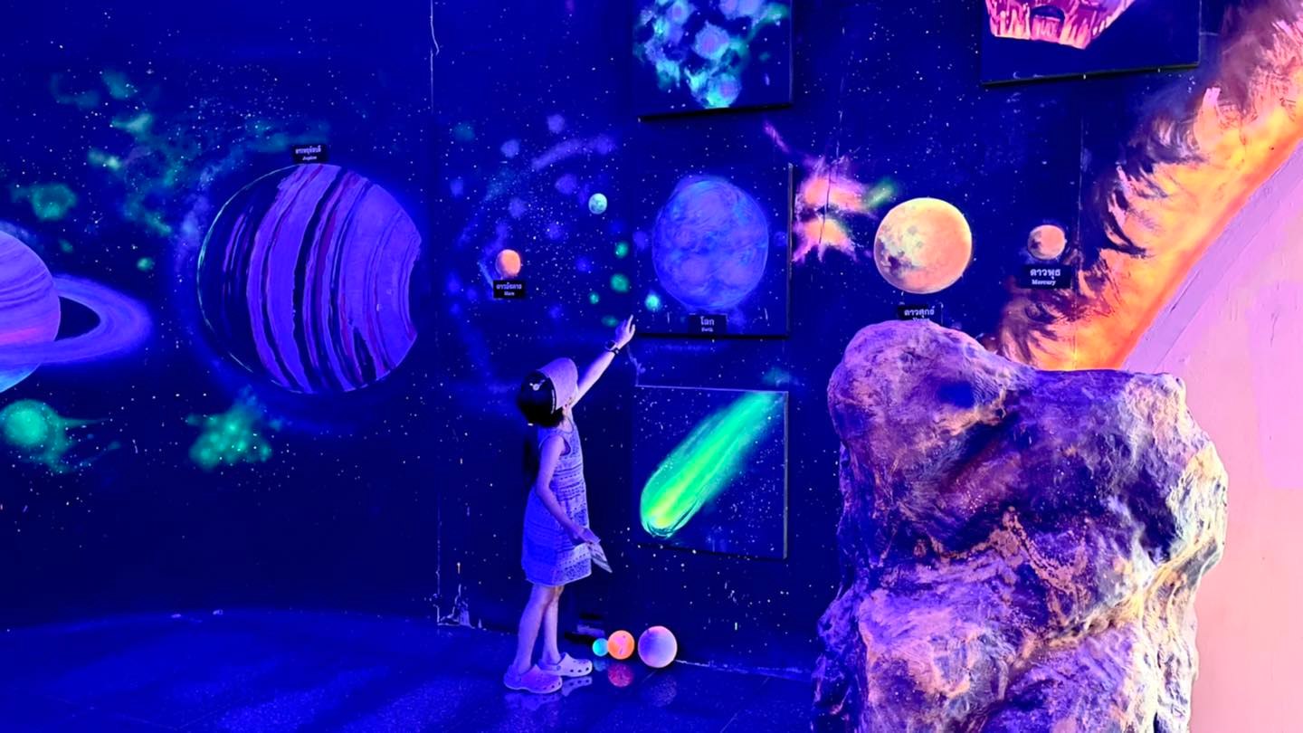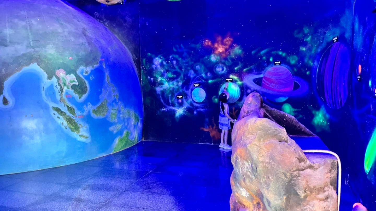 จากนั้นถัดไปจะเป็นห้องจัดแสดงระบบสุริยะจักรวาล การกำเนิดโลก ดวงดาว อุกกาบาตต่างๆ ที่เป็นบ่อเกิดของหิน ดิน แร่ต่างๆอันเป็นที่มาของการทำเหมือง ห้องนี้ทำออกมาดีมากๆมีโชว์ฟอสซิล อำพัน ชั้นหิน แร่ต่างๆ อุปกรณ์ขุดเจาะโบราณแล้วก็ส่งต่อมายังส่วนแสดงเหมืองแร่หลากหลายชนิด วิธีการถลุงแร่ การแปรรูปแร่ดีบุก จะมีป้ายอธิบายเป็นจุดๆ ซึ่งแม่ก็เพิ่งรู้พร้อมลูกเลยค่ะ