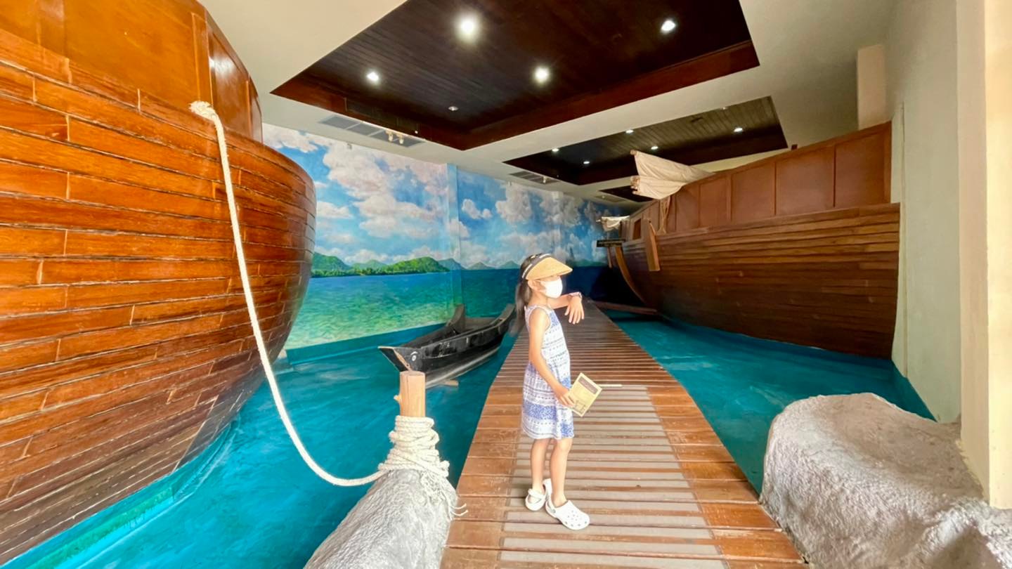 จากนั้นก็จะเป็นห้องที่ทำออกมาเหมือนเรือสำเภาแสดงถึงการย้ายถิ่นฐานการอพยพของชาวจีนที่ข้ามน้ำข้ามทะเลมาแสวงโชคที่ภูเก็ต วิถีชุมชนย้อนอดีตความเป็นอยู่ของชุมชนไทยจีนในสมัยเหมืองแร่รุ่งเรือง มีตลาด ศาลเจ้า การละเล่นพื้นบ้านและอาชีพต่างๆของชุมชนไทยจีน เด็กๆสนุกกับที่มาที่ไปจากอดีตจนถึงปัจจุบัน คล้ายกับว่าเราได้เดินทางท่องไปยังหนังสือประวัติศาสตร์เล่มสนุกเลยค่ะ