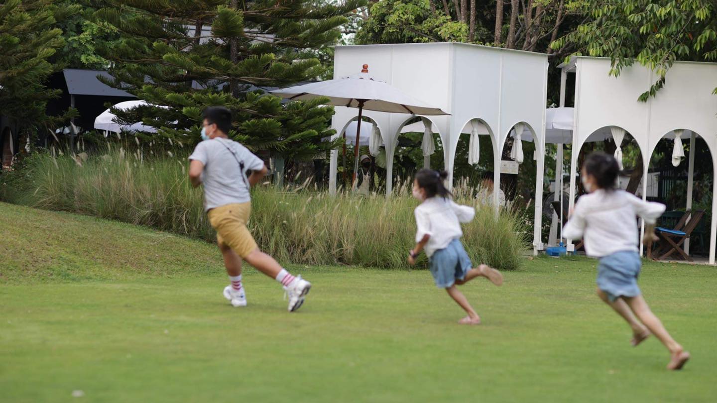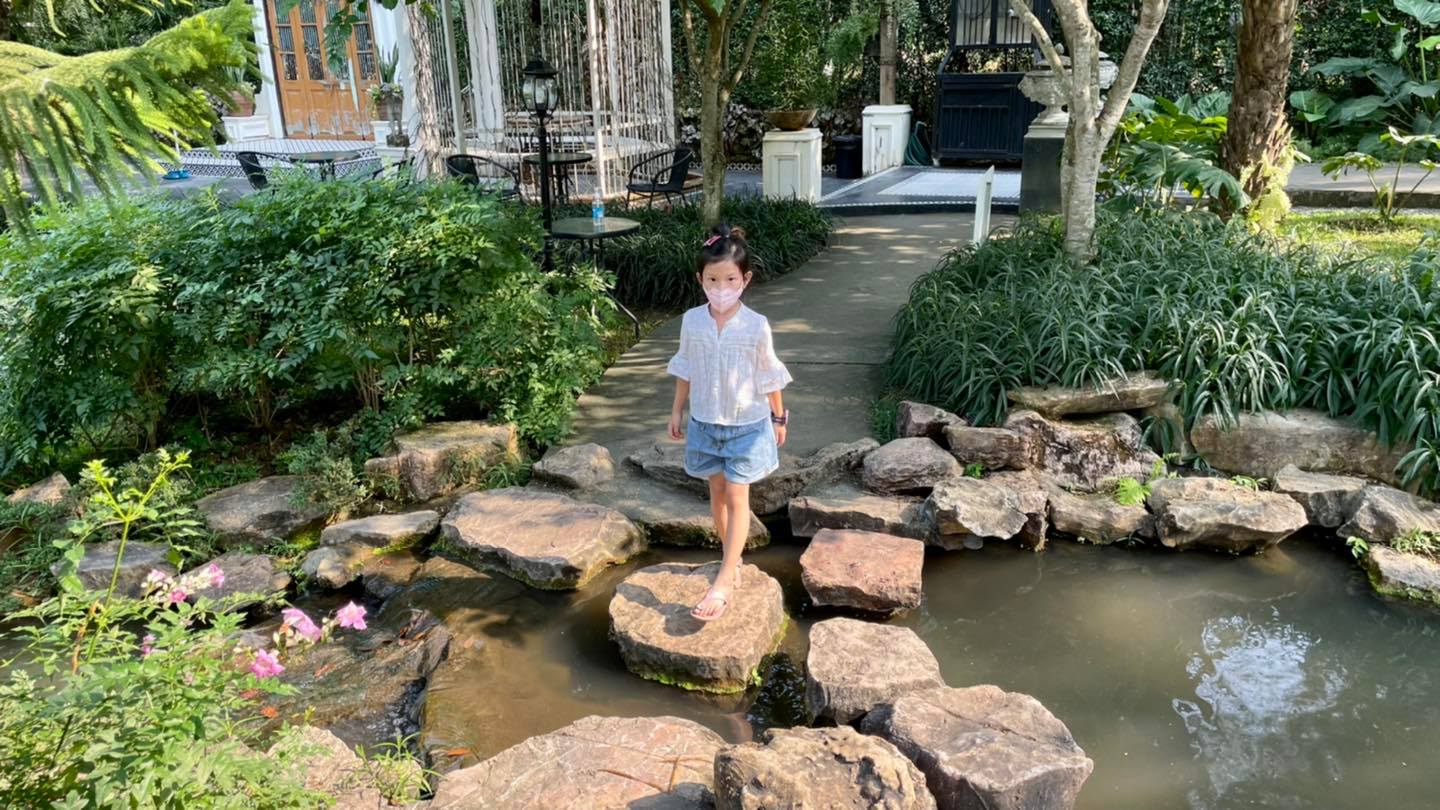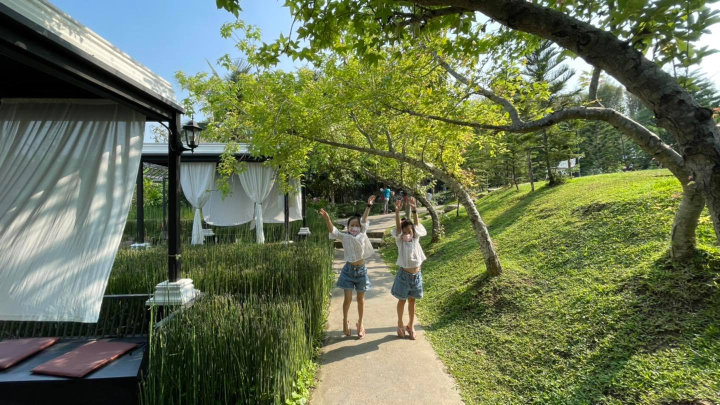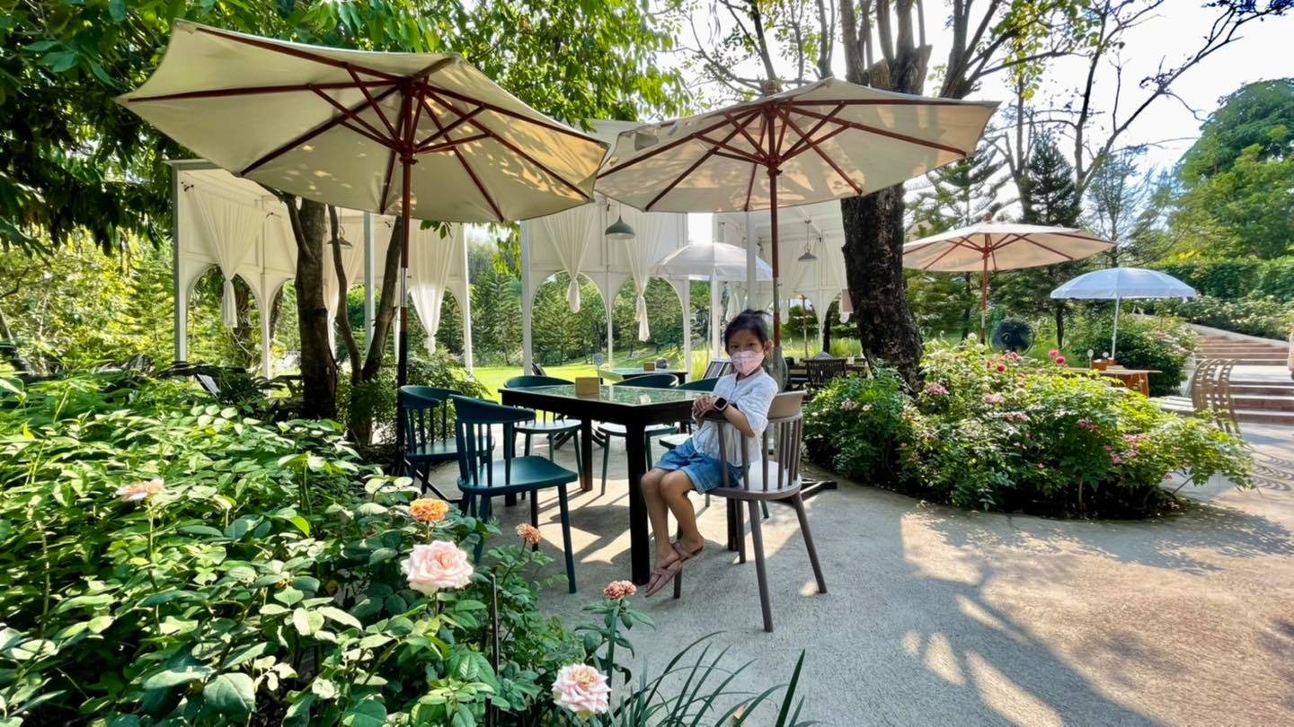 ส่วนวิวและบรรยากาศสวยมากๆ มีมุมถ่ายรูปเพียบ น้ำตก สวนดอกไม้ สระน้ำ สนามหญ้ากว้างๆ ลูกสนุกมากจริงๆ แค่วิ่งเล่นไล่จับก็เกินพอแล้วค่ะ ไม่ต้องมีสนามเด็กเล่นก็สนุกเพราะพื้นที่ outdoor กว้างๆ อากาศก็ดีมากวันนี้ลมพัดเย็นสบาย ส่วนพื้นที่ทานอาหารก็รักษาระยะห่าง ไม่แออัด มีทั้งห้องแอร์และพื้นที่สวน