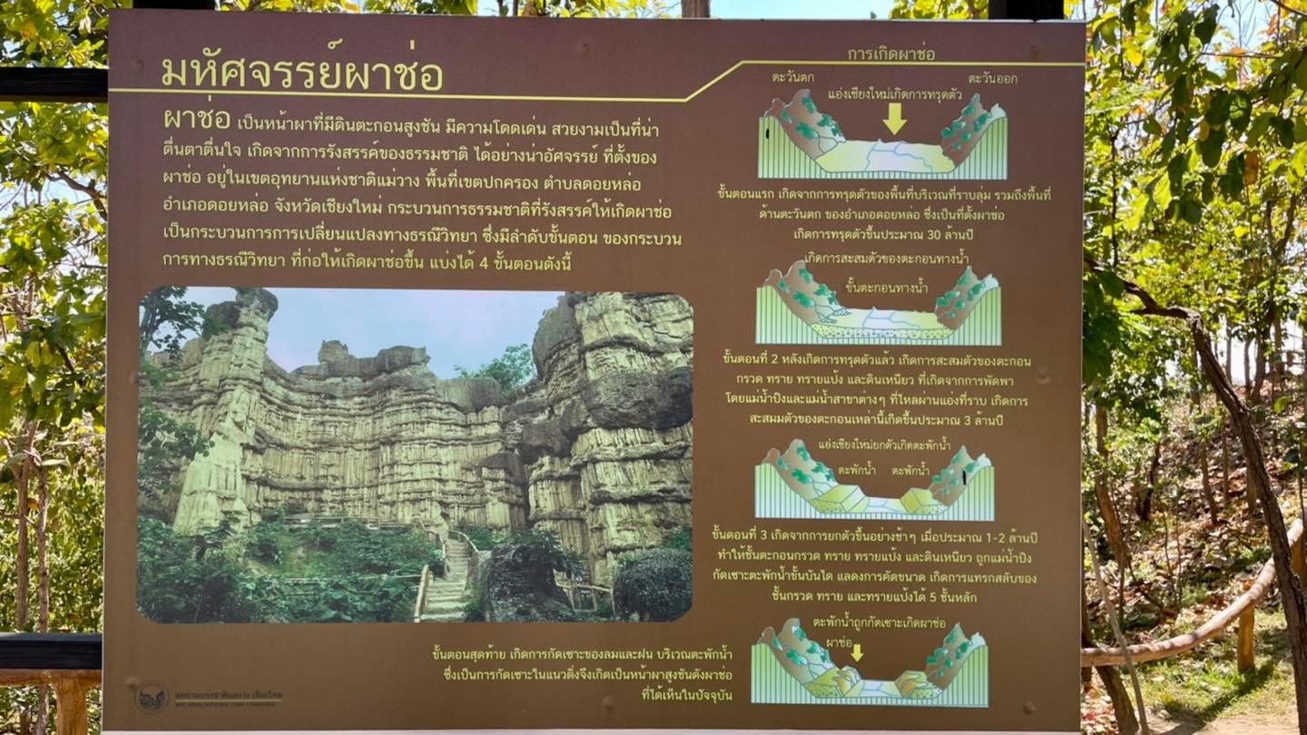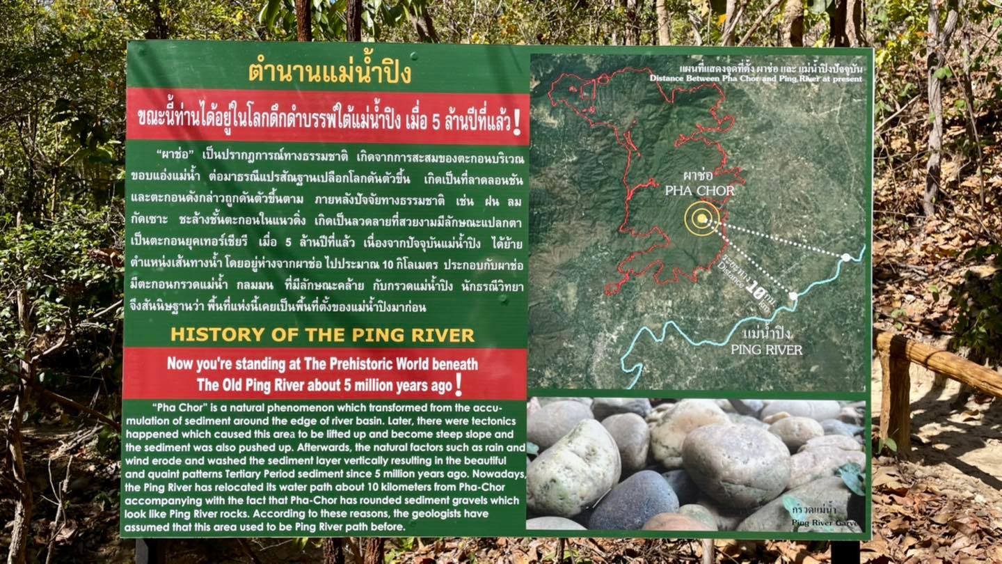 เล่าให้ฟังคร่าวๆว่าแม่น้ำปิงในอดีตมีการไหลมาทางนี้ ระหว่างที่น้ำไหลก็จะพัดพากรวด ดินตะกอนสะสมกันเป็นชั้นๆตามความแรงของแม่น้ำและฤดูกาล จากนั้นเมื่อน้ำปิงมีการเปลี่ยนเส้นทางการไหลไปที่อื่น บริเวณนี้จึงหยุดสะสมตัวและเกิดการเปลี่ยนแปลงทางธรณีวิทยา ยกตัวสูงขึ้นมาและเกิดการกัดกร่อนของลมและฝนทำให้เกิดความมหัศจรรย์ของผาช่อตามที่เราเห็น ณ ปัจจุบัน