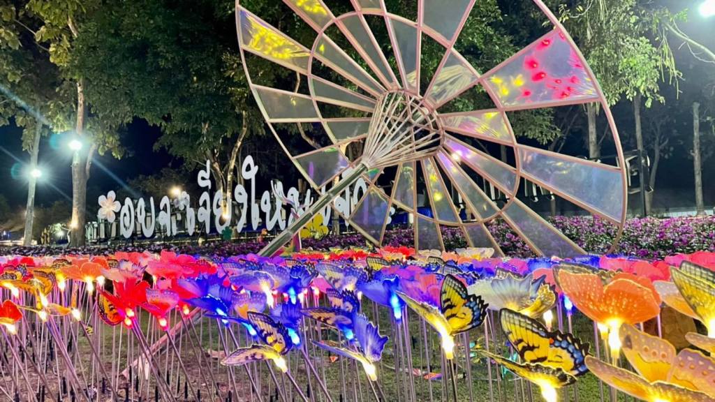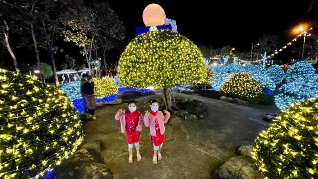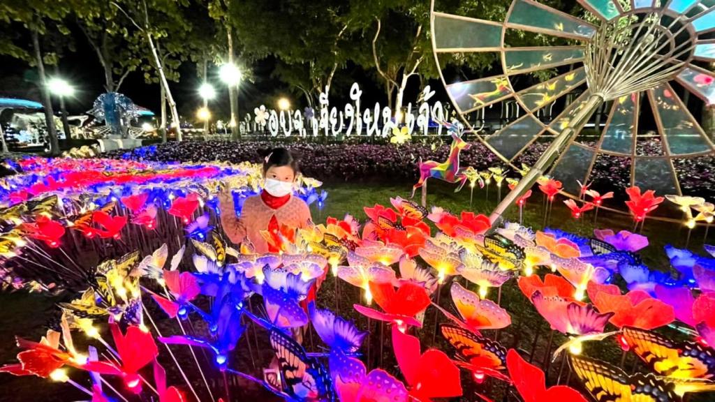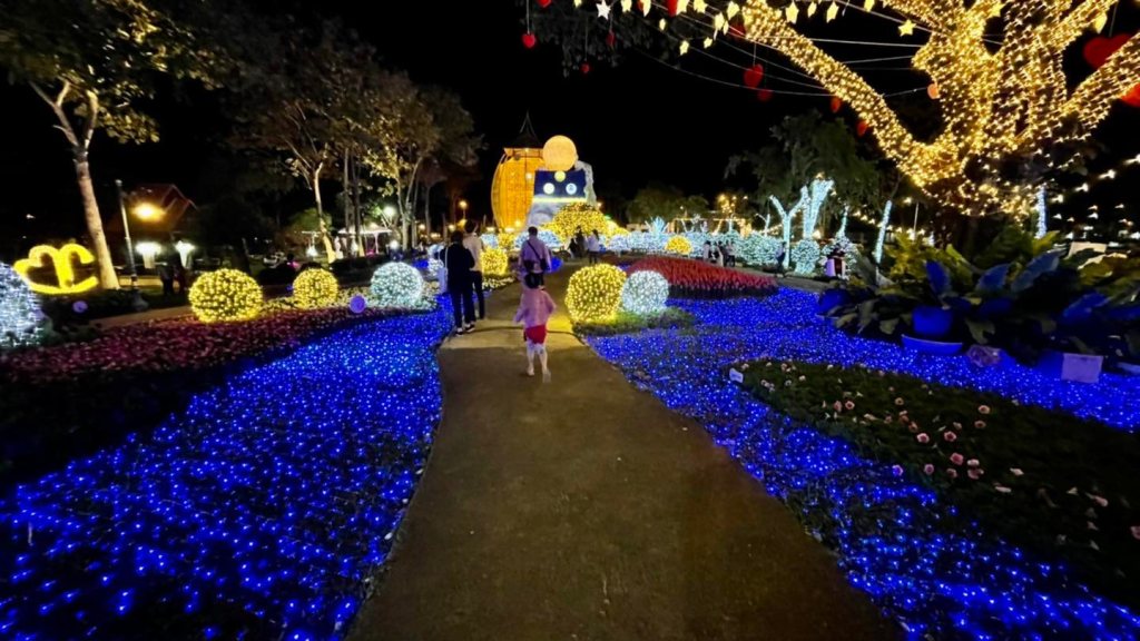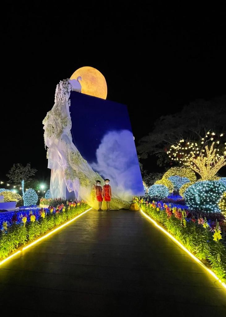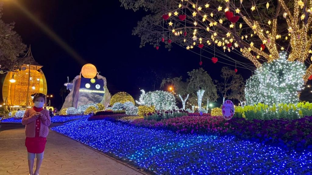 เพราะเค้าประดับไฟคือสวยระยิบระยับมากกกกกกก มีลูกเล่นเยอะทั้งเลเซอร์ ไฟตกแต่งประดับต้นไม้/ดอกไม้ หอชมวิว ซุ้มดอกไม้ที่มี แสง สี เสียง สวยมากค่ะ พลาดไปนี่เสียดายแทนจริงๆ