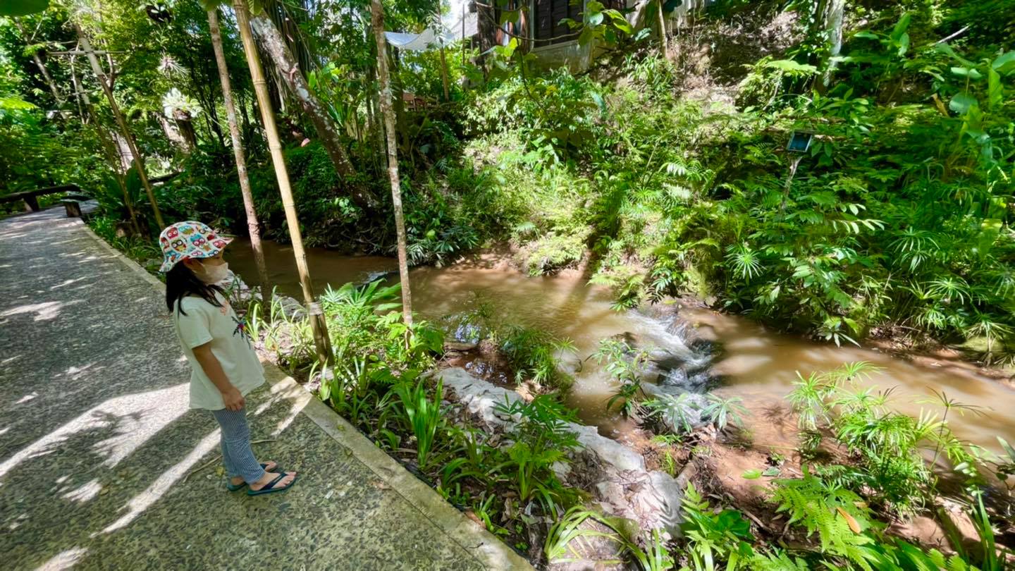 ตัวร้านอาหารจะอยู่ด้านในเดินผ่าน reception เข้ามา เด็กๆเดินเลาะเลียบลำธาร ข้ามสะพาน บรรยากาศนี่ดีสุดๆ เพราะที่นี่มีน้ำตก ลำธาร ธรรมชาติล้อมรอบเลยค่ะ สวยมากๆ แถมการตกแต่งทุกอย่างนี่คือน่ารักแบบใกล้ชิดธรรมชาติ มองไปทางไหนก็สบายตา สบายใจ มันสดชื่นไปหมดค่ะ