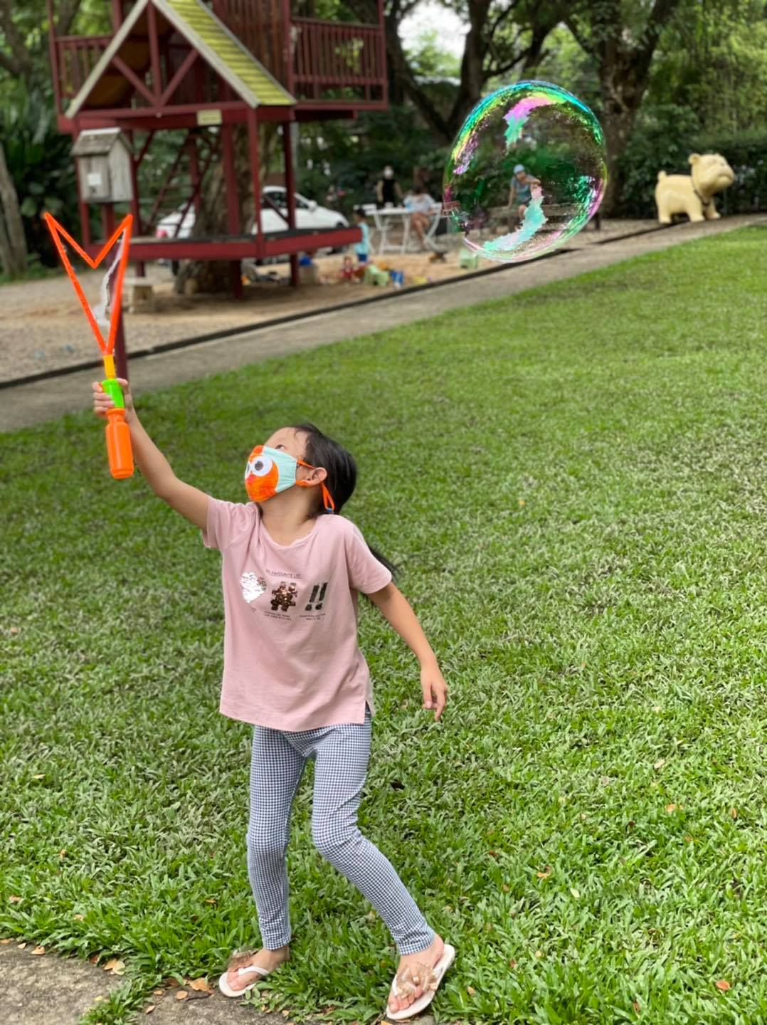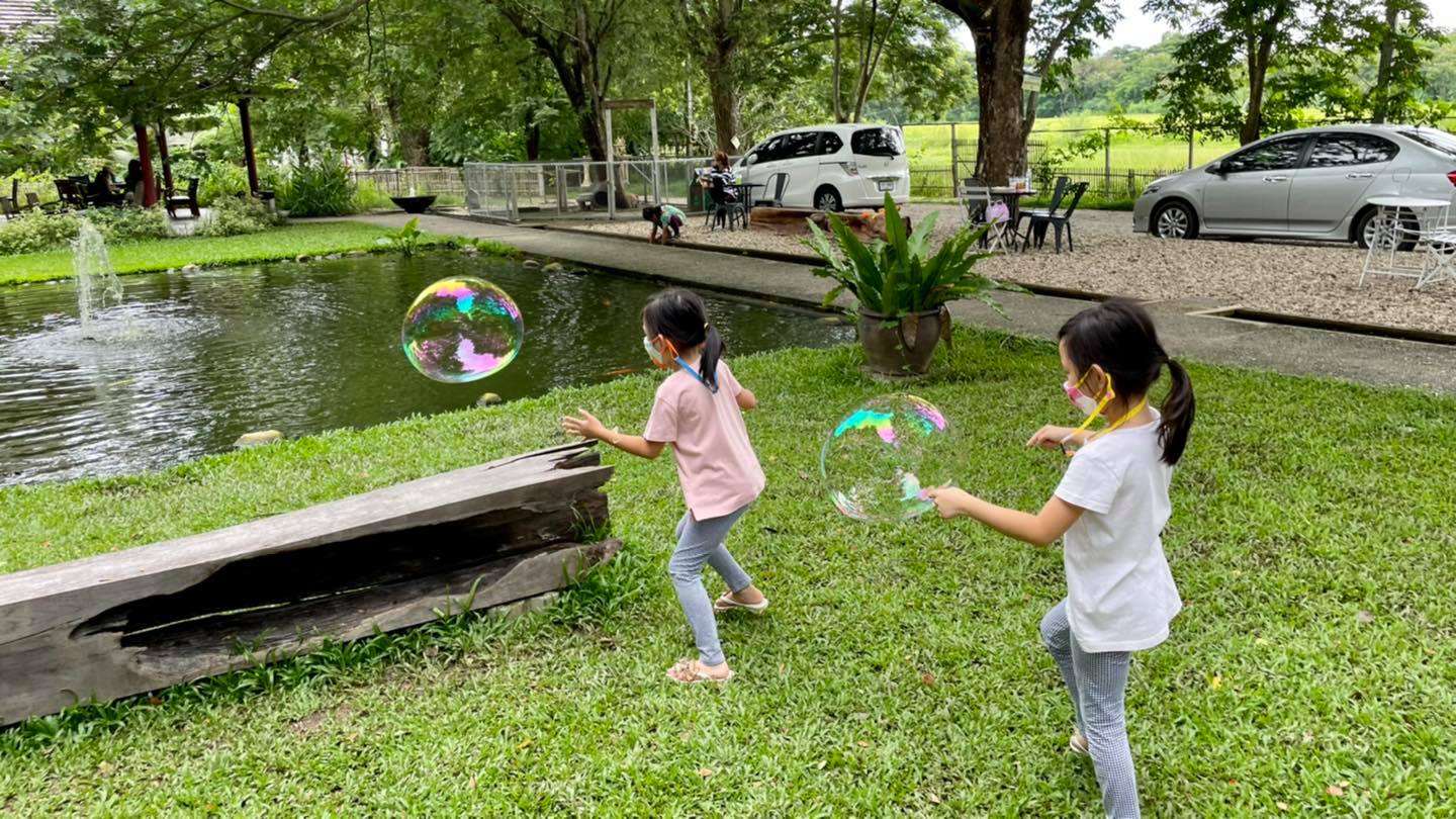 แถมมีไม้แบดให้บริการด้วย บ้านต้นไม้ ชิงช้า กองทราย กระต่าย น้องหมา และมีสระน้ำที่มีปลาคราฟที่พยายามกระโดดมาอยู่บนดิน