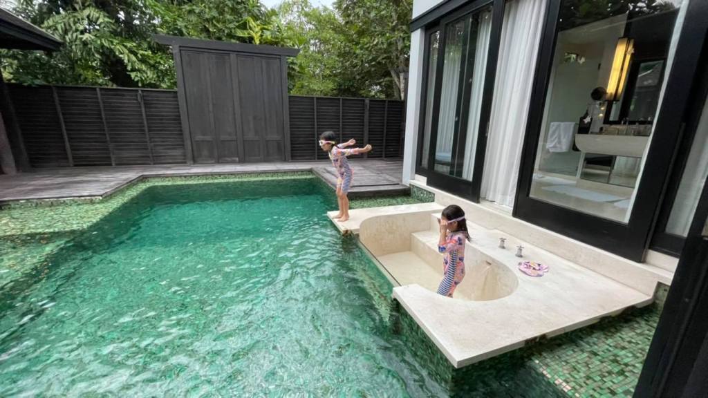 ภายในห้องกว้างมากกกกกคืออยู่สบายสุดๆเราเพิ่มเตียงเสริมอีก 2 เตียงยังเนื้อที่เหลือเลยค่ะ ในห้องมีอุปกรณ์อำนวยความสะดวกครบตามฉบับโรงแรม 5 ดาว คือเลี้ยงลูกมาเหนื่อยๆหัวถึงหมอนก็หลับสบายค่ะ ที่สำคัญไฮไลท์ของที่พักนี้คือ มีสระว่ายน้ำและอ่างอาบน้ำแบบส่วนตัว เหมาะกับยุคโควิทแบบนี้ เราพักที่นี่ 3 วันลูกเล่นน้ำทั้ง 3 วันเลยค่ะ ดึกแค่ไหนก็ยังเล่นได้พอหนาวปุ๊บก็ย้ายมาเล่นอ่างน้ำอุ่นที่ติดกันแสนจะมีความสุขค่ะ ![]()