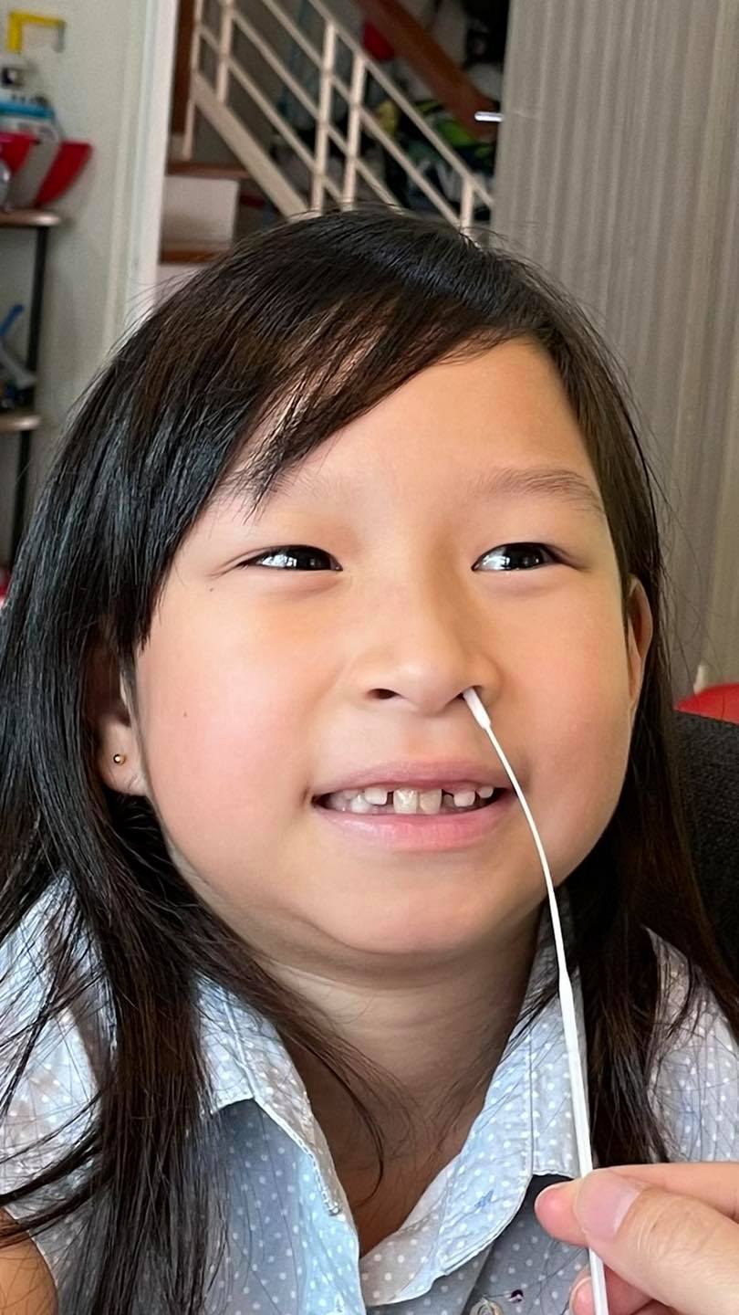 ตอนแรกเราใช้ชุดตรวจแบบแหย่จมูก เราเลือกยี่ห้อที่แหย่จมูกแค่ 1.5 cm ซึ่งเข้าไม่ลึก กวาดๆปั่นๆ 10 ครั้ง แล้วลูกก็จามทุกทีเลยค่ะ