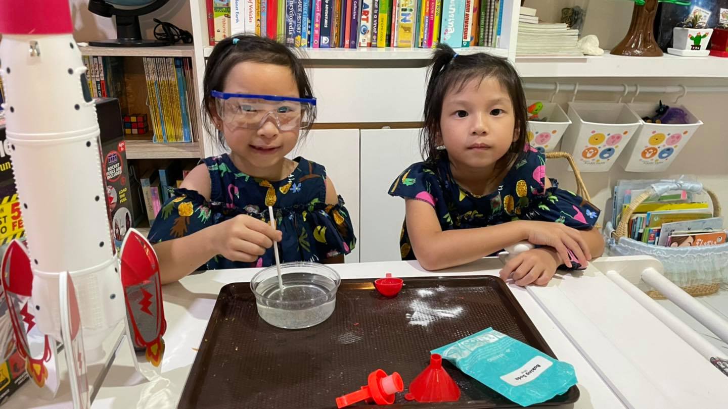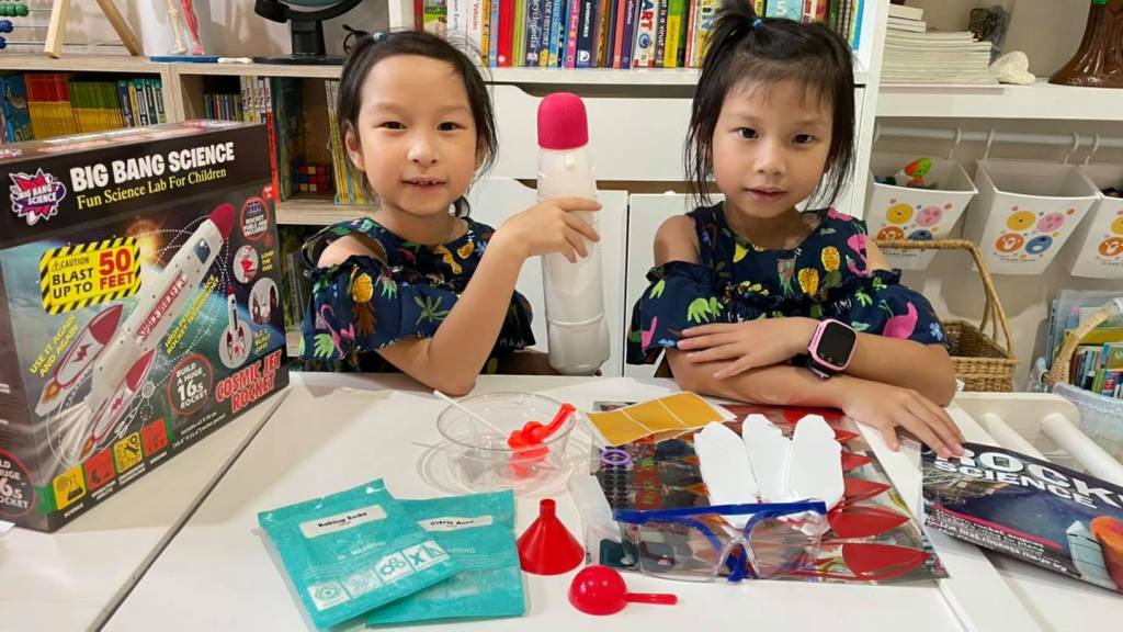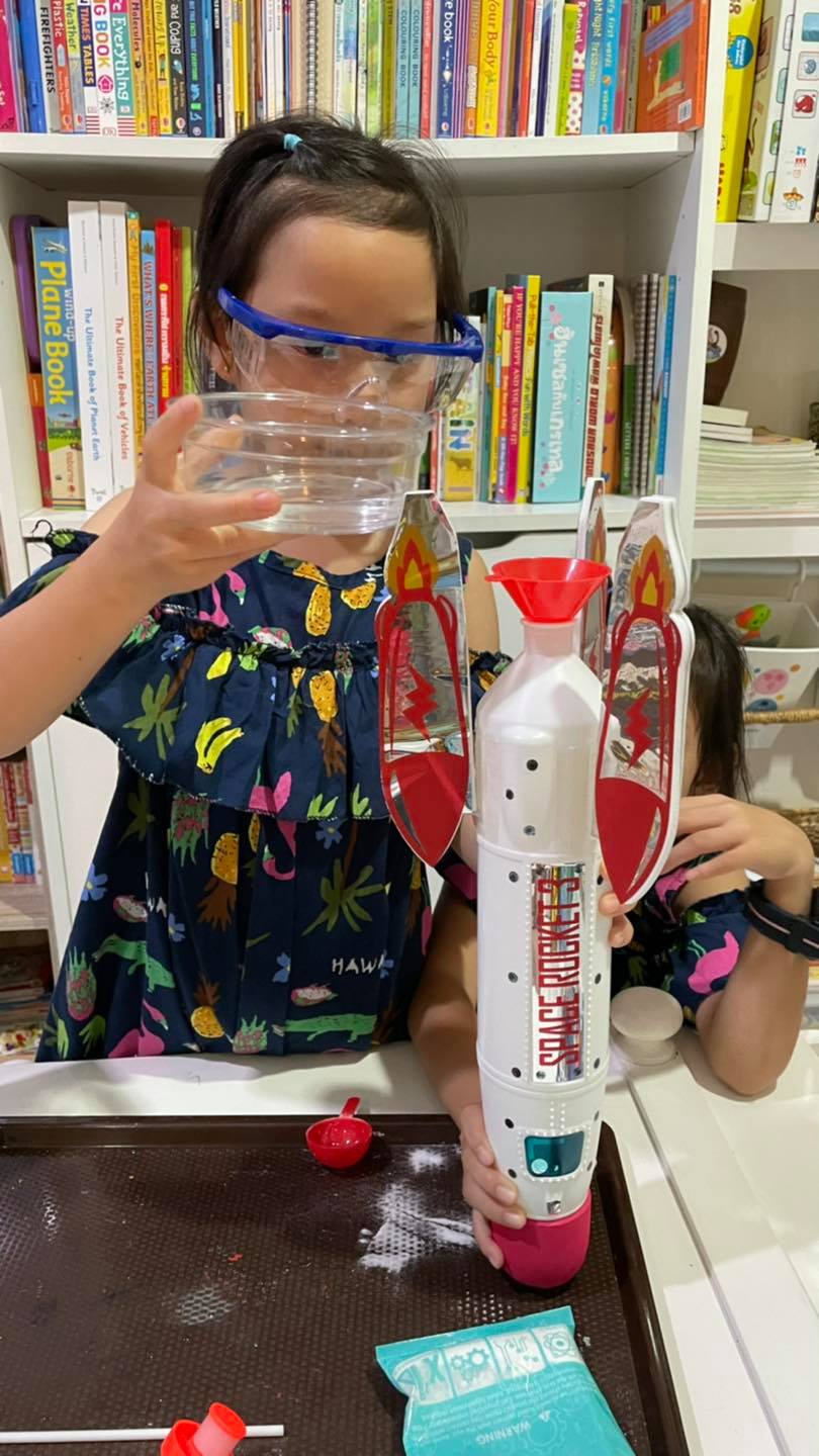 ในกล่องจะมีจรวดมาให้เด็กๆประกอบเอง อุปกรณ์เตรียมเชื้อเพลิง นั้นก็คือแรงดันที่จะทำให้จรวดพุ่งขึ้นบนท้องฟ้าได้ค่ะ โดยจะใช่ critics acid กับ baking soda ทำปฏิกิริยากัน ในชุดจะมีสารเคมีมาให้เล่นได้ 3 รอบ แต่พอหมดก็เอาที่เคยเล่นภูเขาไฟลาวามาเติมเล่นได้เรื่อยๆค่ะ ชอบกันอีกแล้ว