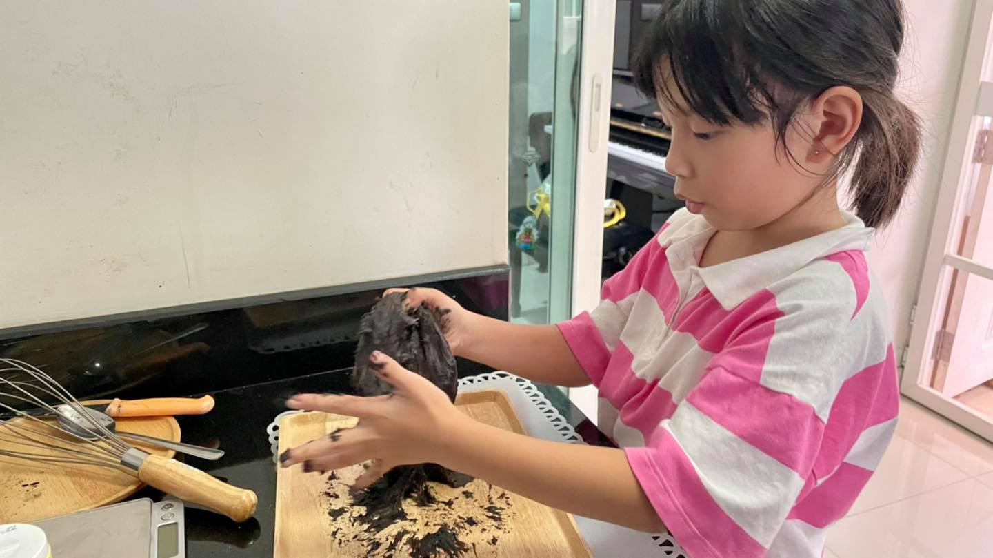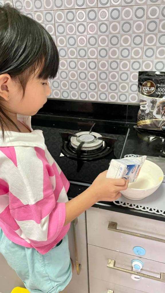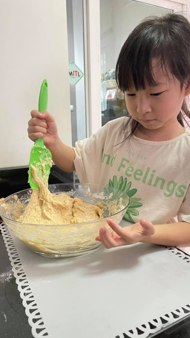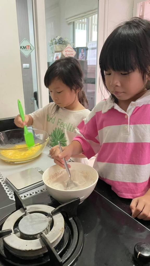 วิธีทำ เราชั่งน้ำหนักตามสัดส่วนเป๊ะๆ ด้วยเครื่องชั่งค่ะ อันดับแรกละลายเนยให้มีสถานะเป็นของเหลวก่อนจะได้ผสมง่ายๆโดยใส่ในไมโครเวฟ 20 วินาทีก็ละลายหมด เด็กๆตอกไข่ใส่เกลือนิดหน่อย คนให้เข้ากันพักไว้