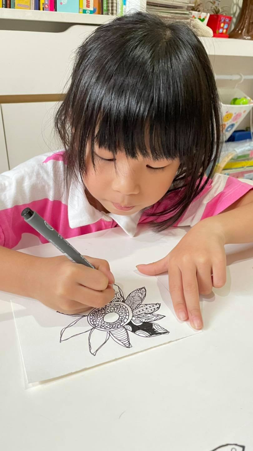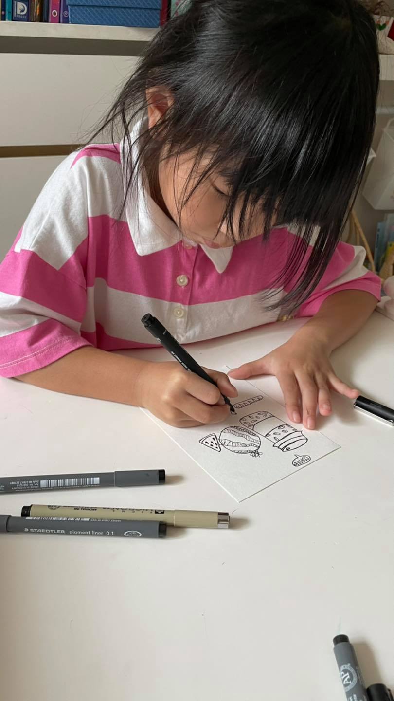จากนั้นก็เตรียมปากกาหมึกดำขนาดหัว 0.1 0.5 และ 1.0 เอาไว้ถมดำและตัดขอบ อาจให้ลองใช้ดินสอก่อนก็ได้ แต่ปริมปรางใช้ปากกาลุยเลยค่ะ เราใช้ขนาดหัวปากกาหลากหลายเพิ่อช่วยเพิ่มมิติให้รูปค่ะ ลูกยังค่อนข้างสับสนระหว่างตัวเลขจุดทศนิยมอยู่บ้าง ก็ค่อยๆสอนไปค่ะ