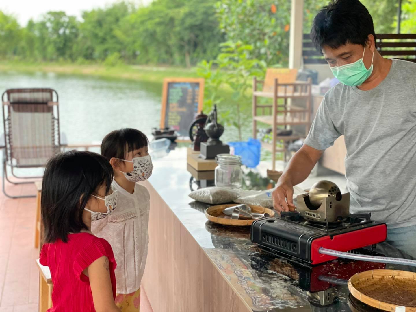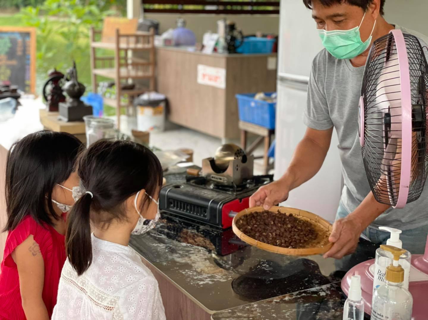 จากนั้นได้มาดูวิธีการทำกาแฟ คุณลุงเจ้าของบ่อใจดีมากช่วยสอนวิธีทำกาแฟสดให้เด็กๆด้วยค่ะ เริ่มตั้งแต่เมล็ดกาแฟ นำมาคั่ว นำมาบด วิธีการชง เด็กๆสนใจกันมากถามคำถามรัวๆ กลิ่นกาแฟคั่วก็หอมมากๆแต่ดื่มตอนนี้แม่จะตาค้างไม่ได้นอนพอดี