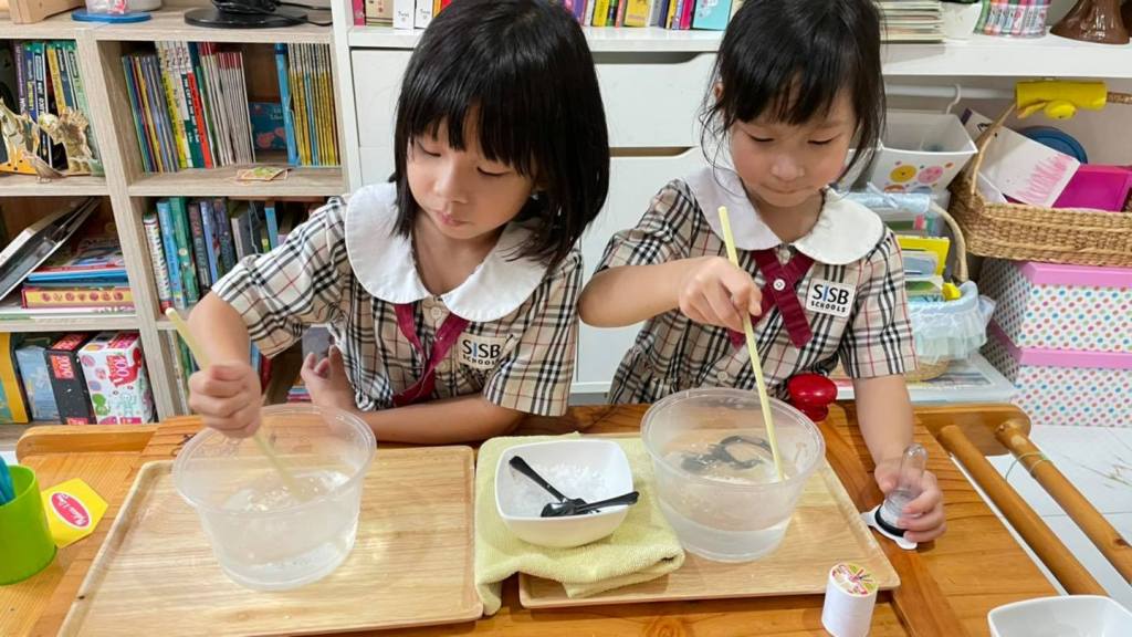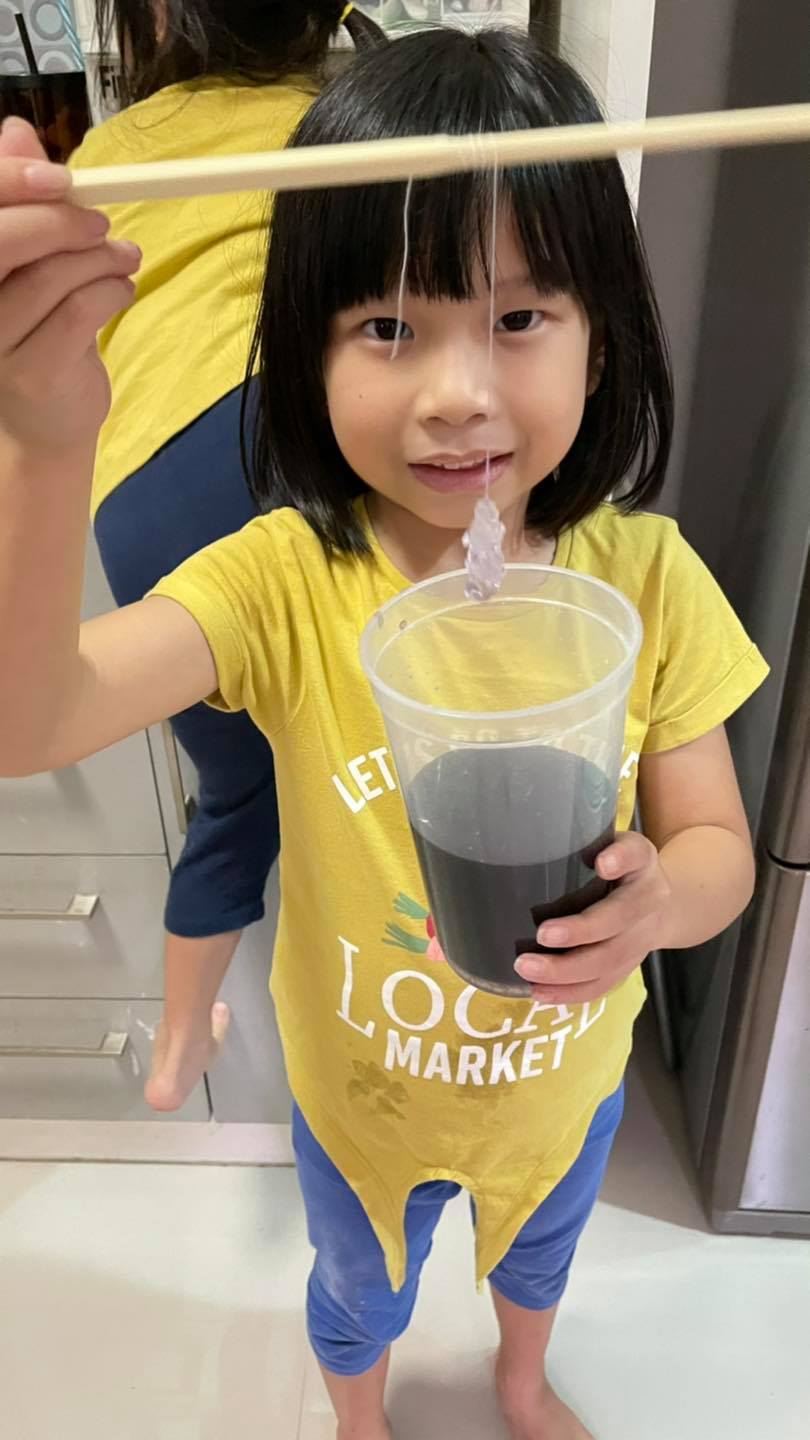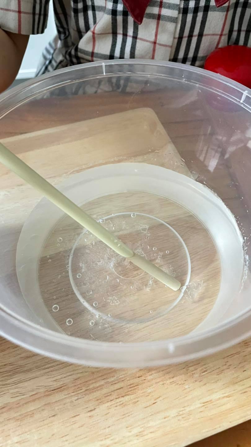เริ่มแรกคือเตรียมน้ำอุณหภูมิห้องมาแล้วค่อยๆเติมสารส้มลงไป กวนจนละลายหมด ให้ลูกสังเกตดูว่ามันหายไปจนเรามองไม่เห็นผงสารส้มเลยค่ะ ใส่ไปเรื่อยๆจนมันไม่ละลาย