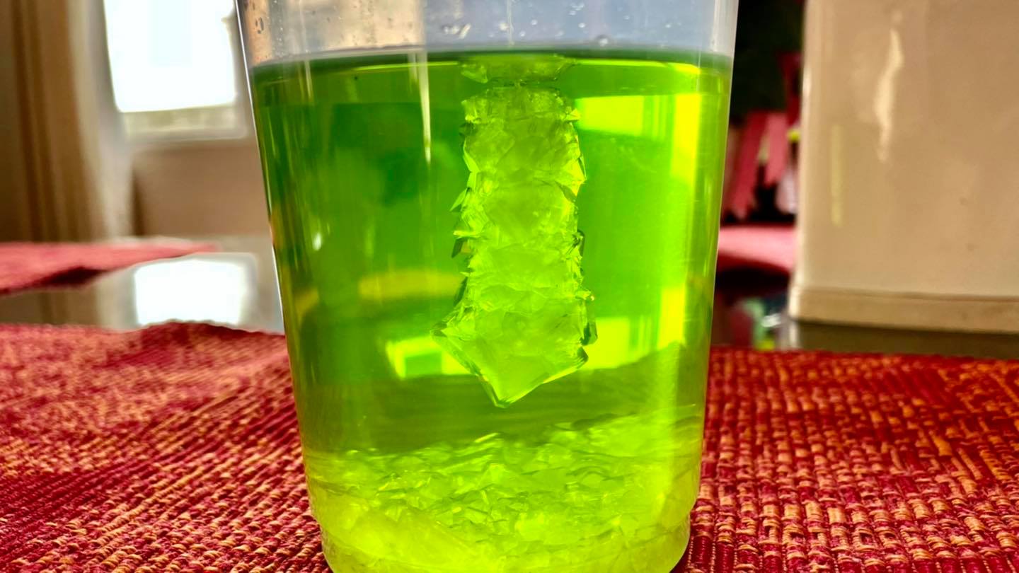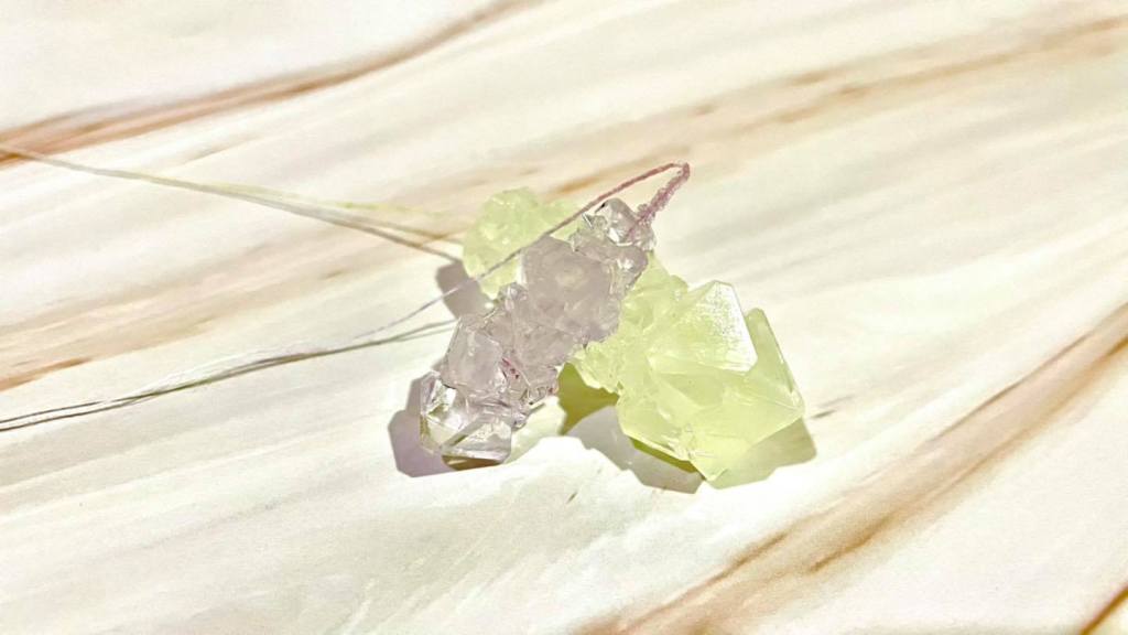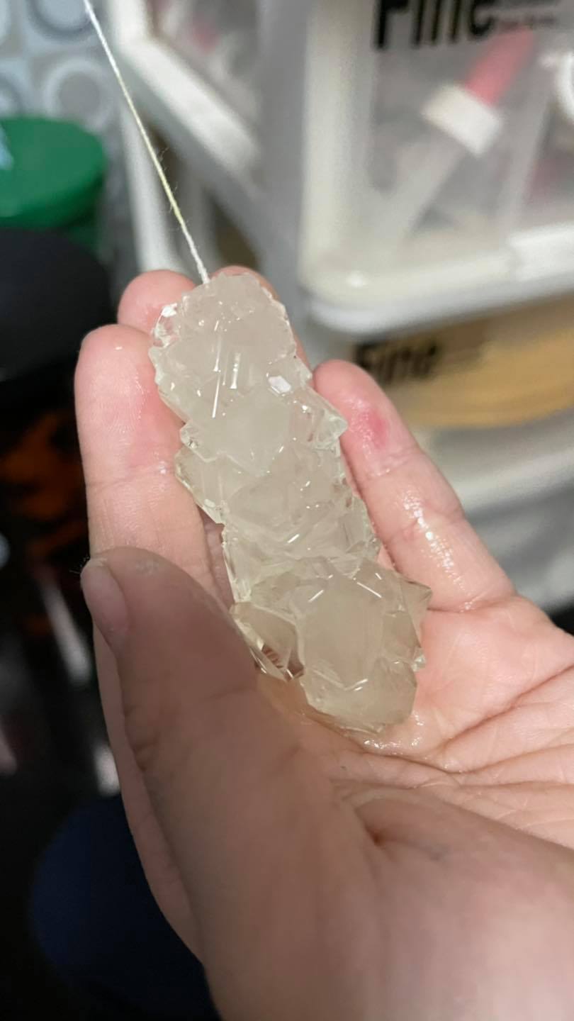 จากนั้นมัดปมเส้นด้ายเพื่อให้ผลึกมาเกาะตรงนี้ แช่ทิ้งไว้ 1 คืนค่ะ แต่จริงๆไม่กี่ชั่วโมงมันก็เริ่มมาเกาะ เริ่มโตแล้วค่ะ ถ้าอยากให้ผลึกโตสวยๆต้องค่อยๆลดอุณหภูมิลงนะคะ อาจเอามาขนหนูมาห่อแก้วไว้ค่ะ ถ้าเอาไปแช่น้ำ หรือแช่ตู้เย็นเร่งการตกผลึกมันจะได้ผลึกเม็ดเล็กๆไม่สวยค่ะ