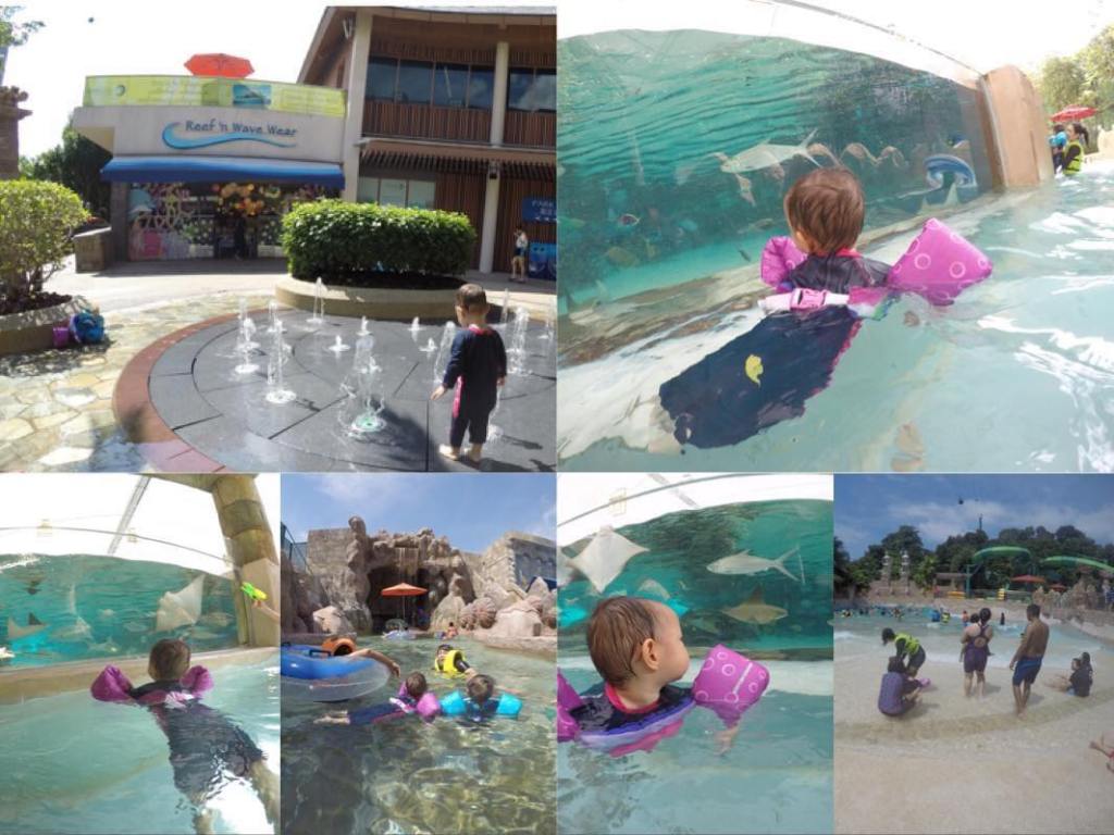 จุดลงน้ำมีหลายจุดนะคะ เดินเข้าไปด้านในเริ่มที่ Seahorseaway ดีกว่าค่ะ เป็นจุดเล่นน้ำสำหรับเด็ก (ถ้าถอดรองเท้าวางไว้แต่แรก พอเดินเข้าไปด้านในเจ็บเท้ามากค่ะ เค้าทำพื้นแบบกันลื่นซึ่งเจ็บมากถ้าถอดรองเท้าเดิน) ด้านในมีหลายโซนมากทั้งวันรุ่น เด็กเล็ก เด็กโต สไลเดอร์ คลื่นทะเลเทียม จุดน้ำตก จุดเขาวงกต เป็นสวนน้ำที่ครบเครื่องมากค่ะ แต่สำหรับลูกเล็กอย่างเราเอาแค่ว่ายน้ำรอบๆดูปลาก็สนึกแล้วค่ะ รอบหนึ่งยาวประมาณ 1.5 km มีจุดขึ้นให้พักเป็นระยะค่ะ แถมมีการ์ดตลอด อุปกรณ์ห่วงยางชูชีพมีบริการฟรี แต่ของเรา 1.7 ขวบเลยเอาไปเองค่ะ เพราะลูกเล็กกว่ามาตรฐานกลัวไม่มีไซส์ ถ้าไปช่วงเทศกาลคนจะเยอะมาก บางจุดต้องรอเสื้อชูชีพค่ะ น้ำไม่ลึกเลยค่ะยืนได้สบาย ระยะทางที่ลอยตัวไปมีจุดผ่านน้ำตกเป็นช่วงๆ ให้ตื่นเต้น ผ่านอุโมงค์ค้างคาว มืดๆช่วงสั้นๆ ที่พีคสุดคือว่ายน้ำไปกับฝูงปลา และปลากระเบน แต่เค้ามีกระจกกั้นนะคะ แต่ราวกับว่าได้ว่ายน้ำอยู่ใกล้กันค่ะ
