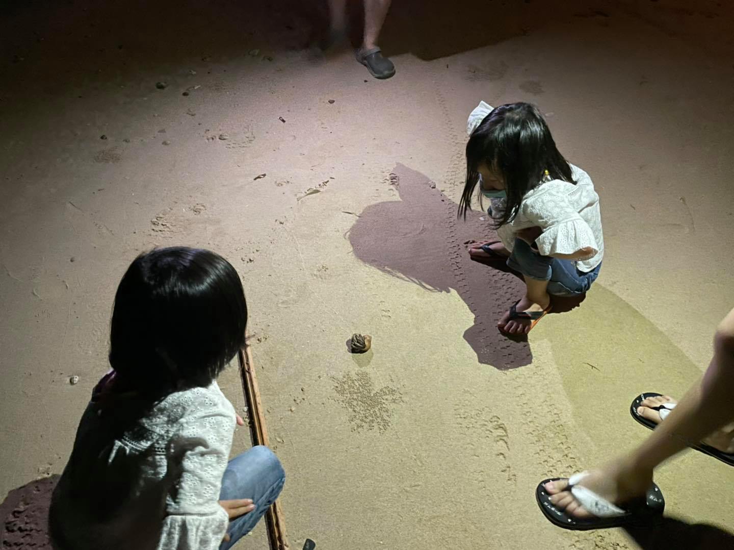 ปกติทั่วไปหลังจากเล่นน้ำ เล่นทรายจนเหนื่อย ก็จะพาเด็กอาบน้ำเตรียมนอน แต่วันนี้เปลี่ยนบรรยากาศ ท้องทะเลมืดสนิท ไร้ผู้คน มีแค่แสงไฟจากเรือประมงเล็กๆสีเขียว สีส้มเป็นจุดเล็กๆเท่านั้น ชายหาดเงียบสงบมาก