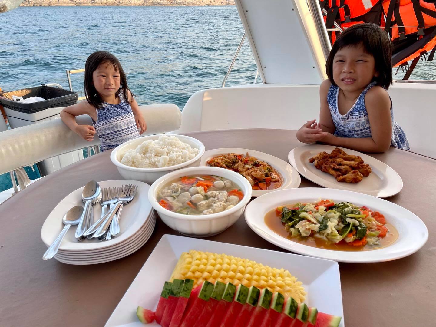 บนเรือจะมีบริการอาหาร ผลไม้และเครื่องดื่มพร้อมมาก มีห้องน้ำห้องอาบน้ำด้านในเรือ ครัว มีมุมนั่งเล่นพักผ่อนบนเรือ แพคเกจเรือที่เราเลือกมีพาไปดำน้ำตื้น (Snorkel) หลังเกาะ พายเรือคะยักท้องใสดูปลาด้วย แต่ลูกมัวแต่เล่นบนเกาะค่ะ 555+