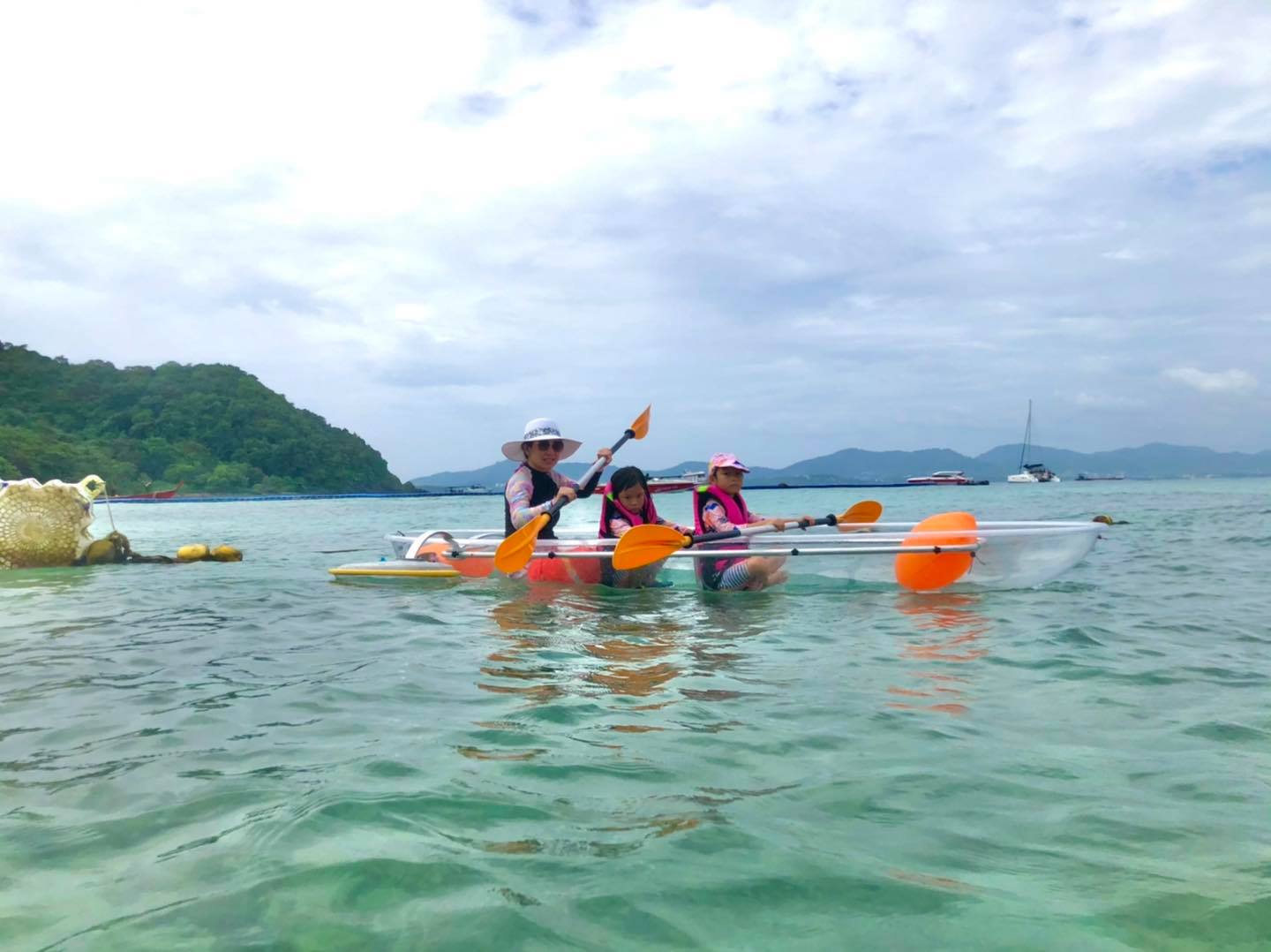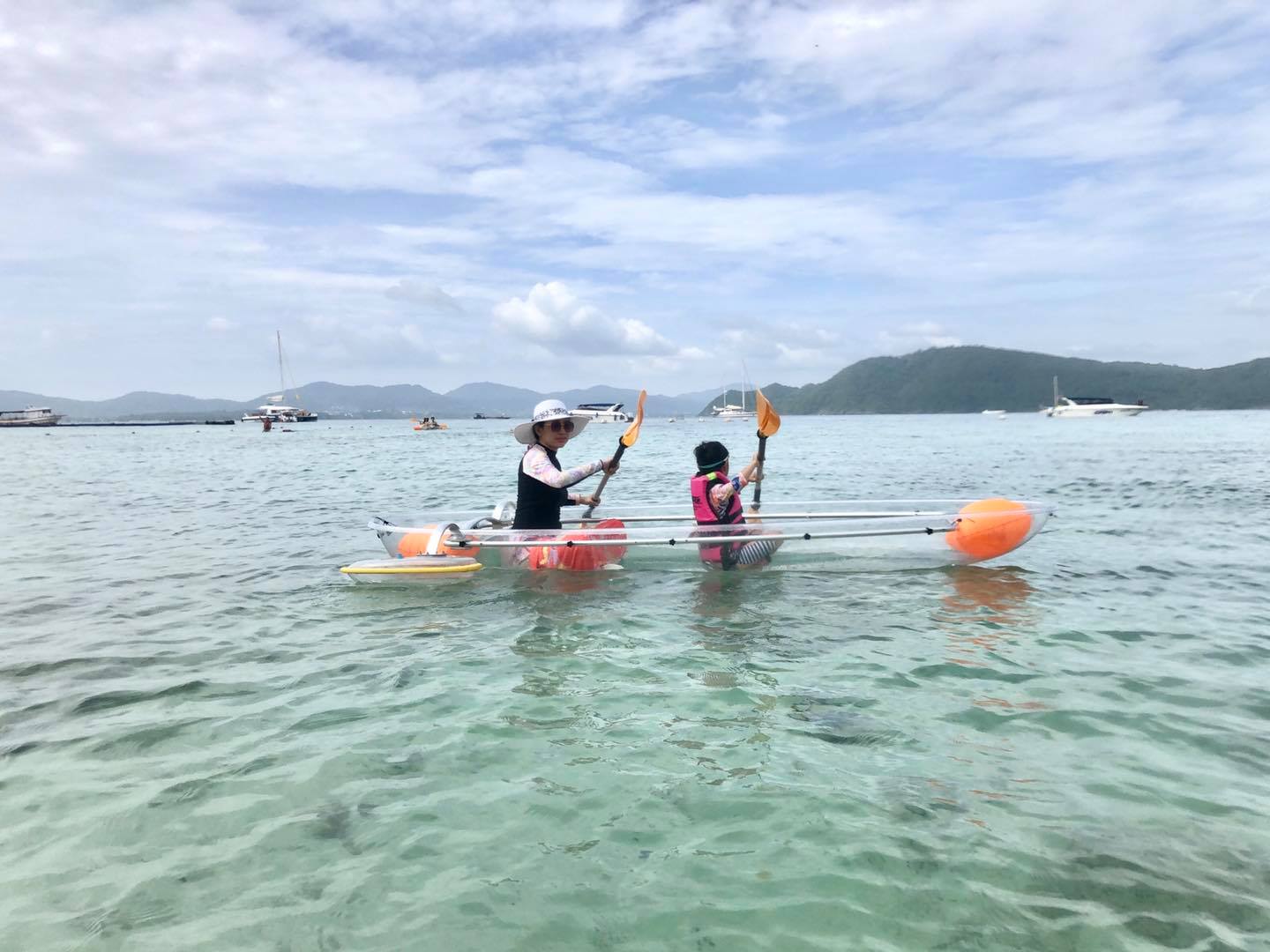 นอกจากนั้นก็คือเล่นน้ำทะเล น้ำนี่ใสสวยมาก ขนาดช่วงนี้ฝนตกน้ำจะขุ่นแต่ก็ยังใสอยู่เลยค่ะ เราเช่าเรือกระจกมาเล่น (350 บาท/ชม.) ตัวเรือใสเห็นฝูงปลาใต้ท้องเรือ เราพายวนดูสัตว์ใต้ทะเลกันสนุกมากค่ะ เจอปลานกแก้ว ปลาดาวสีต่างๆ สนุกกันมาก แม่เตรียมอุปกรณ์เล่นทรายไปด้วยไม่สนใจเลยค่ะ