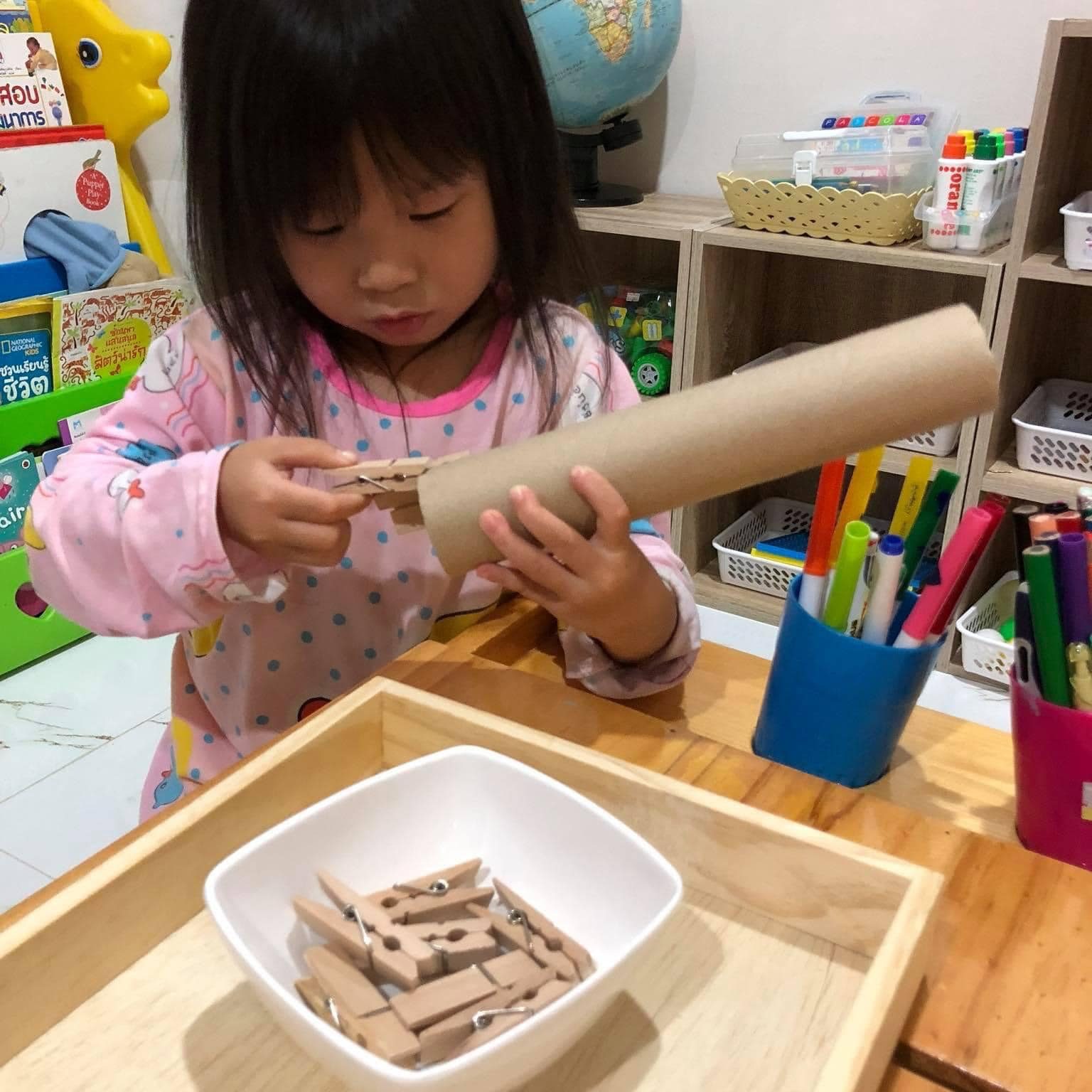 13. เล่นไม้หนีบผ้า ใช้แกนกระดาษทิชชูเหลือใช้แล้วหนีบด้วยมือข้างเดียว ช่วงวัยเล็กลูกมักจะใช้สองมือช่วยดันกดไม้หนีบผ้าค่ะ แต่วันนี้เรากำหนดให้มือข้างหนึ่งต้องจับแกนกระดาษทิชชู ก็เป็นเรื่องยากพอสมควรที่จะควบคุมด้วยมือข้างเดียว