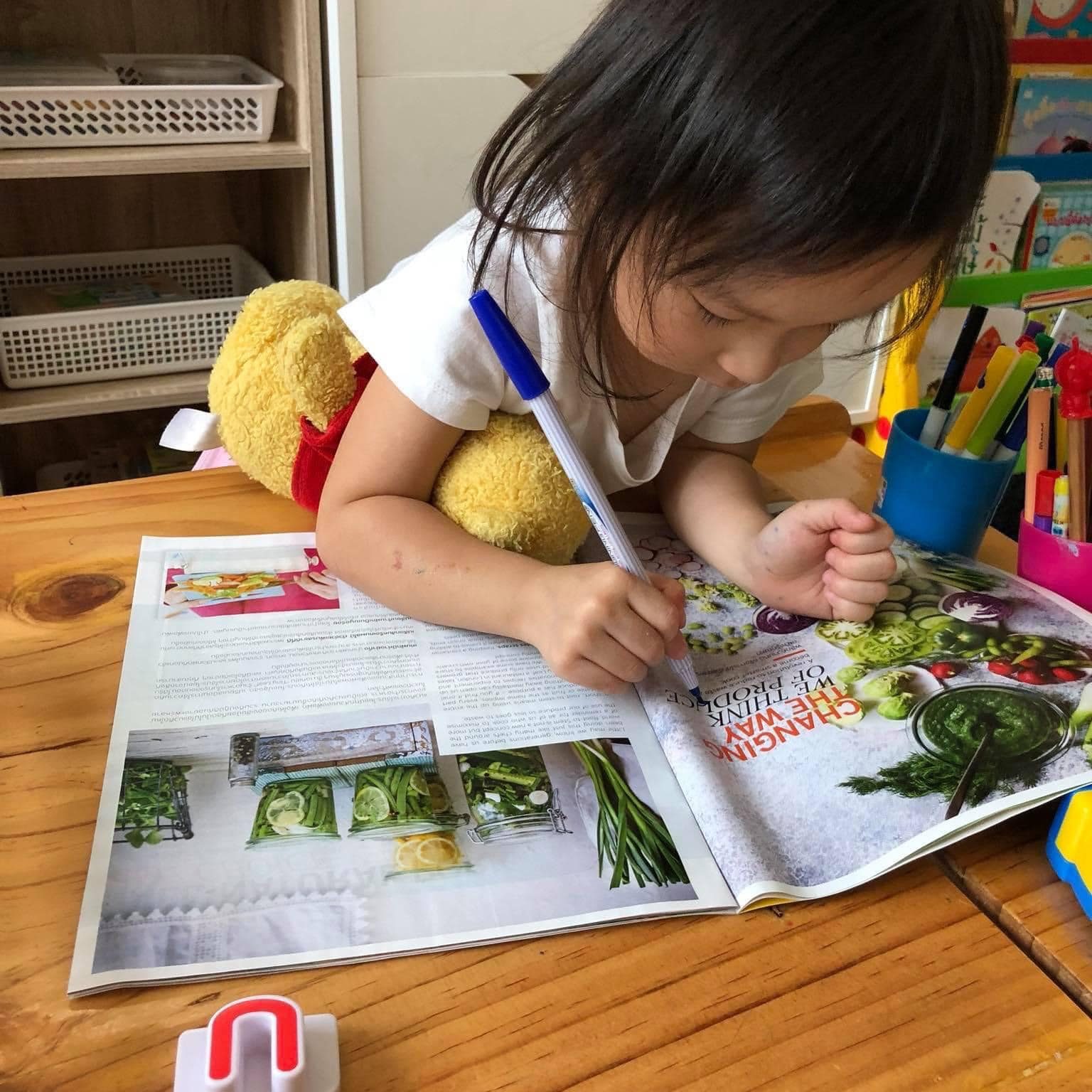 7. เล่นหาตัวอักษร หาตัวอักษรที่ซ่อนอยู่ในนิตยสารเก่าๆเหลือใช้ ได้ฝึกความช่างสังเกตแถมเรียนรู้คำศัพท์มากมายในนิตยสารที่เล่นอีกด้วยค่ะ