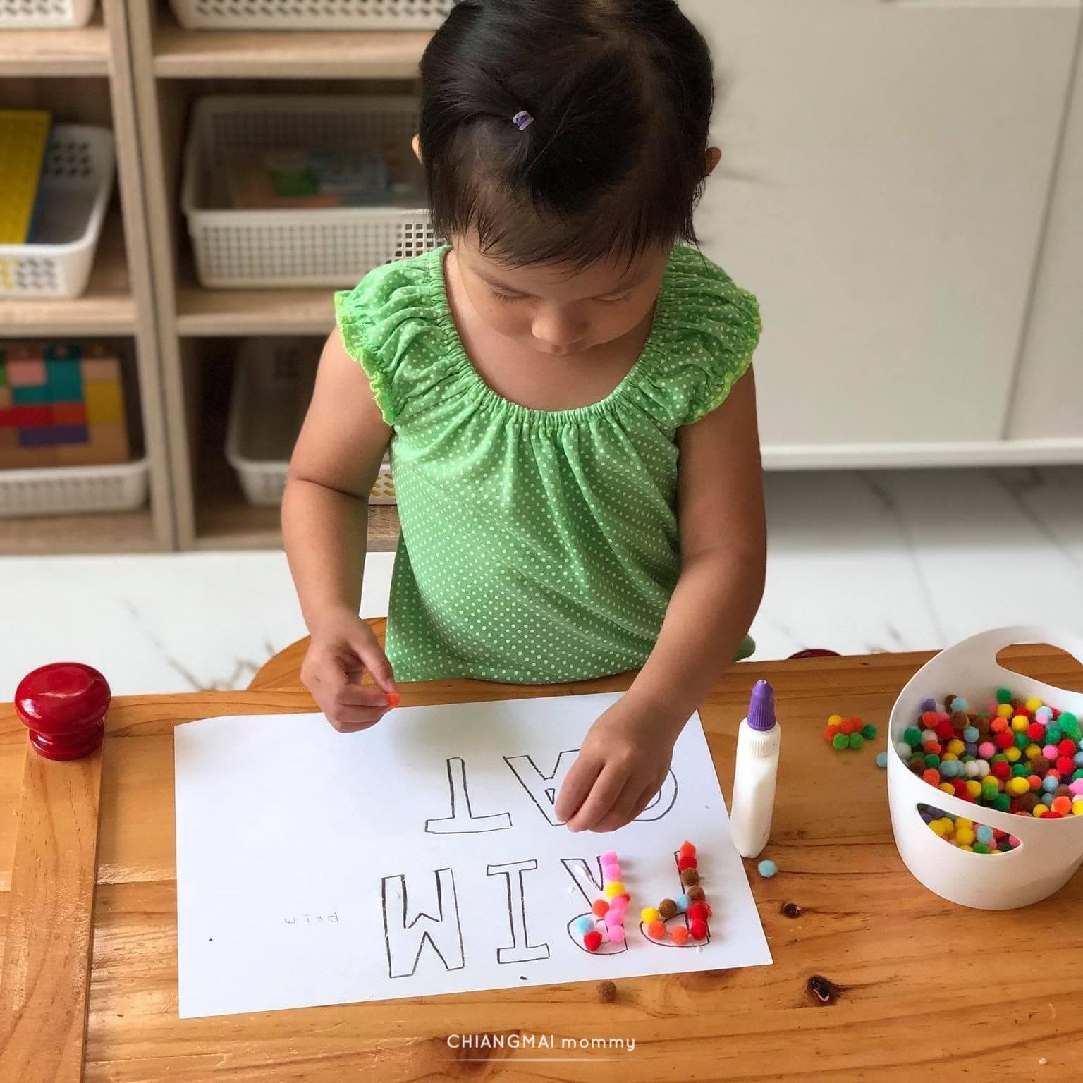 18. คำศัพท์แฟนซี จะวาดหรือจะพิมพ์คำศัพท์ที่ต้องการสอนแล้วให้เด็กๆหยิบชิ้นงานเล็กๆติดกาวเรียงลงไป ยิ่งของมีชิ้นเล็กมากเด็กๆยิ่งจะได้ฝึกการควบคุมนิ้วมือมากขึ้น กรณีที่กาวติดมือก็ยิ่งหยิบยากขึ้นอีกค่ะ ท้าทายความสามารถและความพยายามมาก แถมได้เรียนรู้คำศัพท์ไปในตัว