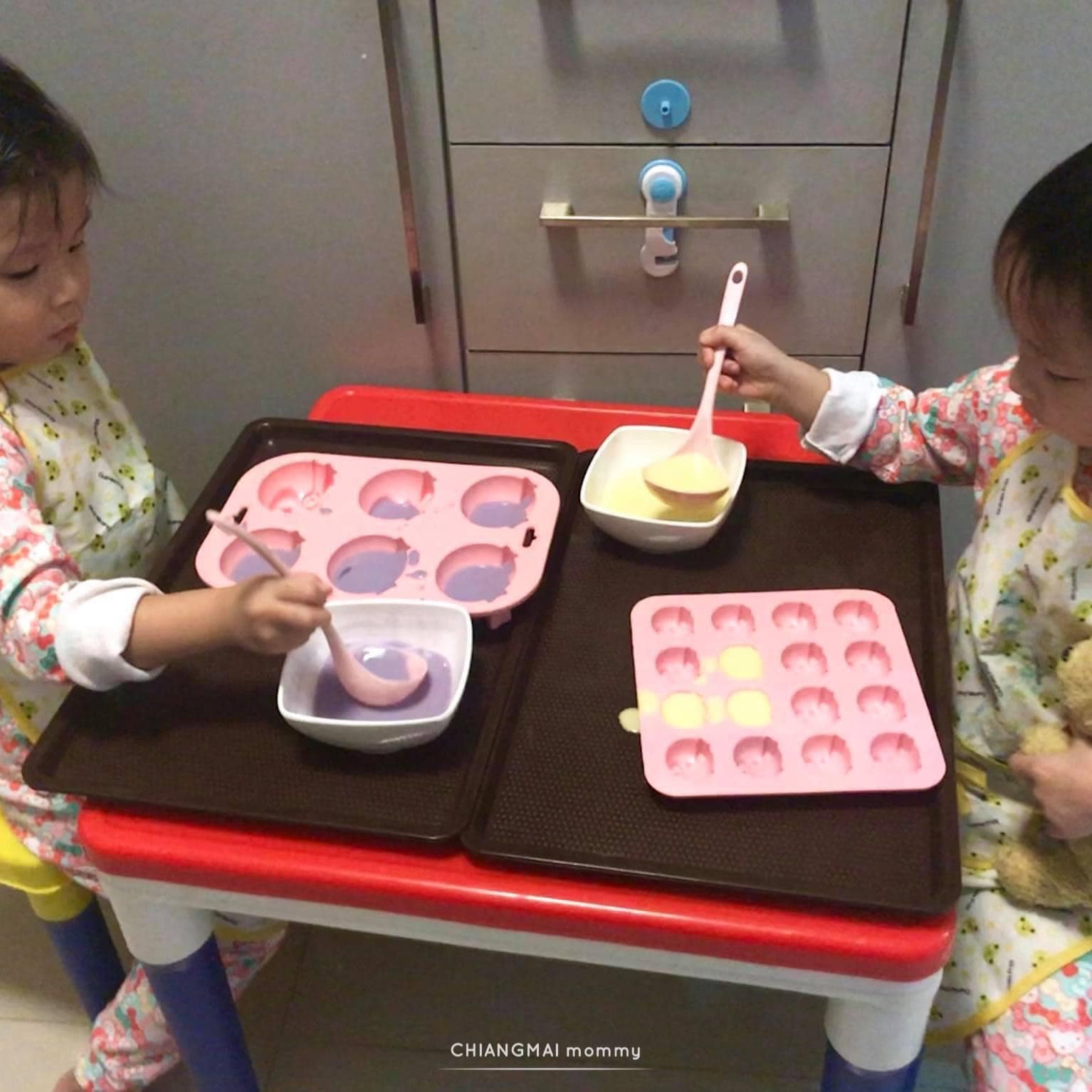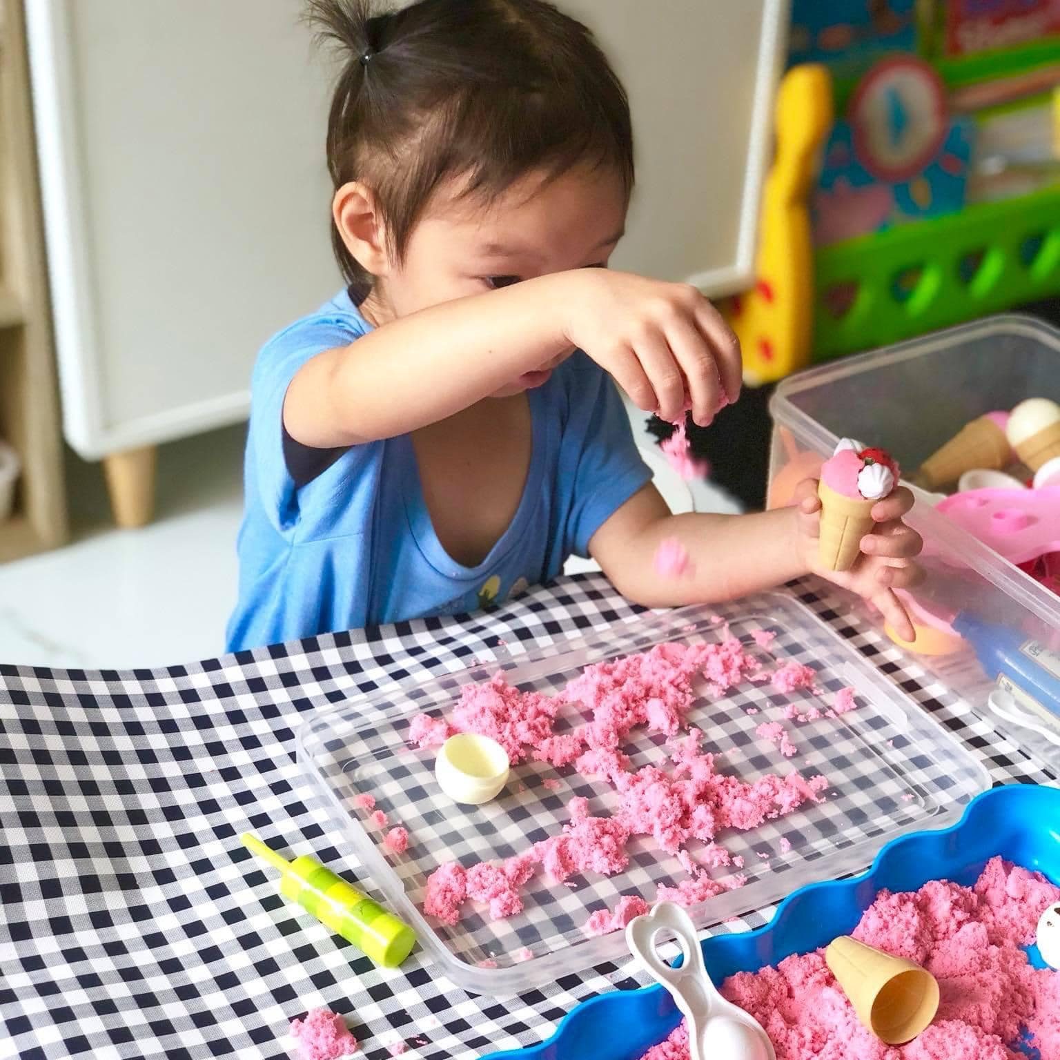 3. Sand Play เล่นทรายวิทยาศาสตร์ หรือ Kinetic Sand ไม่ฟุ้ง ไม่เลอะ (มาก) เก็บกวาดง่าย สามารถเล่นในบ้านได้ อาจเล่นทรายสำเร็จรูปหรือ DIY ทำเองก็ได้ค่ะ ไม่ยากเท่าไร