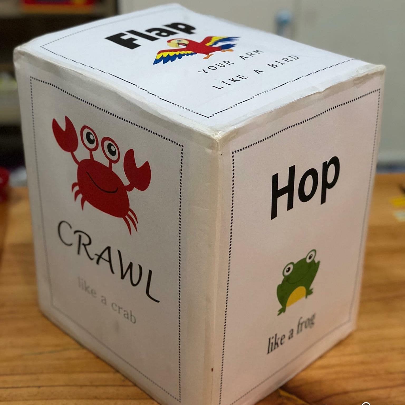 2. ฉันคือสัตว์อะไร หากล่องกระดาษเปล่าห่อด้วยกระดาษสีขาว แปะด้วยรูปสัตว์ที่ทำท่าทางต่างๆกันหรือจะเขียนชื่อสัตว์ลงไป ให้เด็กๆโยนลูกเต๋าแล้วทำท่าทางเหมือนสัตว์ชนิดนั้น ฝึกกล้ามเนื้อมัดใหญ่