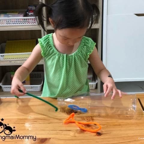 11. ตกปลาในขวด ใช้ลวดกำมะหยี่ขดเป็นรูปปลาใส่ในขวดปากแคบ แล้วให้เด็กๆหาวิธีเอาปลาออกมาจากปากขวด เป็นการฝึกเด็กๆใช้สมองแก้ปัญหา หาวิธีเอาปลาออกมาให้ได้ค่ะ อดใจลองให้เด็กๆพยายามกันเองก่อน เค้าจะภูมิใจและสร้างคุณค่าให้กับตัวเองค่ะ