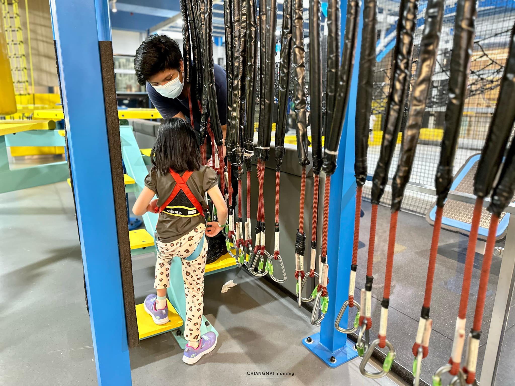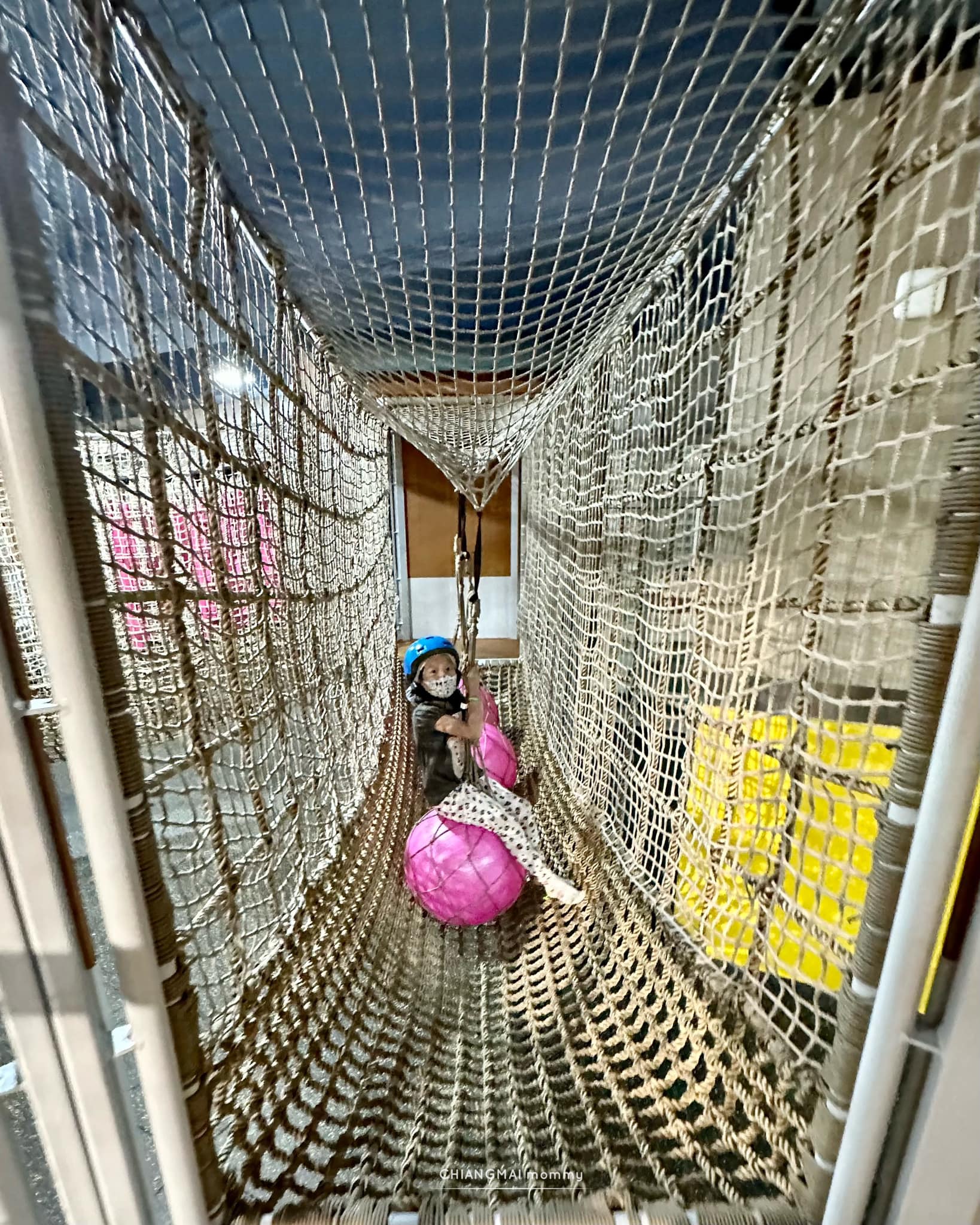 โซน Zipline ผ่านด่านท้าทายต่างๆ อันนี้เด็กๆชอบและเล่นนานสุดละค่ะ ต้องสวมอุปกรณ์เซฟตี้แล้วเดินตามทางที่ออกแบบความยากง่ายแตกต่างกันไปค่ะ ทำดีน่าเล่นมากค่ะ เล่นจนเบื่อไปเลย