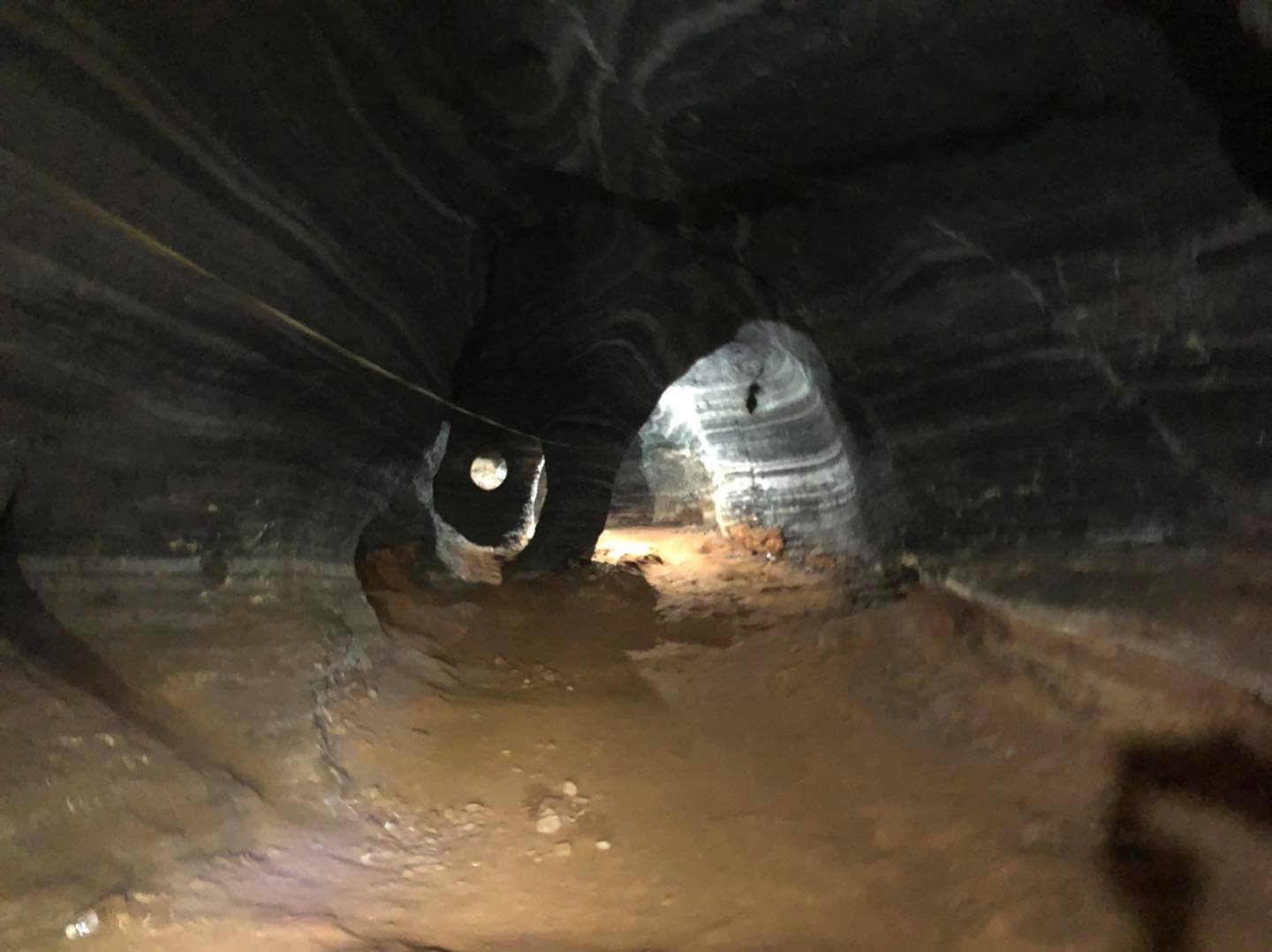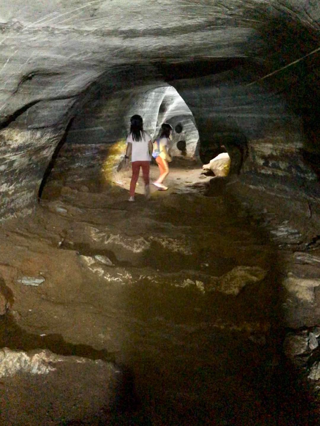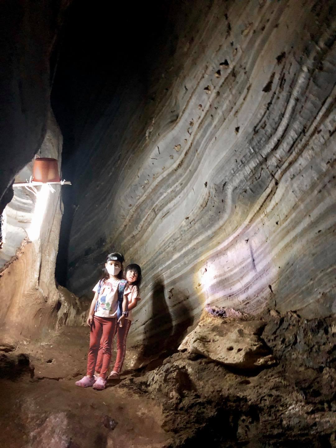 ด้านในเป็นโถงกว้างยาวลึกเข้าไป ดูปลอดภัยแต่ยิ่งลึกทางก็จะแคบมีจุดอันตรายที่เป็นสะพานเชื่อมห้องถัดไปที่รับน้ำหนักได้แค่ครั้งละ 2 คนเท่านั้นค่ะ ตรงนี้จะมืดมากไม่มีแสงสว่างเลยนอกจากแสงไฟฉายที่เราเตรียมไป แต่ภายในถ้ำค่อนข้างอับและหายใจลำบาก เราจึงหยุดสำรวจแค่จุดนี้ เพราะเข้าไปอีกนิดก็จะตันแล้วค่ะ