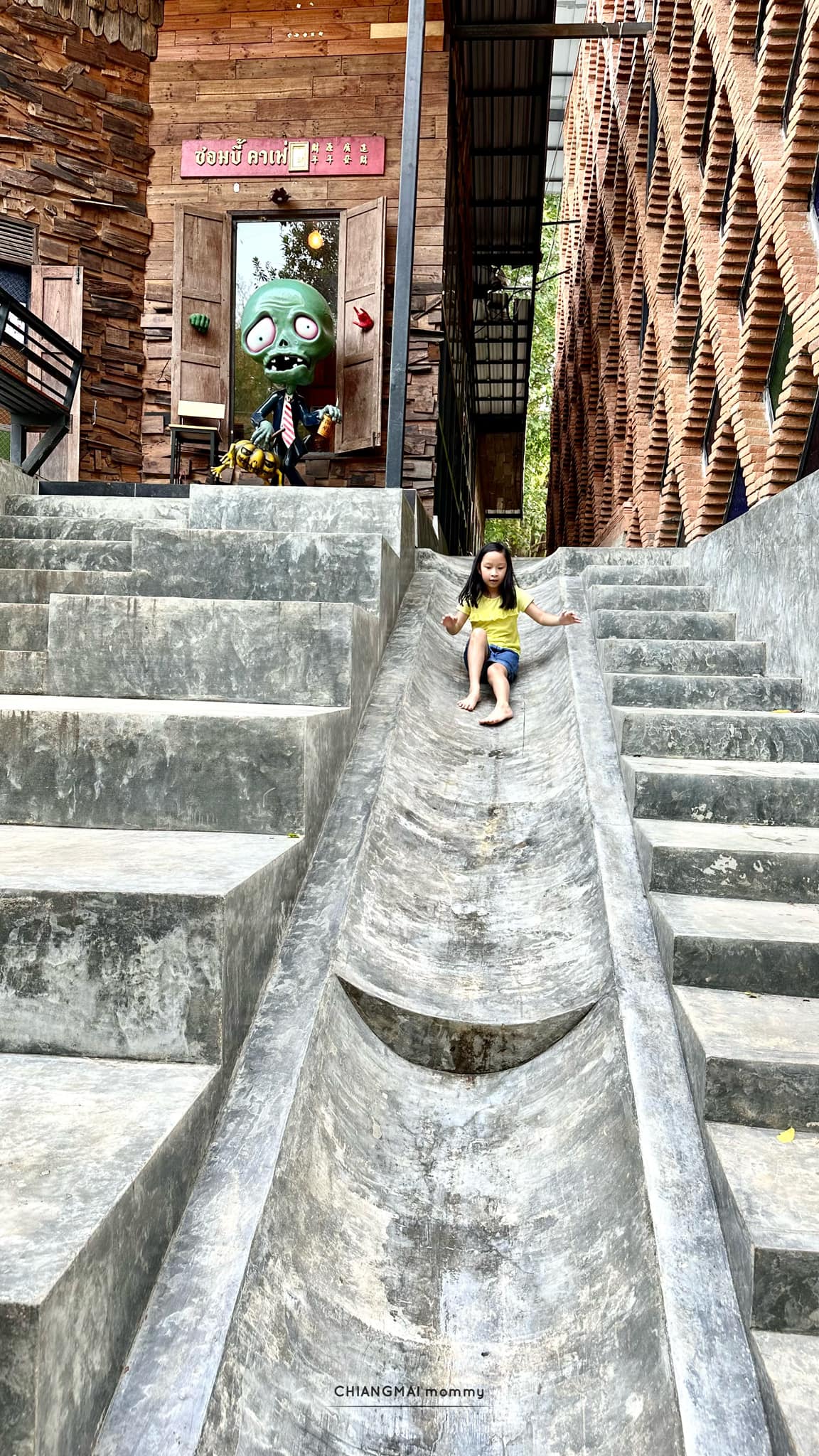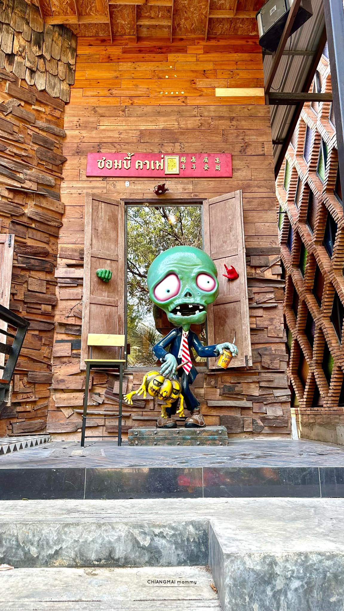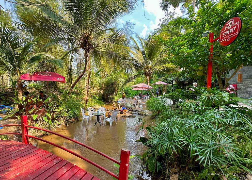 แม่พาเด็กๆไปซอมบี้คาเฟ่ เป็นร้านอาหารที่มีโต๊ะให้นั่งทั้งห้องแอร์ และแช่เท้าในน้ำ ซึ่งน้ำที่นี่ใสสะอาดมากค่ะ เป็นส่วนตัว ในน้ำมีปลา มีกุ้ง มีหอยให้เด็กๆได้สำรวจค้นหาสนุกกันมาก น้ำไม่ลึกด้วยค่ะ ปลอดภัยดีเลย
