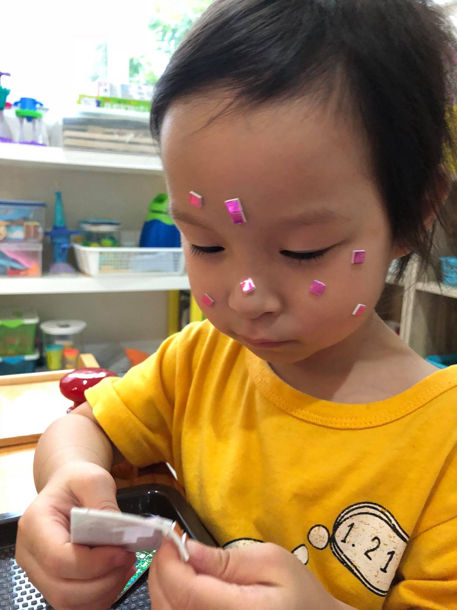 1. ฝึกกล้ามเนื้อนิ้วมือแกะและติดสติ๊กเกอร์ชิ้นเล็กจิ๋ว ซึ่งยากในการควบคุมนิ้วมือค่ะมันชิ้นเล็กมากๆ