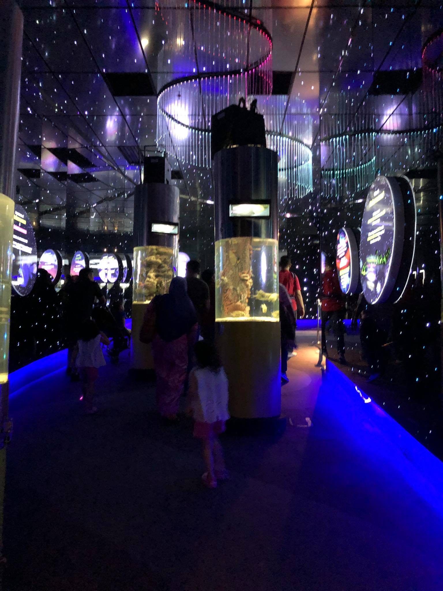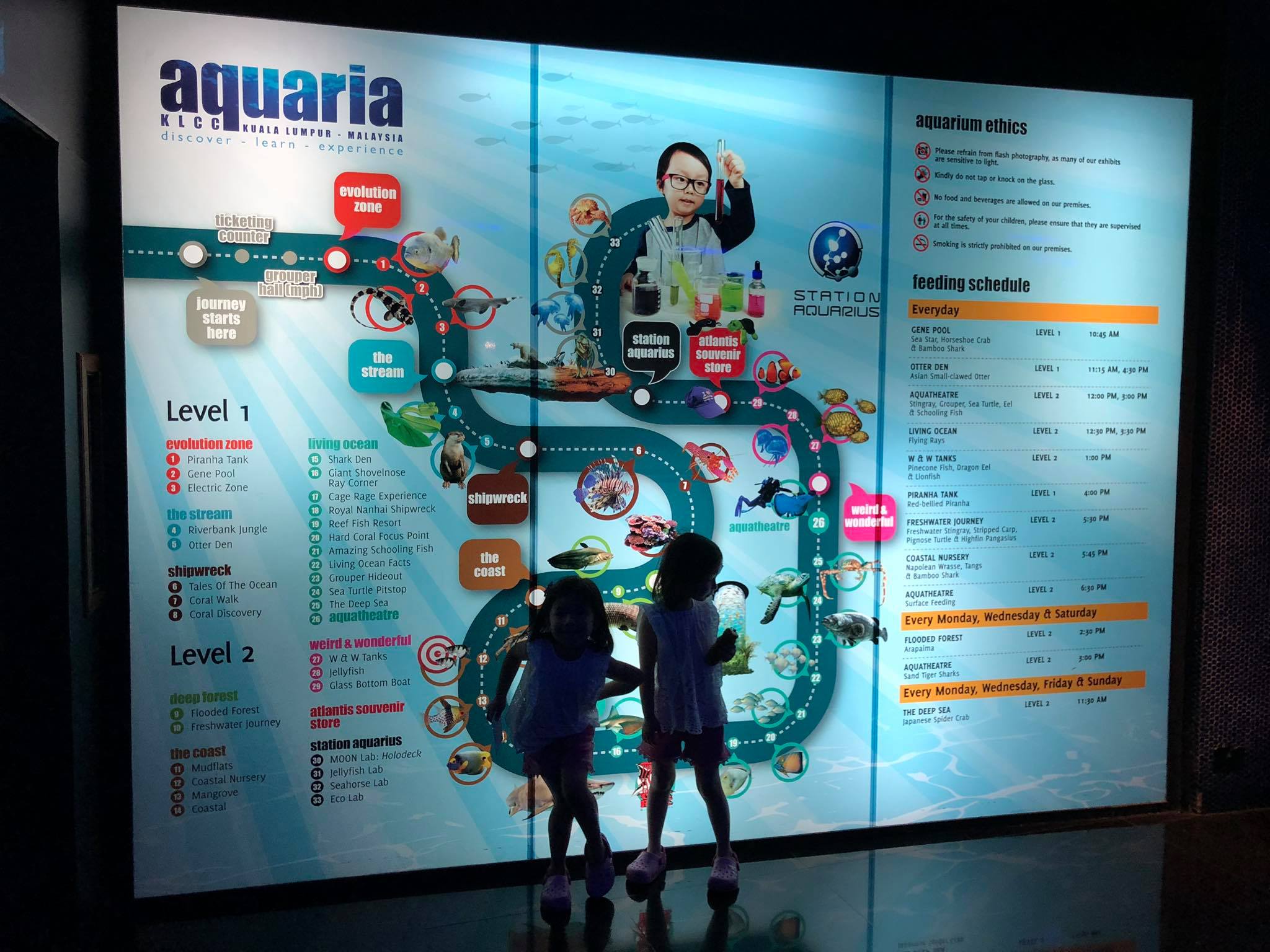 จุดที่ต้องมาเมื่อมาเที่ยวมาเลเซีย คือตึกแฝดปิโตรนาส ซึ่งจะมีห้าง Suria KLCC ให้เดินซื้อของค่ะ ทั้งร้านหนังสือ ร้านแบรด์เนมต่างๆ แต่เราเคยเที่ยว Petrosains ที่ชั้น 4 มาแล้ว ครั้งนี้เลยมาอควาเรียมบ้างซึ่งอยู่ข้างๆกันไม่ไกลกัน โดยเดินผ่านอุโมงค์เชื่อมต่อระหว่างชั้น G จากศูนย์การค้า Suria KLCC ใช้เวลา 5 นาที หรือเดินไปทาง KLCC Park ไปยังทางเข้าฝั่งทิศตะวันตกของ KLCC และเดินต่อไปยัง Aquaria ผ่านทางเชื่อม