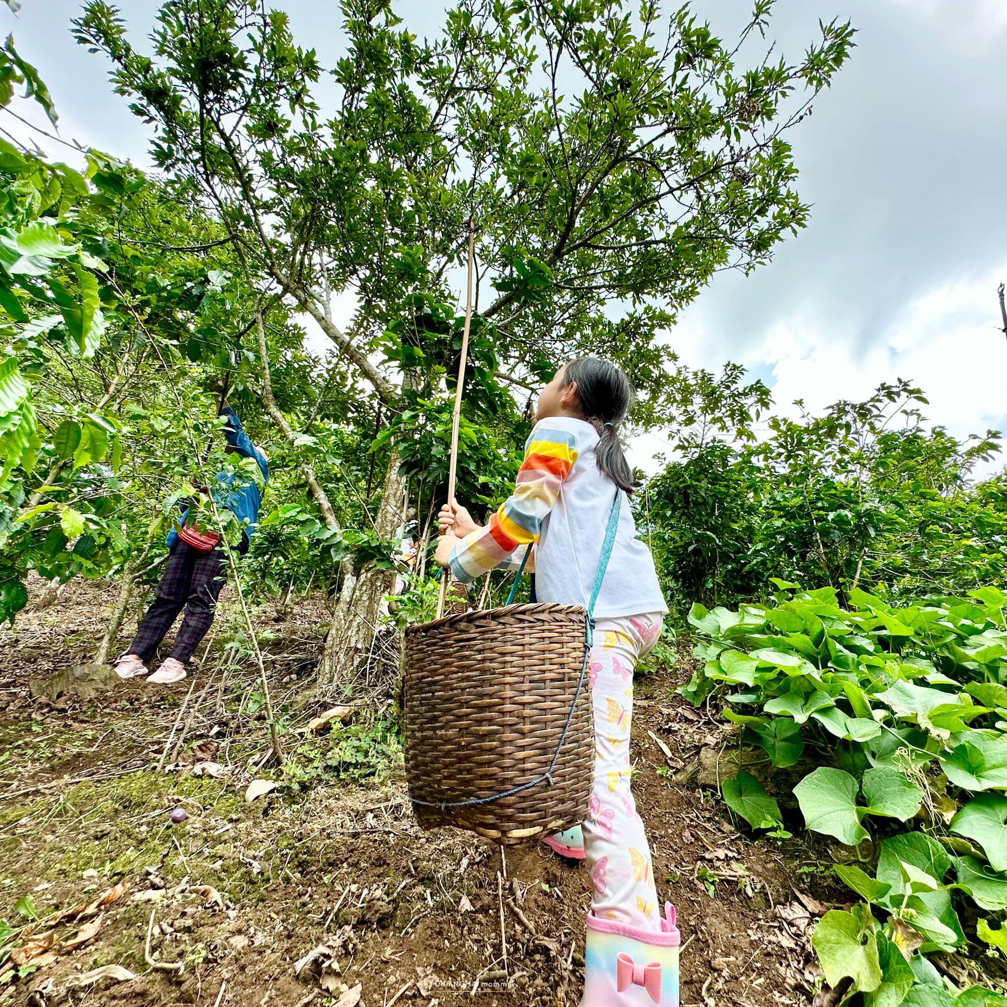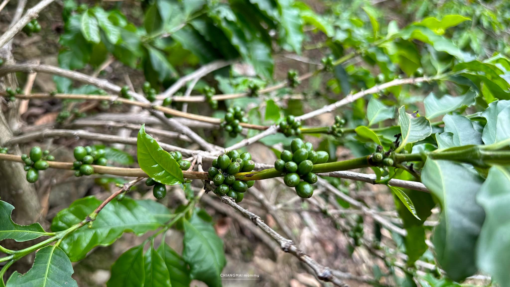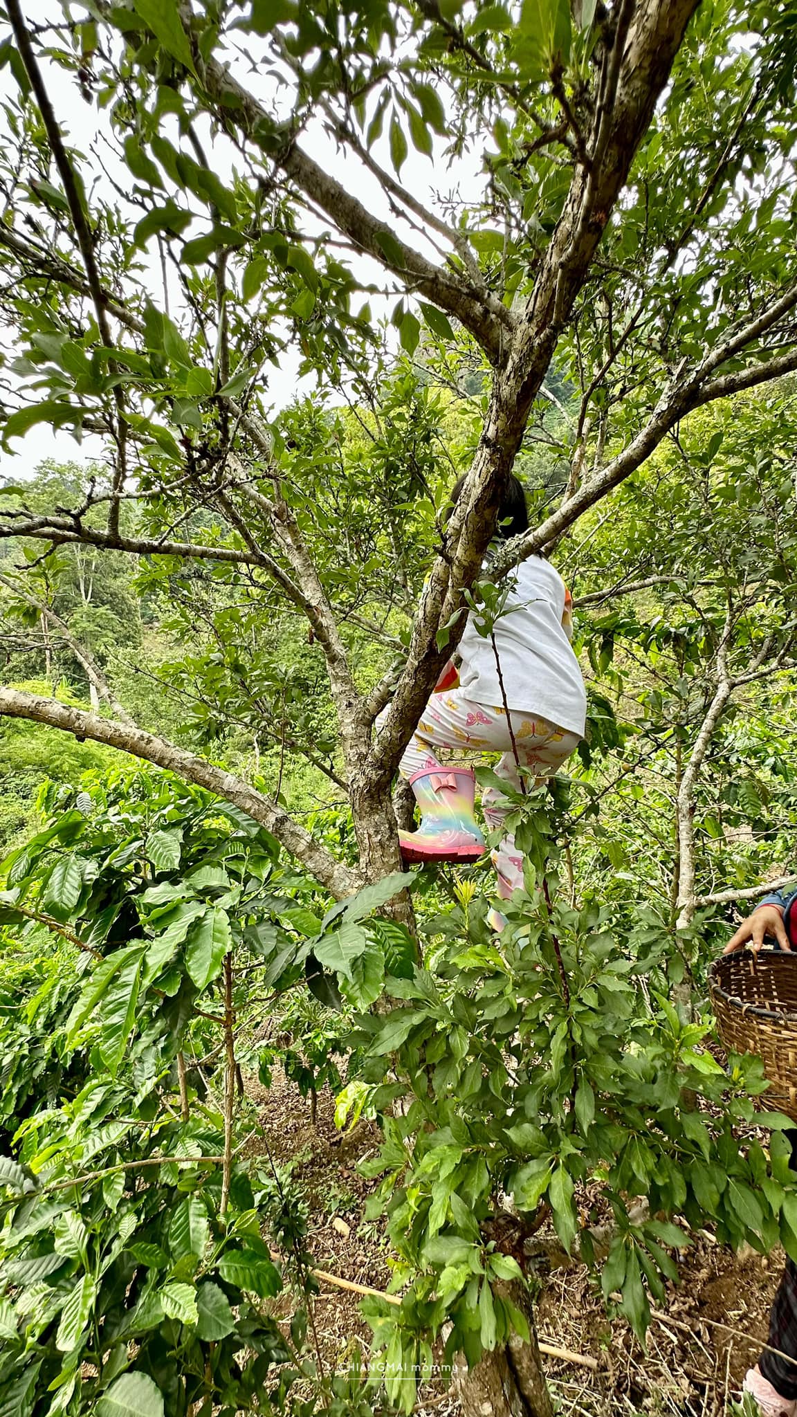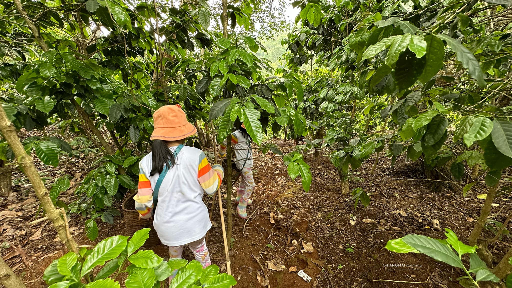 พอเตรียมตัวใส่รองเท้าบูท พ่นกันยุงแล้ว จากนั้นเราก็เดินลงดอยเข้าสวนกาแฟ ไปเก็บเชอรี่ เด็กๆโชว์ทักษะการปีนต้นไม้อย่างคล่องแคล่ว เก็บเชอรี่สนุกกันมาก ได้มาเยอะเลยค่ะ เชอรี่ที่นี่ไม่มีเคมี บางลูกก็แอบมีหนอนมาแย่งกิน ลูกตื่นเต้นที่ต้องกัดแบบระมัดระวัง จากนั้นมีเก็บผักยอดฟักแม้วแล้วก็เก็บแมคคาเดเมีย กินกันแบบทุบสดๆเลยค่ะ อร่อยและสนุกมากๆ