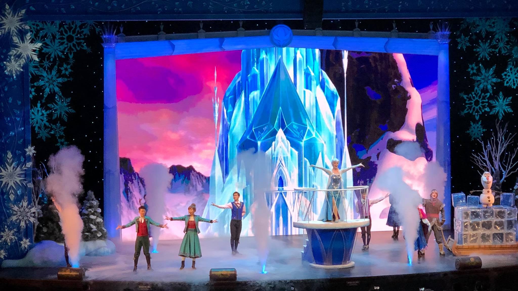 เพื่อดูโชว์ Frozen A sing-Along Celebrations ที่นี่เปิดเป็นรอบการแสดงซึ่งมีแต่ภาษาจีนค่ะ ถึงจะฟังไม่ออกก็ยังตื่นตาตื่นใจค่ะ let’s it go ภาษาจีน เราก็ร้องตามได้ค่ะ