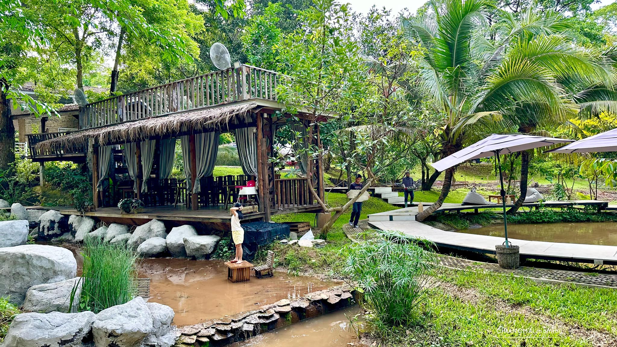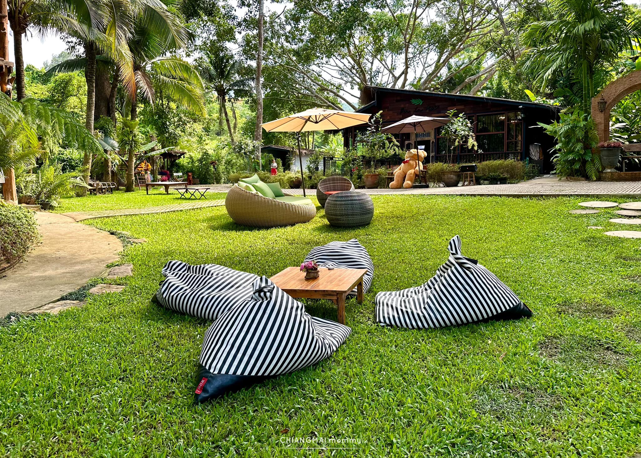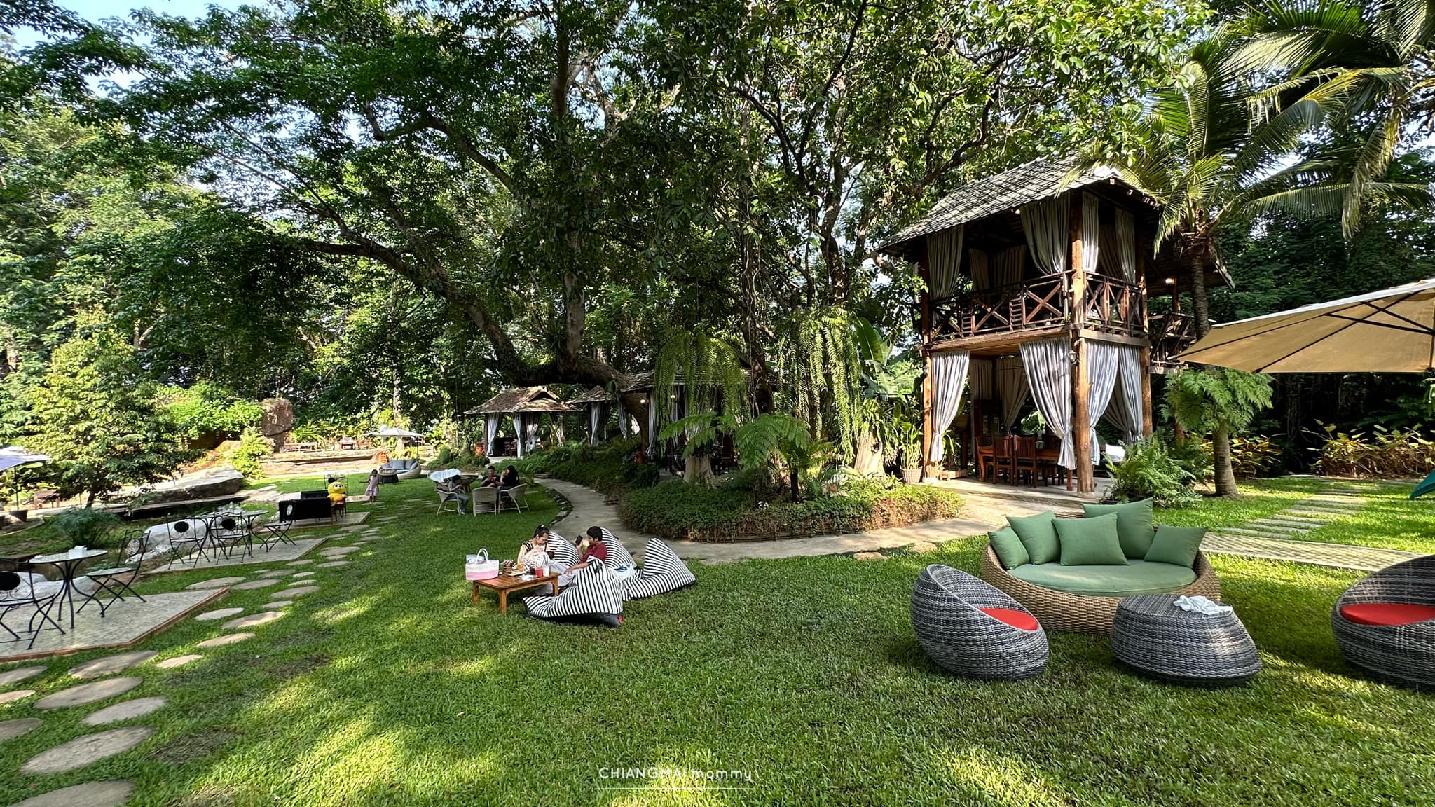 พื้นที่เต็มไปด้วยต้นไม้ใหญ่ๆเพียบ มีสนามหญ้าสีเขียว ลำธารธรรมชาติ น้ำตกจำลอง และมีเมนูอาหาร เครื่องดื่ม ขนมอร่อยๆ