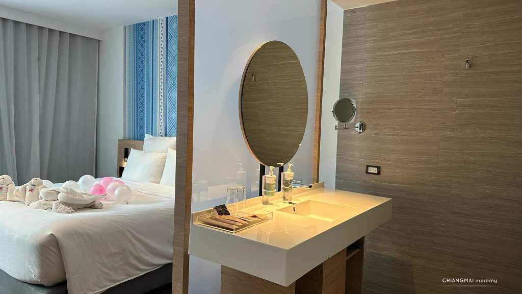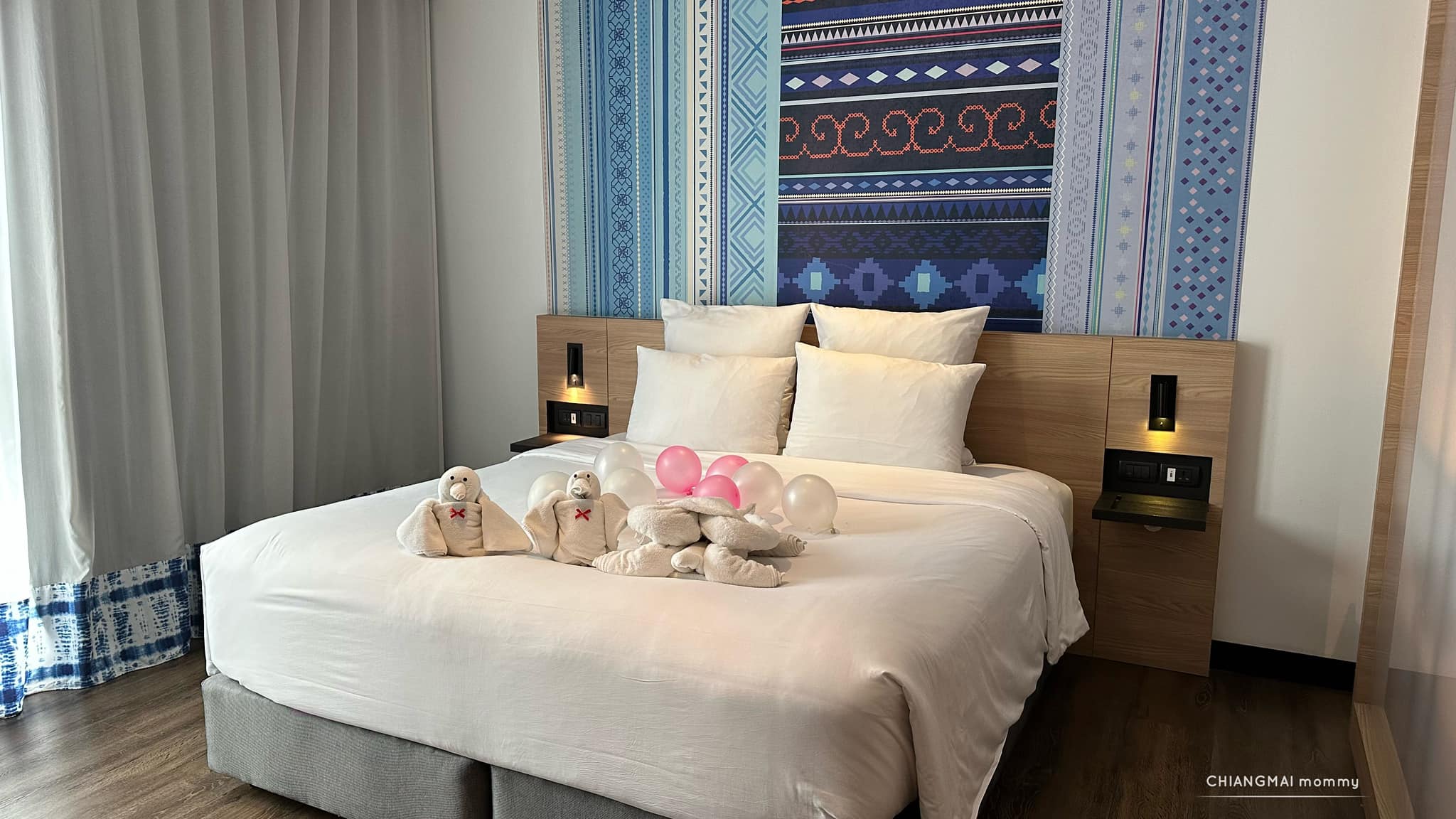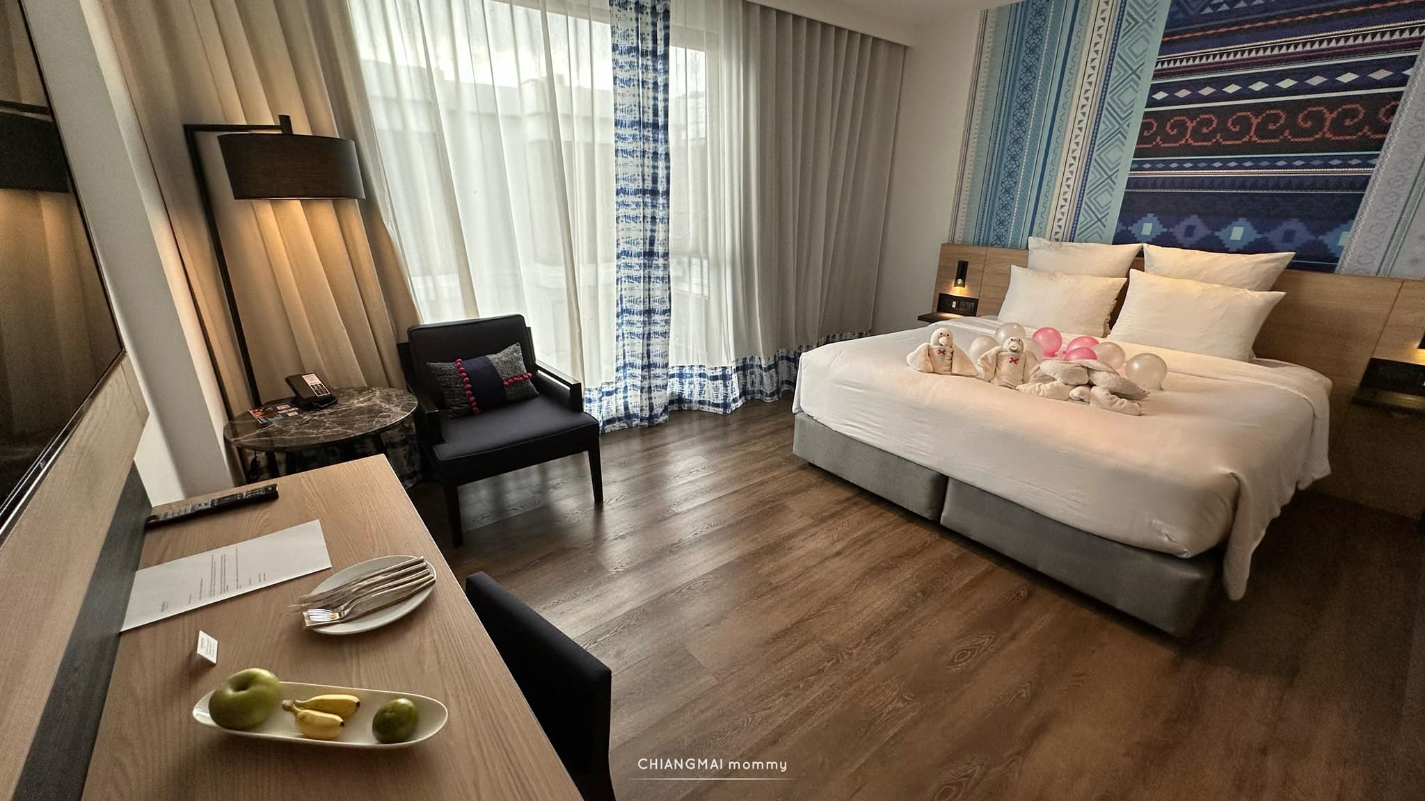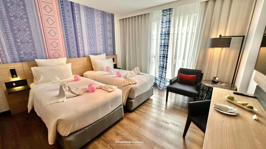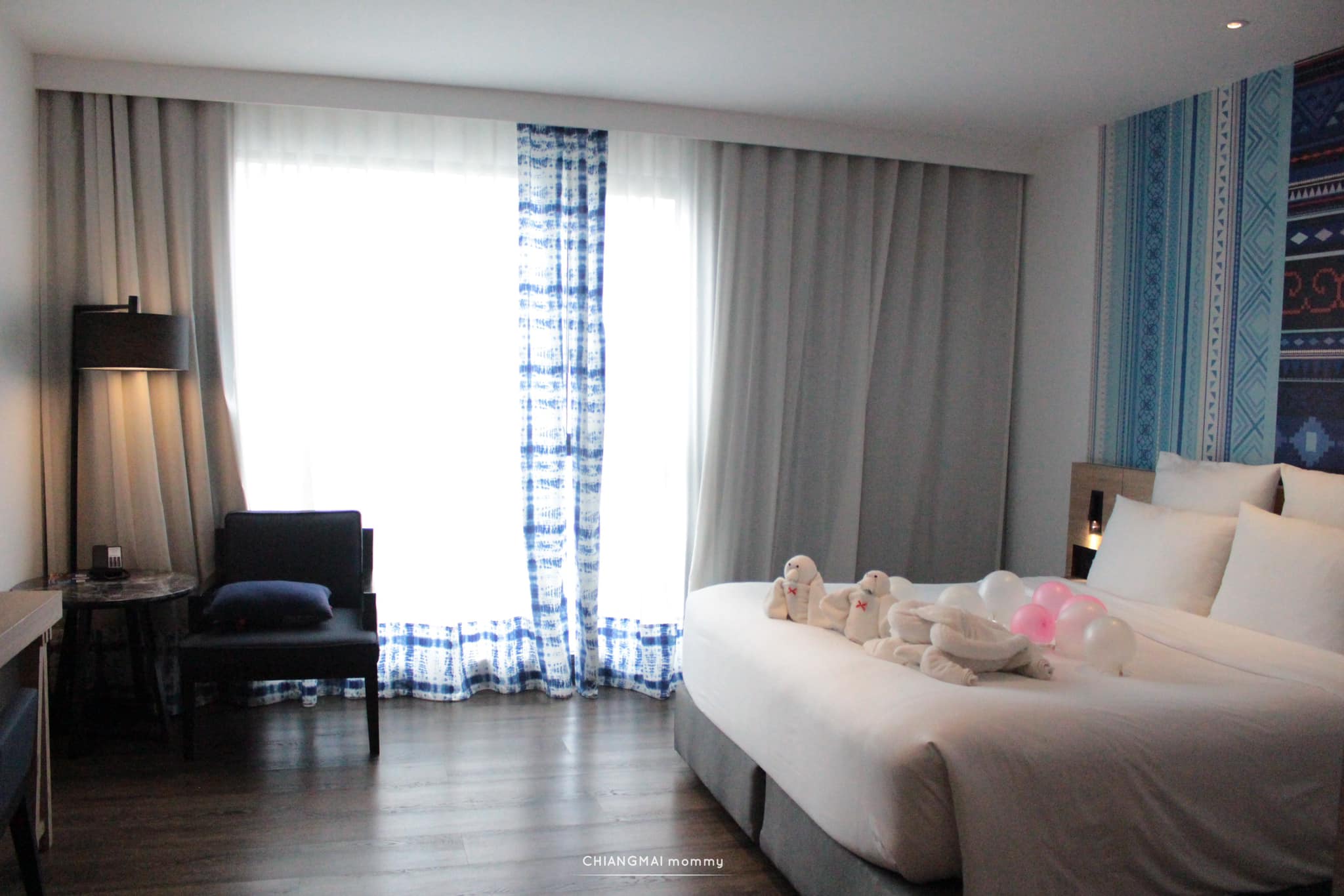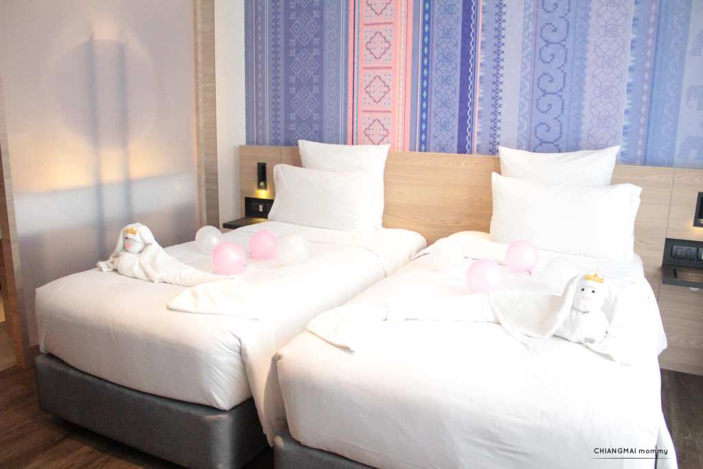 ตัวโรงแรมจะตกแต่งสไตล์ล้านนาสมัยใหม่ที่ยังคงได้กลิ่นอายความเป็นเชียงใหม่ผสมผสานกับความโมเดิร์นเล็กๆเกร๋ๆ ที่เข้ากันอย่างลงตัว เอาใจทุกรุ่นทุกวัยเลยค่ะ ห้องที่เราเลือกจะเป็นสองห้องติดกัน (Connecting room) เตียงงี้นุ่มนอนสบาย อุปกรณ์อำนวยความสะดวกครบ ผนังหนาเก็บเสียงดีเลยค่ะ แถมอยู่นอกโซนผับบาร์ย่านนิมมาน
