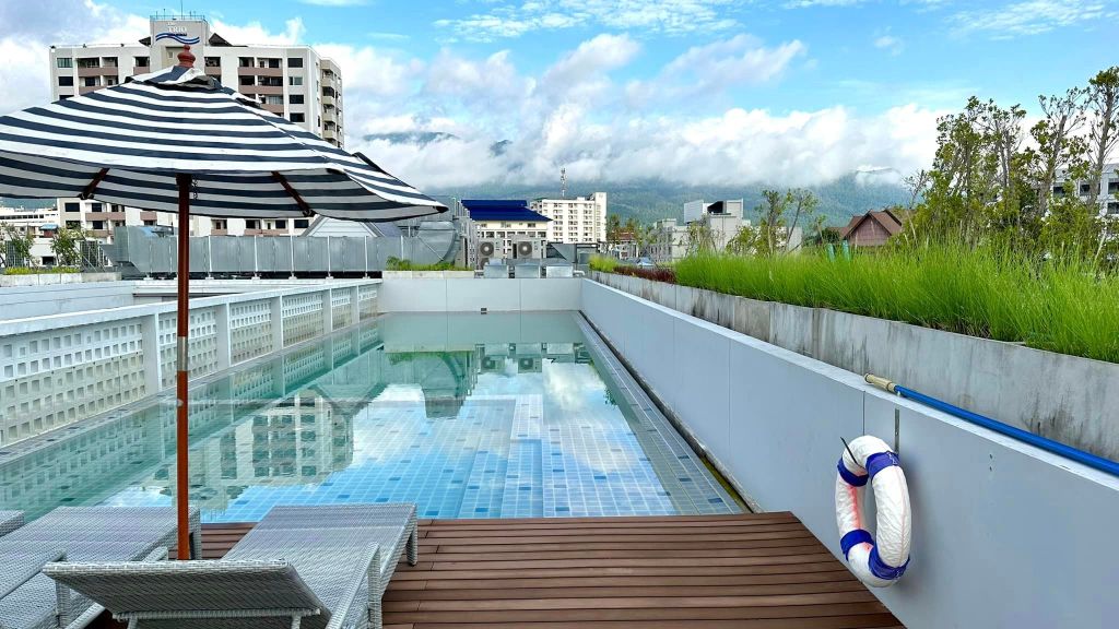 พวก Facility ต่างๆ ที่โรงแรมจะมีสระว่ายน้ำเด็กอยู่ชั้นดาดฟ้าบนสุดด้วยค่ะ ส่วนสระผู้ใหญ่ลึกแค่ 1.2 เมตรเท่านั้น แม่สบายใจ~ แล้วคือวิวสวยมากกกก เห็นยอดดอยสุเทพสวยๆระหว่างเล่นน้ำไปด้วย มีเครื่องบินขึ้นจากมุมสระว่ายน้ำอีกด้วยนะคะ ถ่ายรูปสนุกเลย ส่วนคุณพ่อที่ชอบออกกำลังกายเค้ามีห้องฟิสเนส เครื่องออกกำลังกายครบทั้ง Cardio และ Crossfit ล้ำมากๆ ถูกใจสายสุขภาพเลยค่ะ
