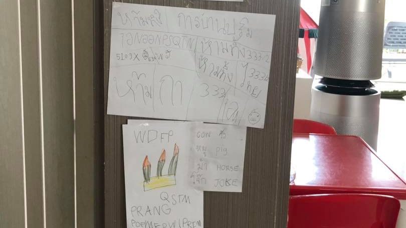 ปล. ในรูปคือบอร์ดโชว์ผลงานเต็มเลยเอามาติดที่เสานี้แทนค่ะ ช่วง 3-4 ขวบจะขยันเขียน ขยันลอกเลียนแบบตัวหนังสือ นิทานมากๆค่ะ หมดไป 3 รีมแล้วค่ะ (1 รีมมี 500 แผ่น ประมาณ 85-110 บาท)