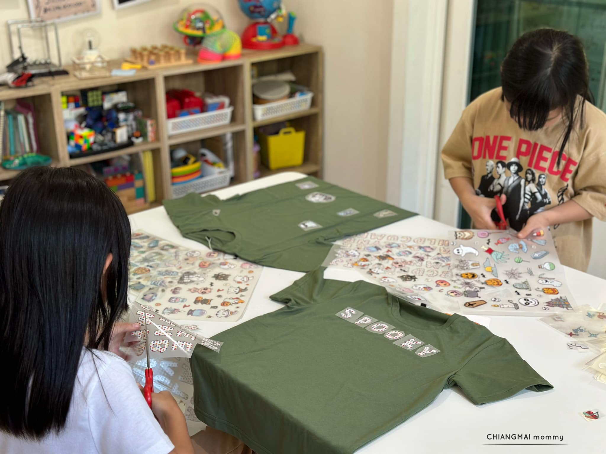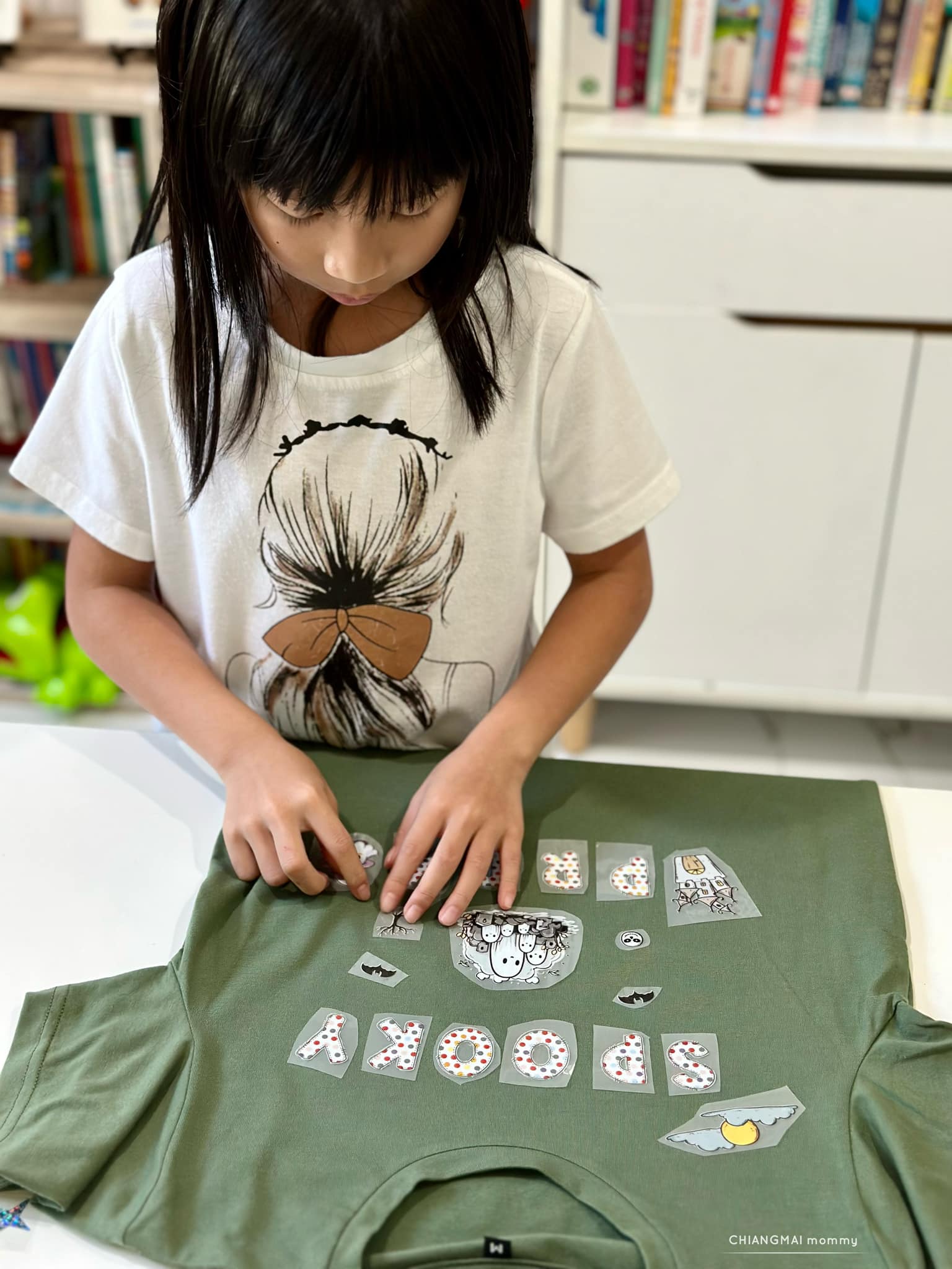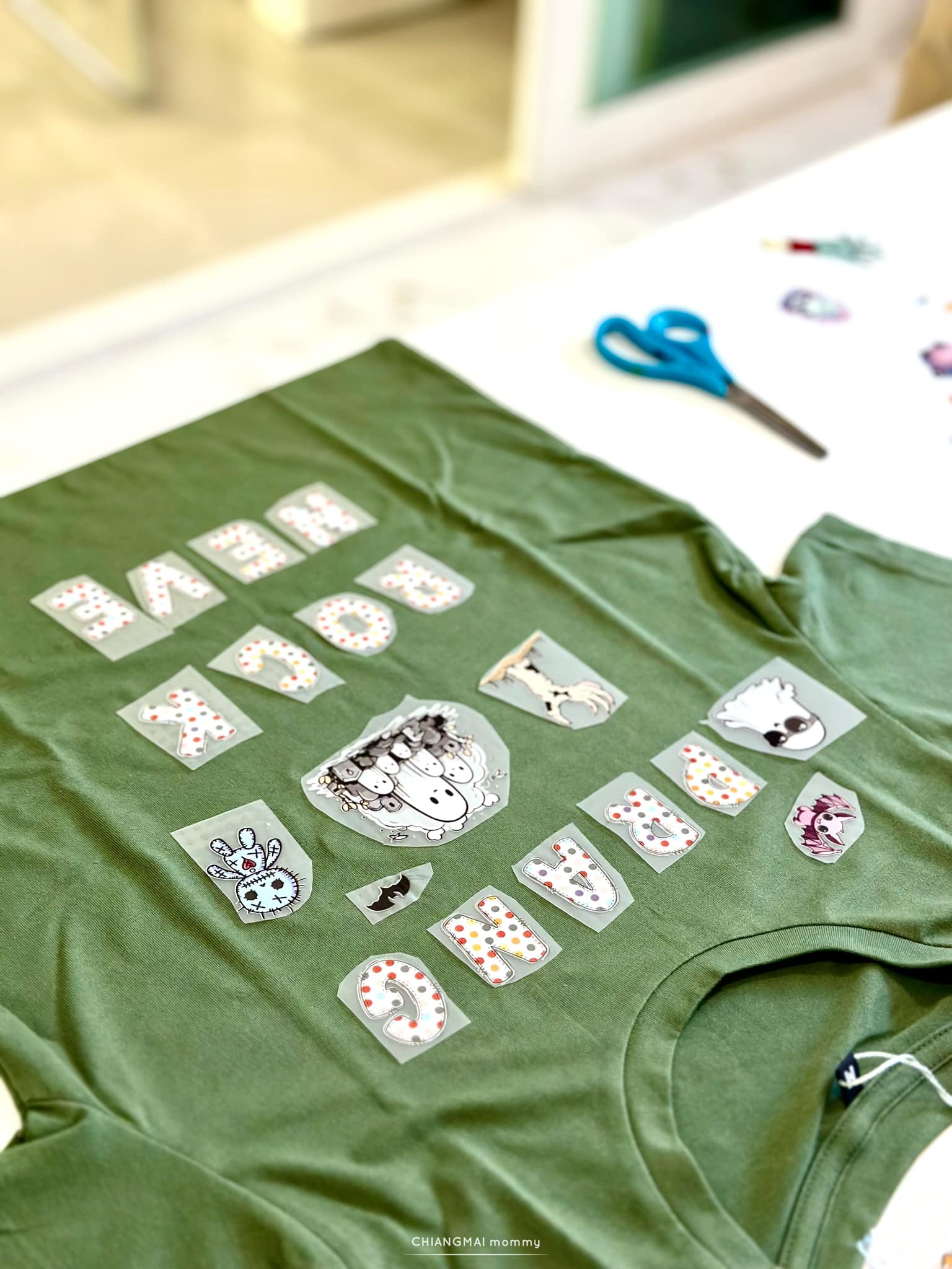 ใน Box set ที่เลือกจะเป็นธีม Halloween จะมีลายการ์ตูนน่ารักๆ มีตัวหนังสือให้ มีคู่มือวิธีการทำและชุดตัวอย่างให้ทดลองทำก่อนวางจริงด้วยค่ะ พอคิดว่าทำเป็นแล้วก็ถึงเวลาลุย!! แม่ก็เอาที่ลูกชอบเลยแต่งตามจินตนาการ ทำออกมาแล้วลูกภูมิใจในเสื้อตัวเองมากสวย Unique มีแค่หนึ่งเดียวในโลก ใส่สบายและสวยดูดีเลย